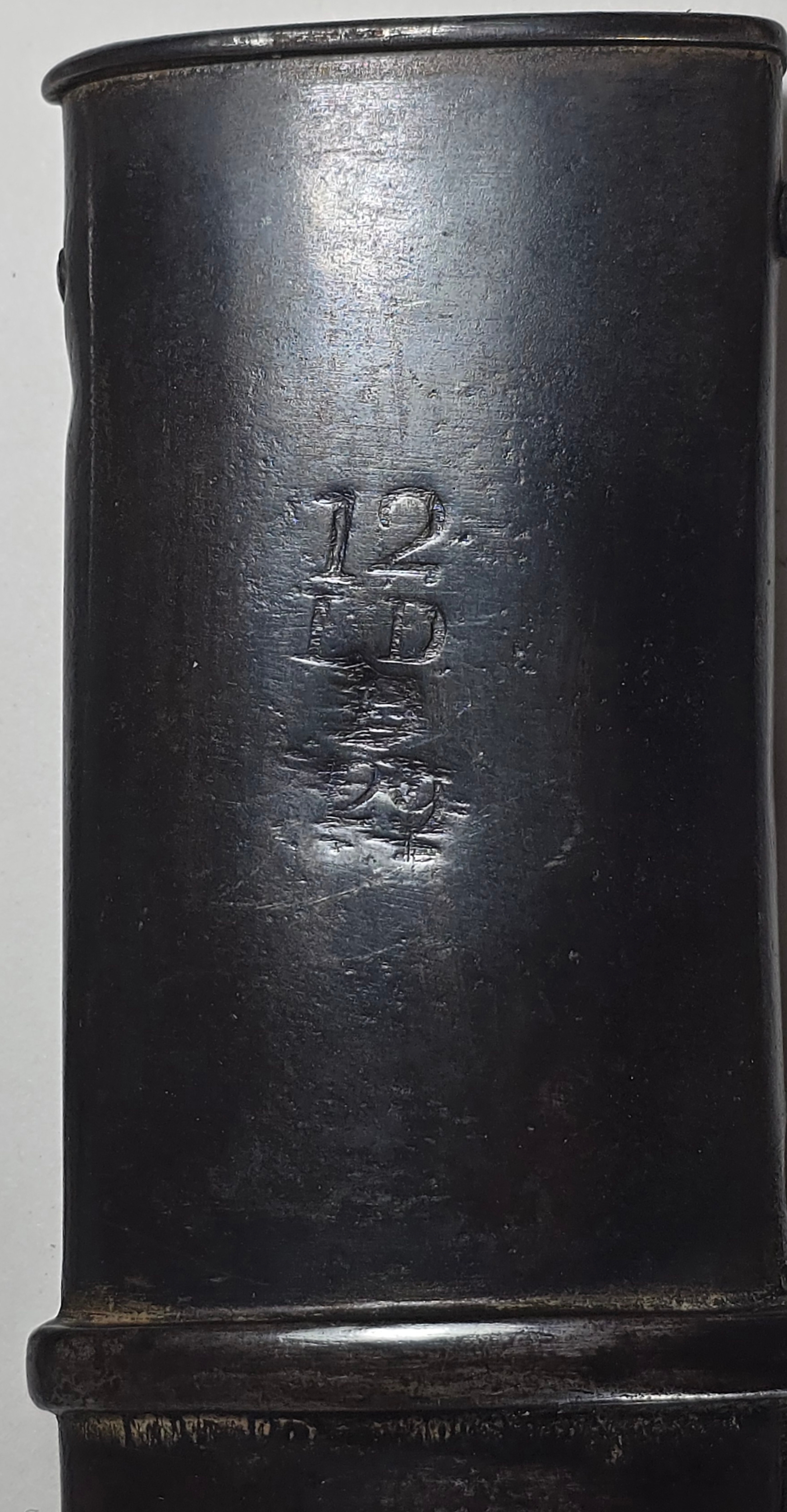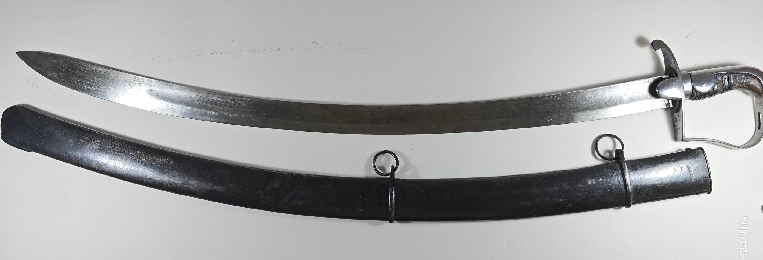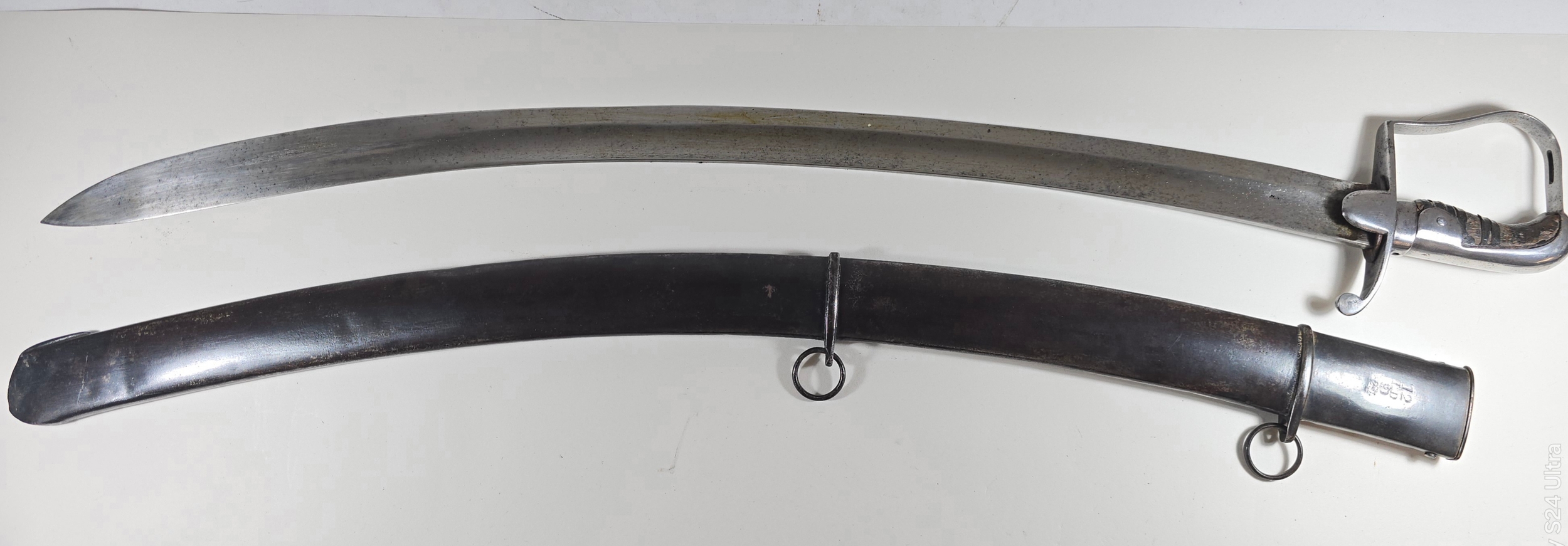 Scarce 1796 pattern cavalry trooper's sword marked for the 2nd Troop of the Royal Life Guards and the 12th Light Dragoons, regulation curved single edge blade 81cms cut with a single broad fuller stamped with crowned 4 government inspector's mark, back edge signed DAWES, regulation iron stirrup hilt deeply carved 12 LD K 11 above the quillon, and T2 RL G 29 beneath guard, iron grip strap, wooden grip (leather covering now mostly missing), in its iron scabbard stamped at the top OSBORN & GU(NBY) BIR(Mm) and deeply stamped with 12 LD D 29 (the last 2 erased) Good condition, some age wear overall.