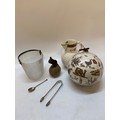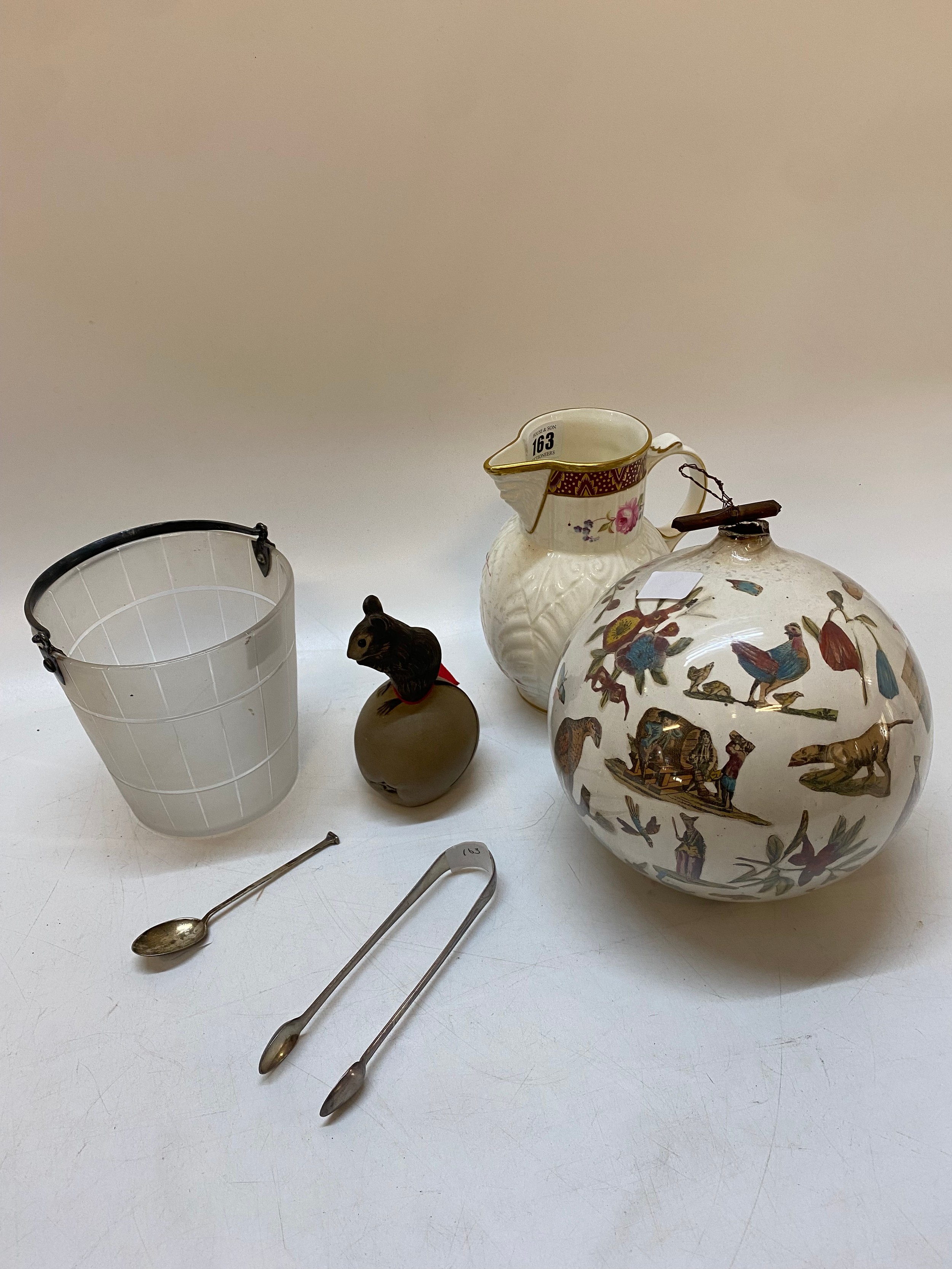 A Coalport Caughley Mask Head jug -7in. high, a pottery hanging decoration with transfer decoration of figures, birds, moths and animals, a Poole Pottery stoneware model of a mouse on an apple, a frosted glass ice bucket with plated mounts, a pair of Georgian silver tongs and a silver teaspoon
