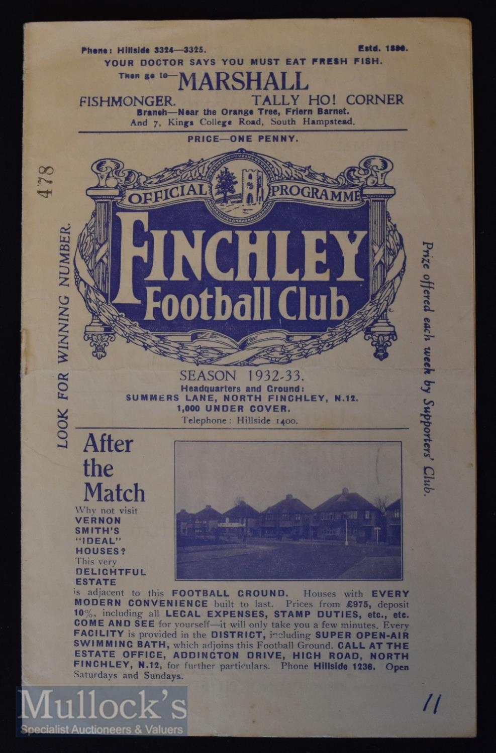 1932/33 Finchley v Bromley, London Senior Cup match programme 28 January, fair condition.
