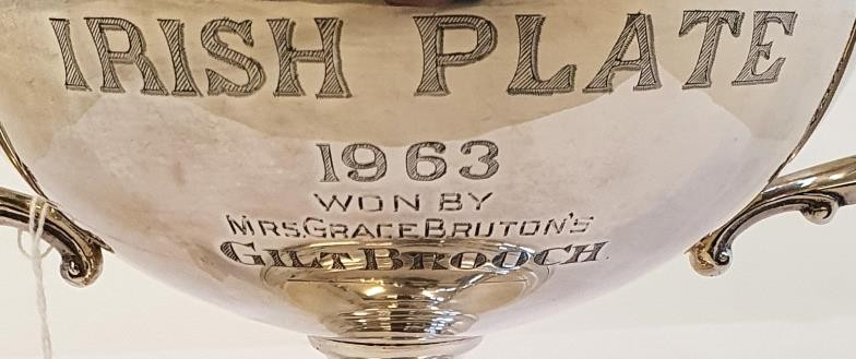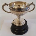 Substantial Celtic Pattern Irish Silver Trophy Cup "Irish Plate 1963 Won By Gilt Brooch" on a stepped and ebonised pedestal. Hallmarked Dublin c.1962 by Alwright & Marshall Ltd. c.610grams, Cup c.20cm tall plus pedestal