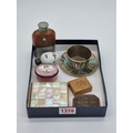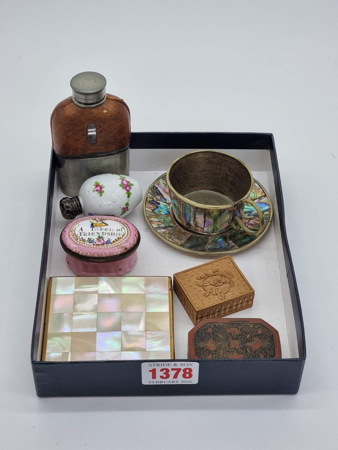 A mixed lot, to include: an 18th century English enamel patch box, 5cm wide. (7)