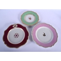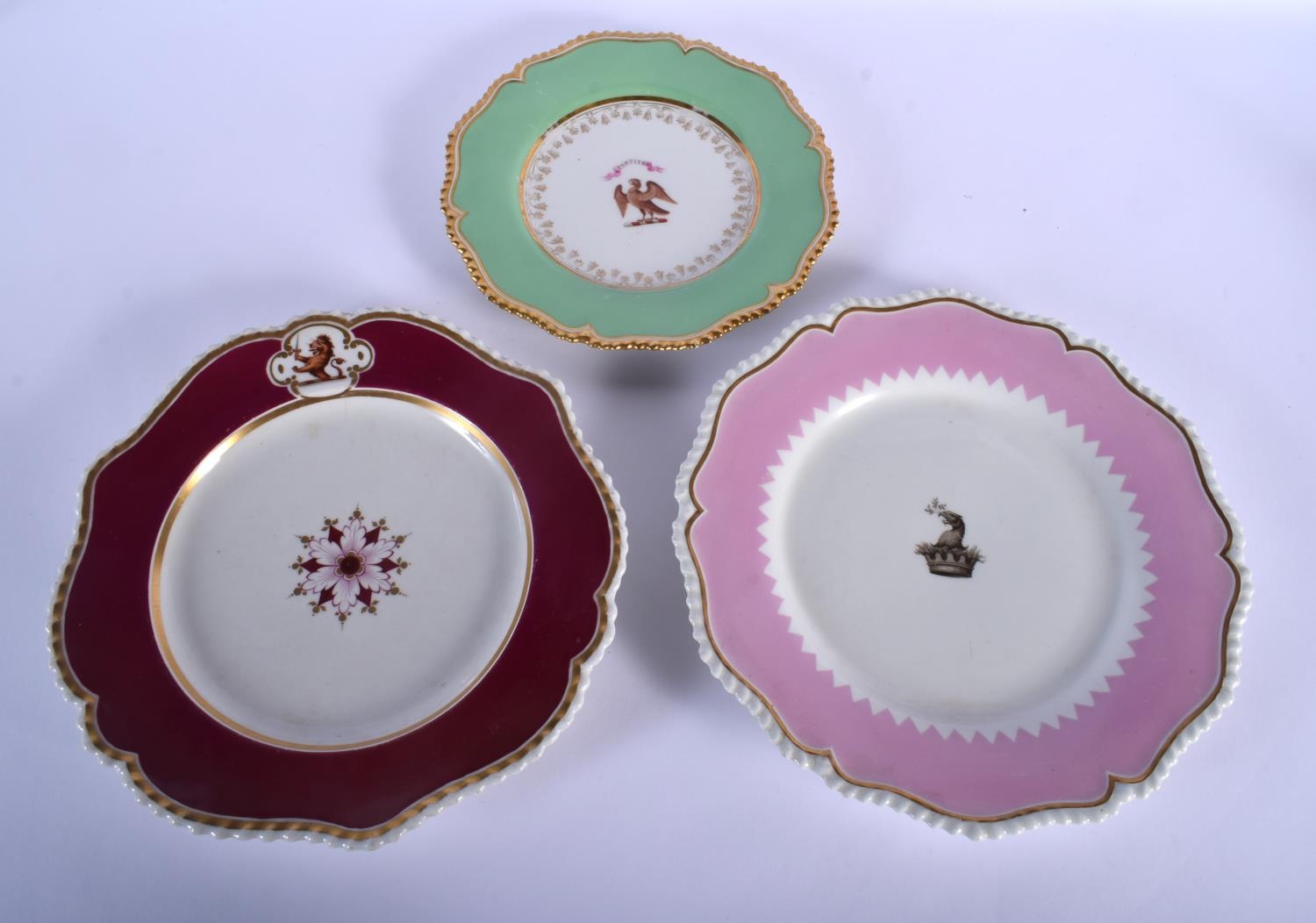 EARLY 19TH C. FLIGHT BARR AND BARR GREEN BORDERED PLATE WITH CREST AND MOTTO, A FBB PINK BORDERED PLATE WITH CREST OF HAWK AND CROWN AND A CHAMBERLAIN PLATE WITH CRIMSON BORDER AND A LION CREST. Plates 17cm diameter (3)