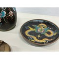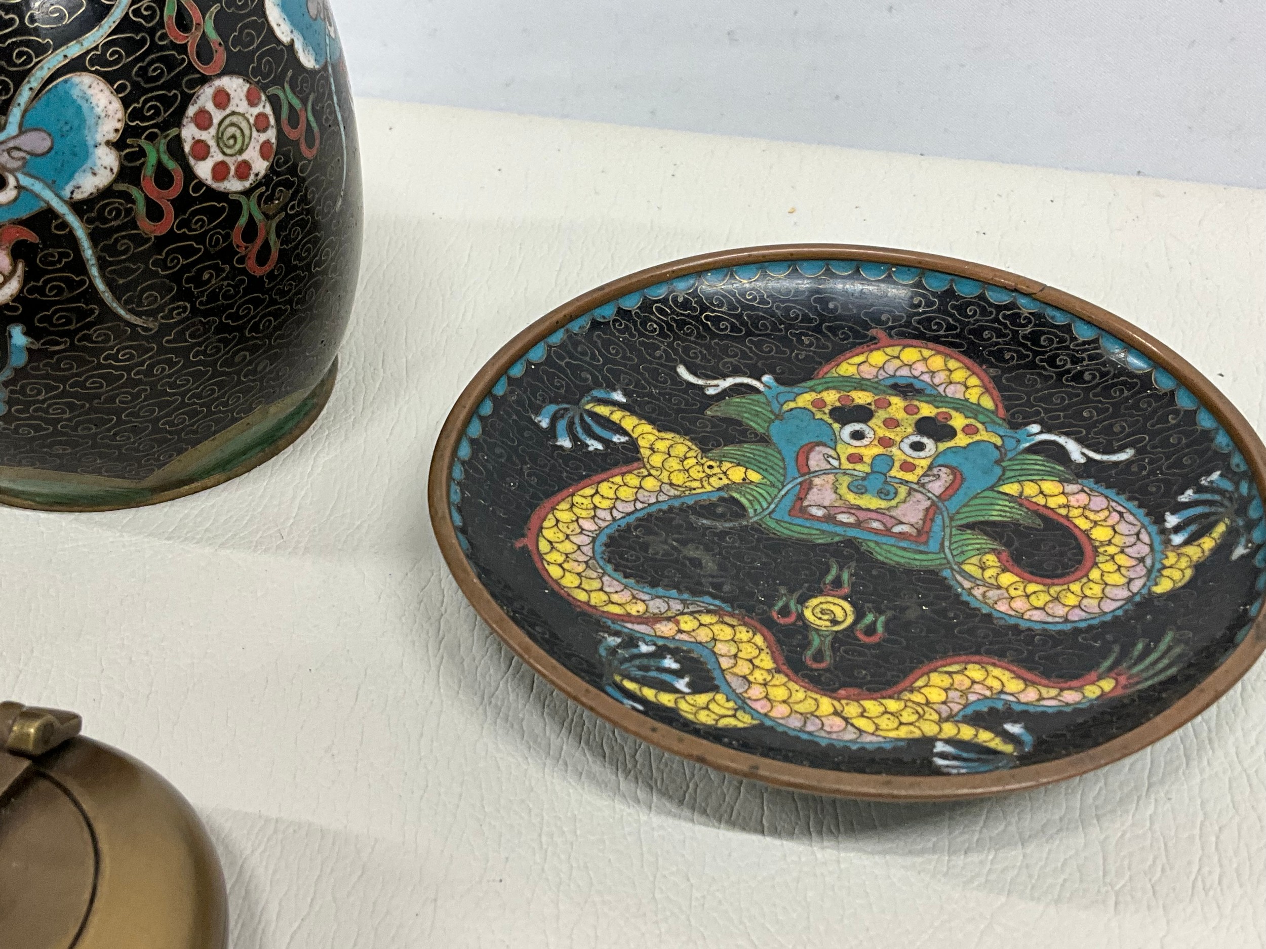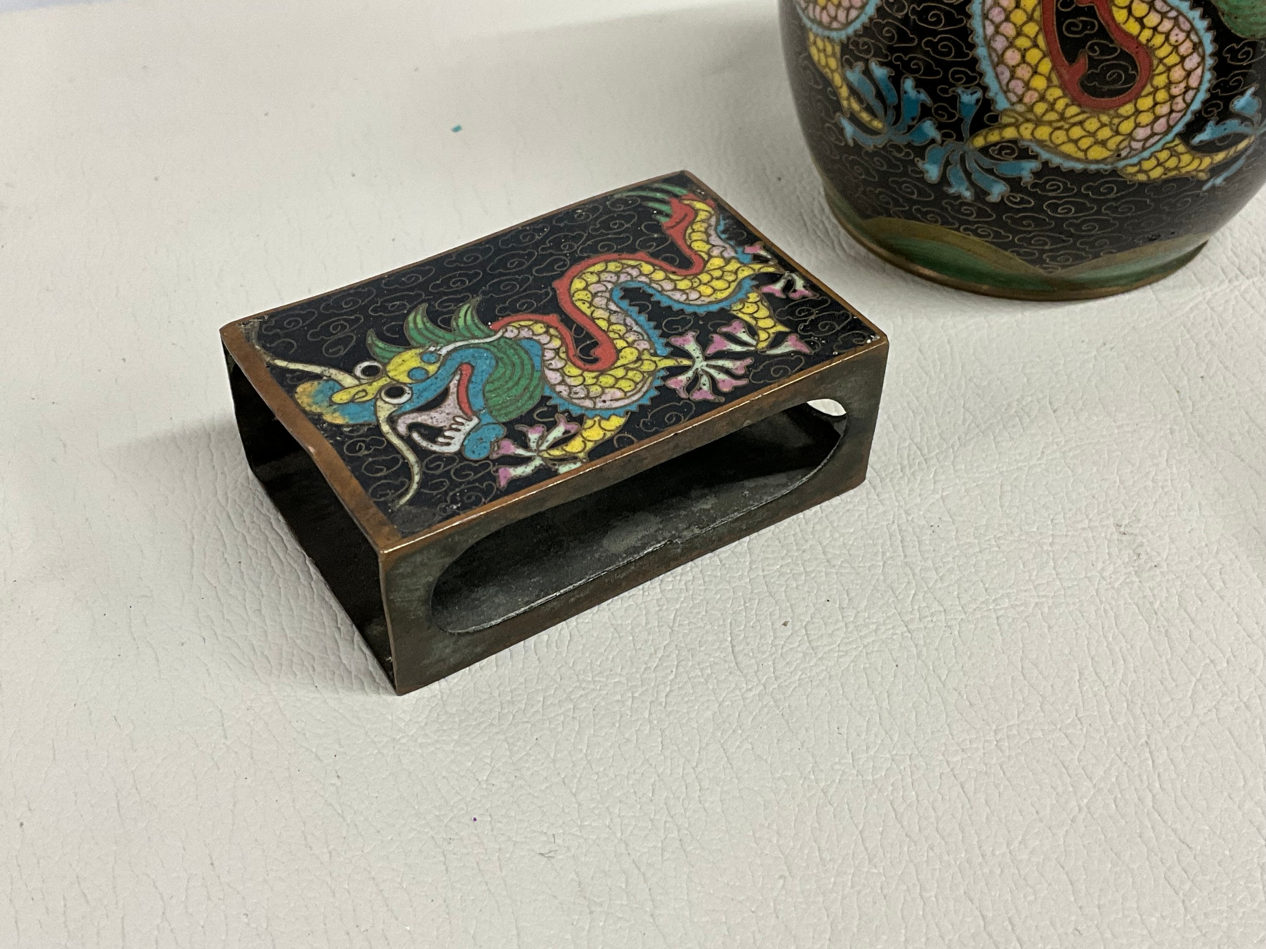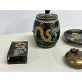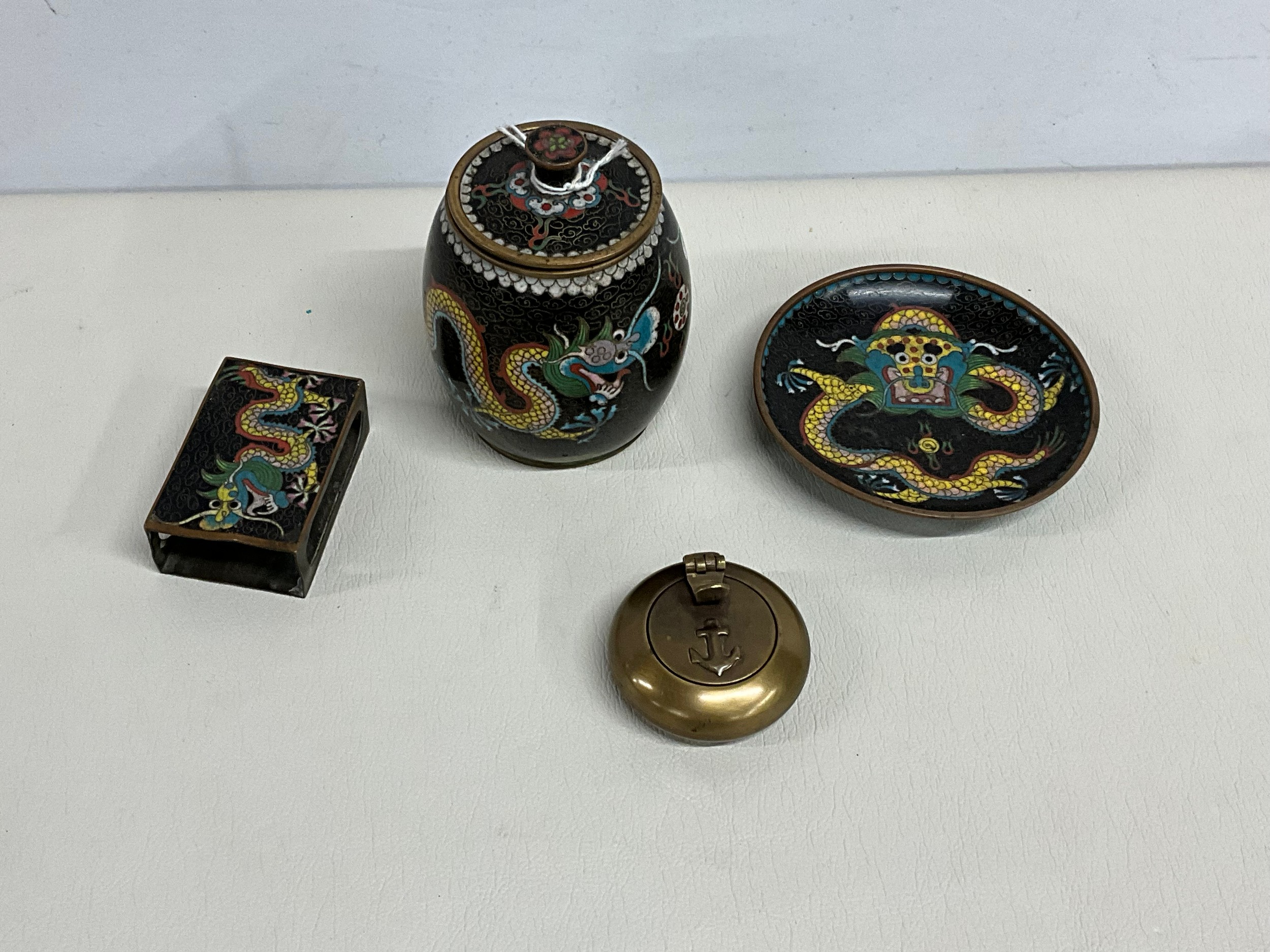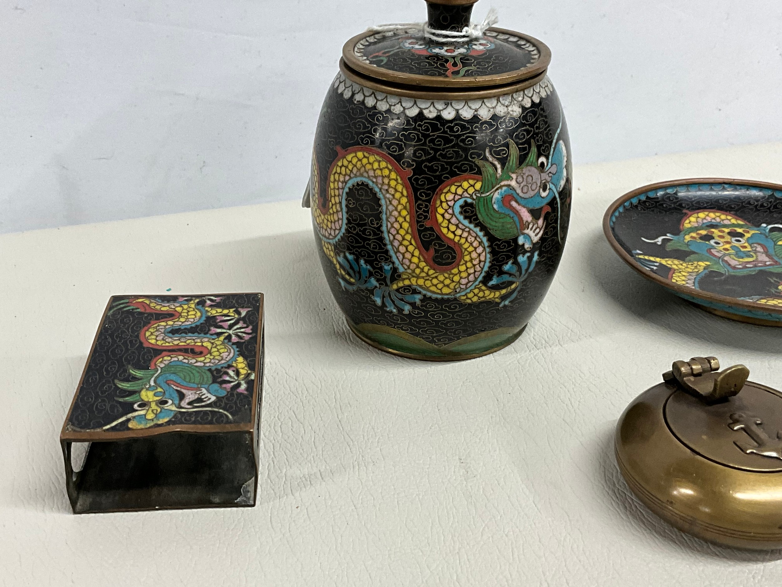 COLLECTION OF VINTAGE CLOISONNE WARE TO INCLUDE MATCHBOX HOLDER, ASHTRAY AND TOBACCO JAR AND BRASS ASHTRAY
