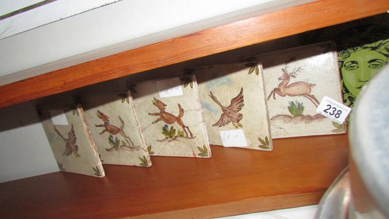 Five ceramic tiles depicting deer and one other.