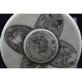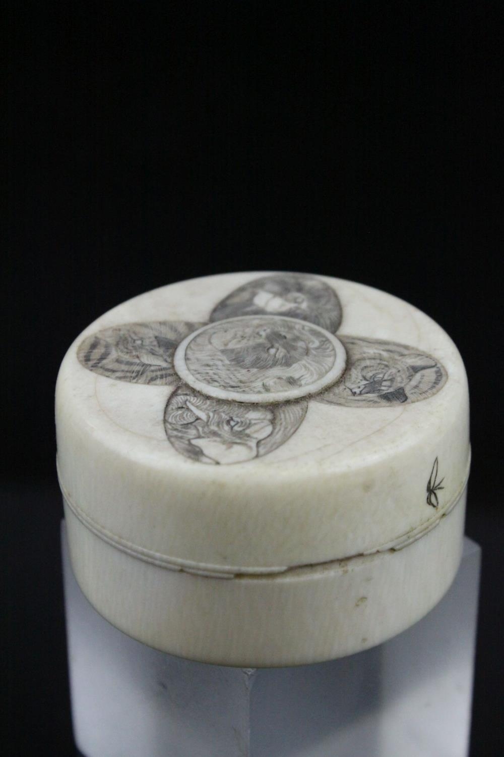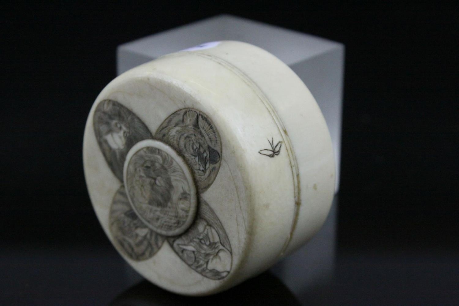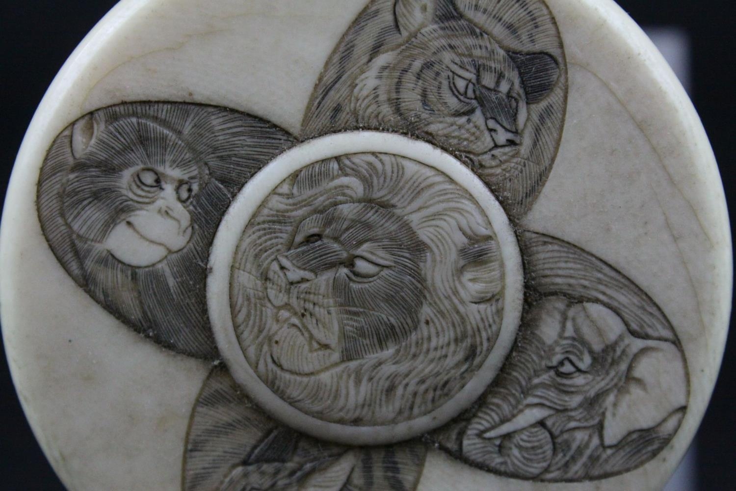 Japanese Meiji Period Circular Ivory Box and Lid, the lid with carved and ink panels depiction animals including Lion, Elephant, Monkey & Tiger, 6.5cms wide x 4cms high