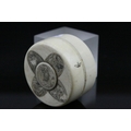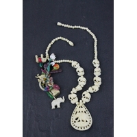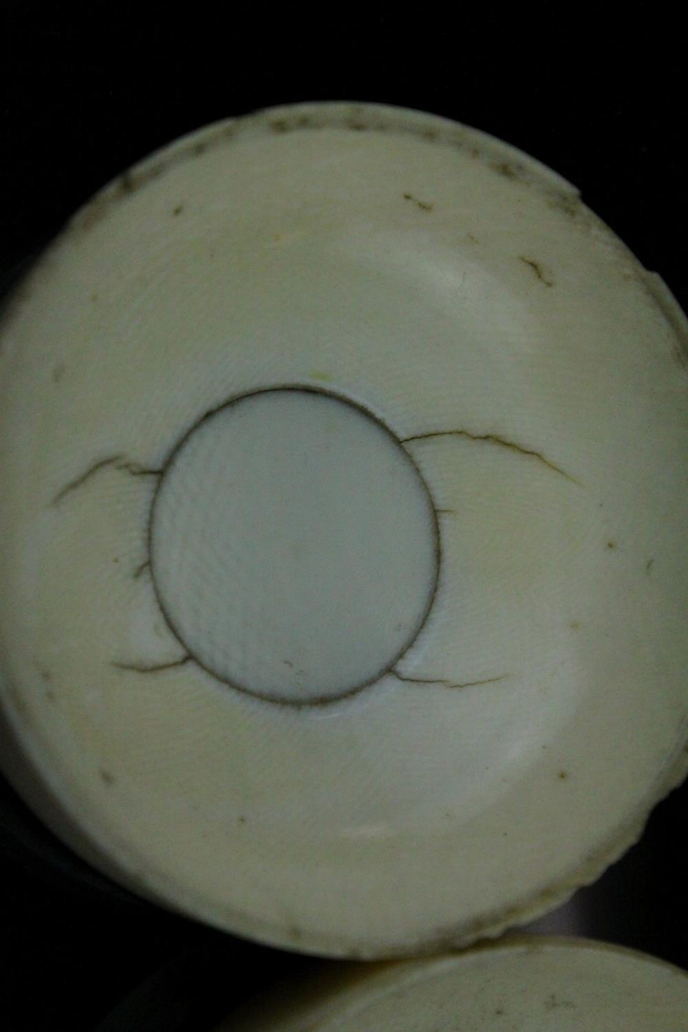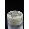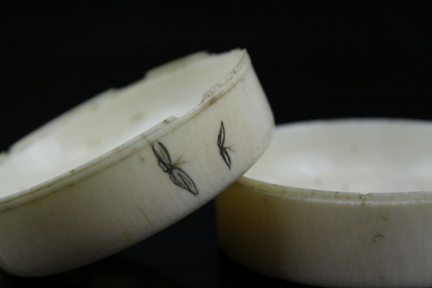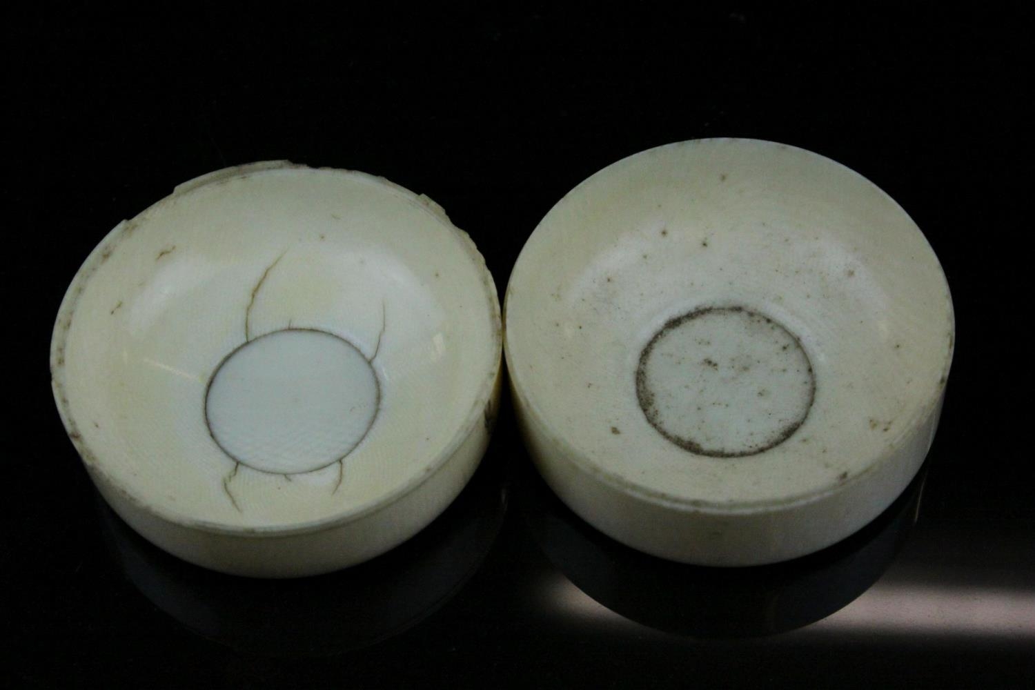 Japanese Meiji Period Circular Ivory Box and Lid, the lid with carved and ink panels depiction animals including Lion, Elephant, Monkey & Tiger, 6.5cms wide x 4cms high