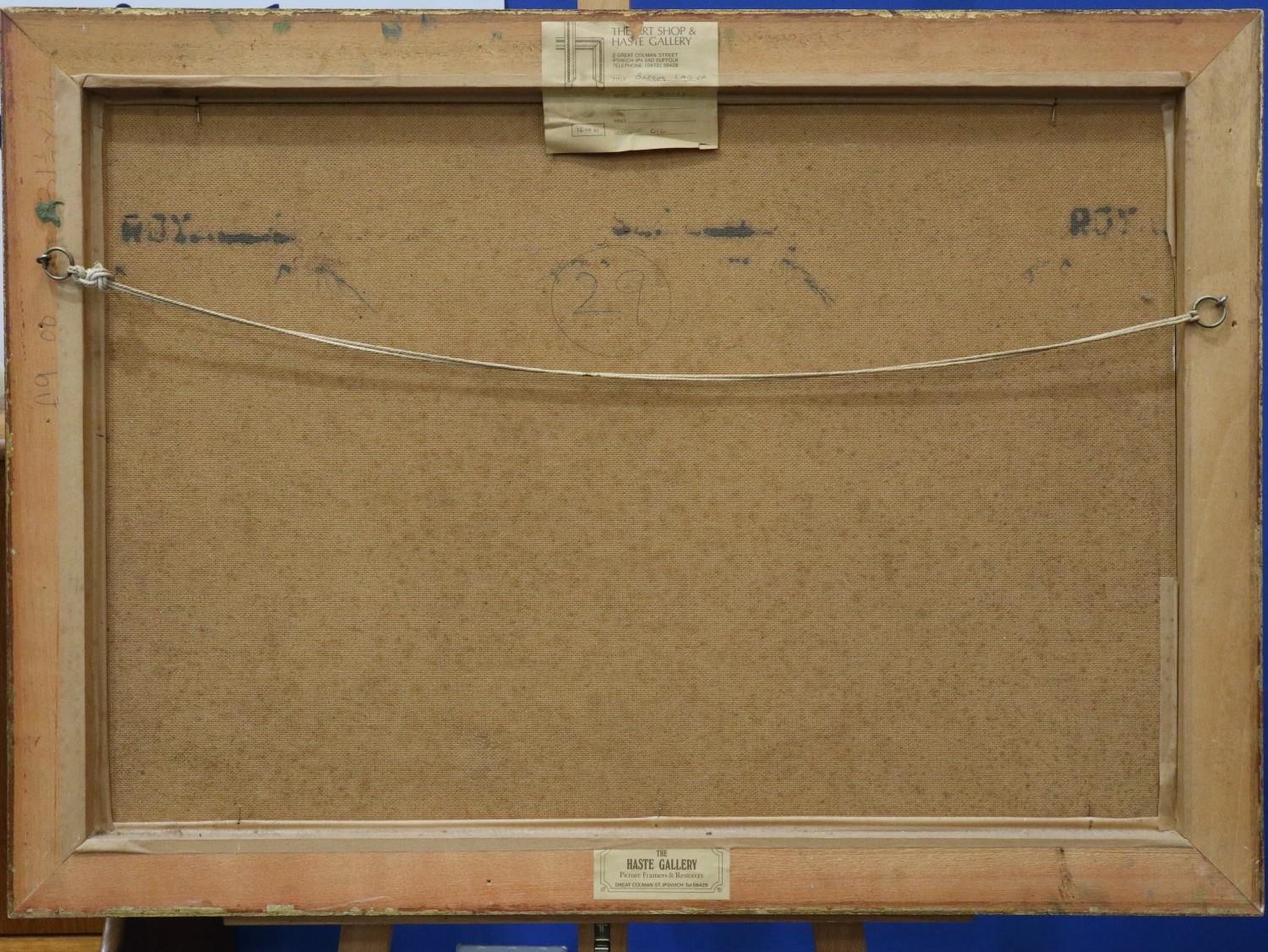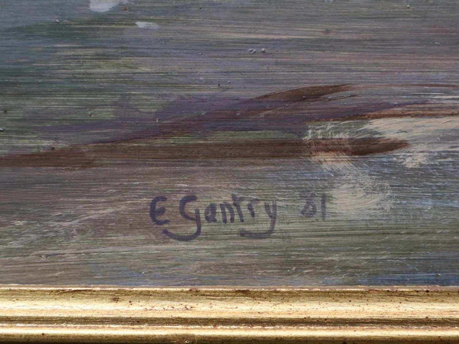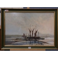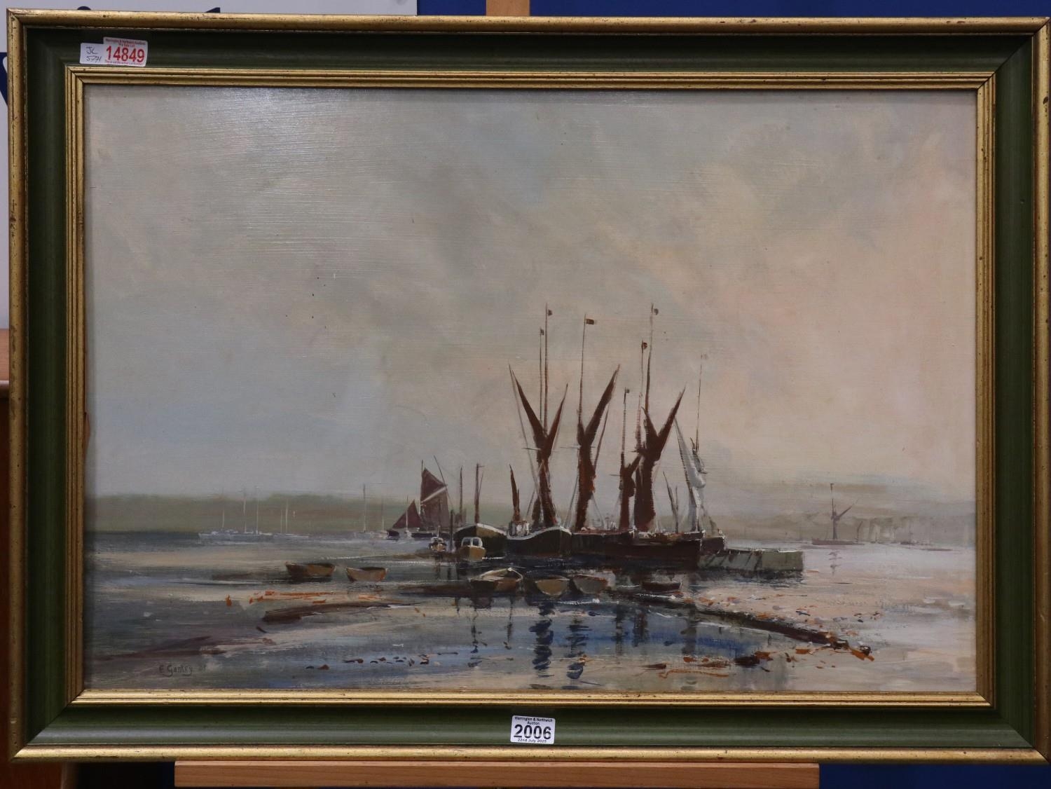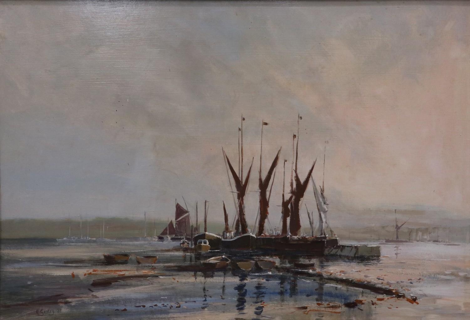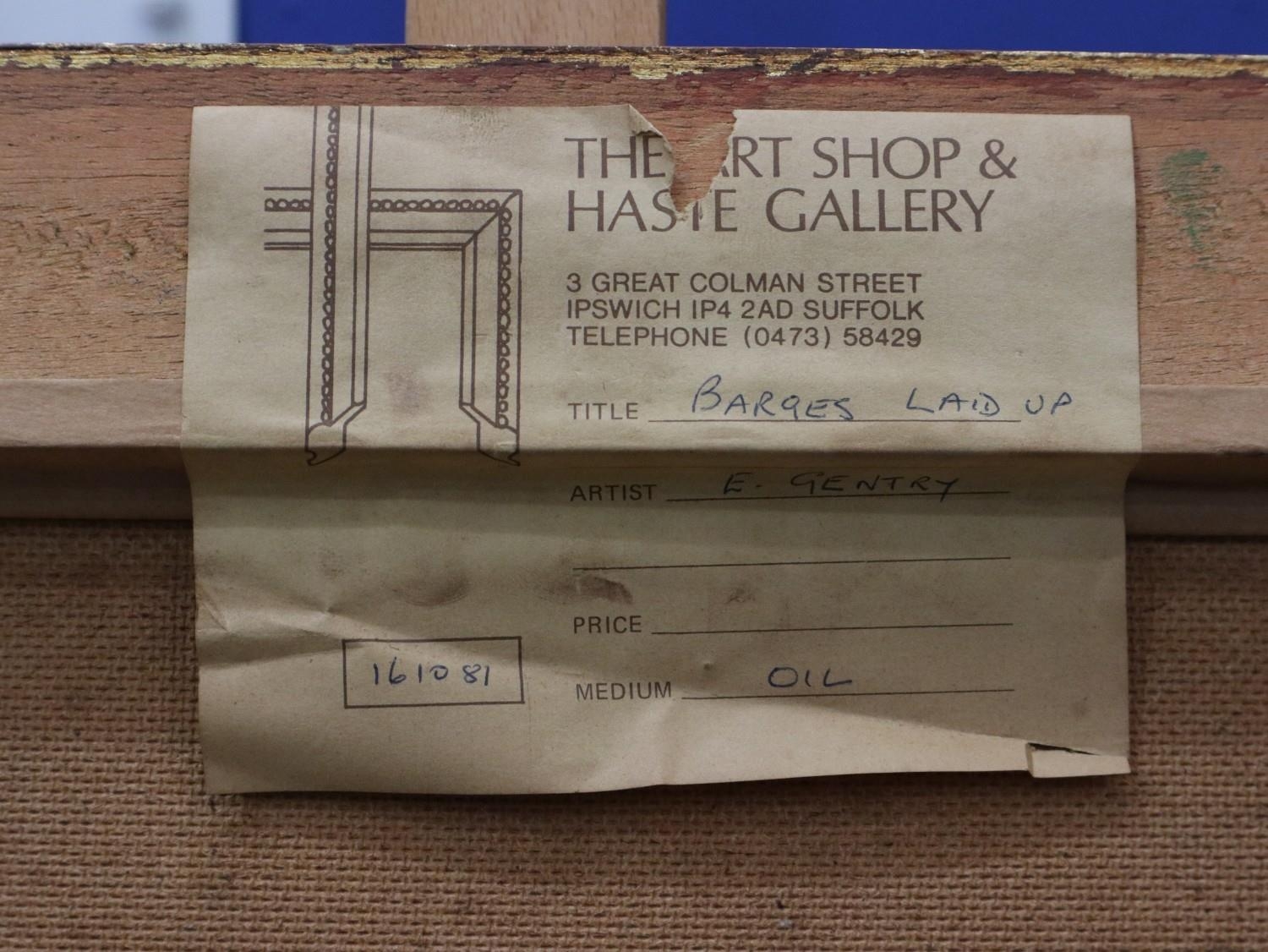 Edward Gentry (b.1943): oil on board, 'Barges Laid Up', dated '81, image 79 x 53cm, overall 92 x 67cm. Not available for in-house P&P
