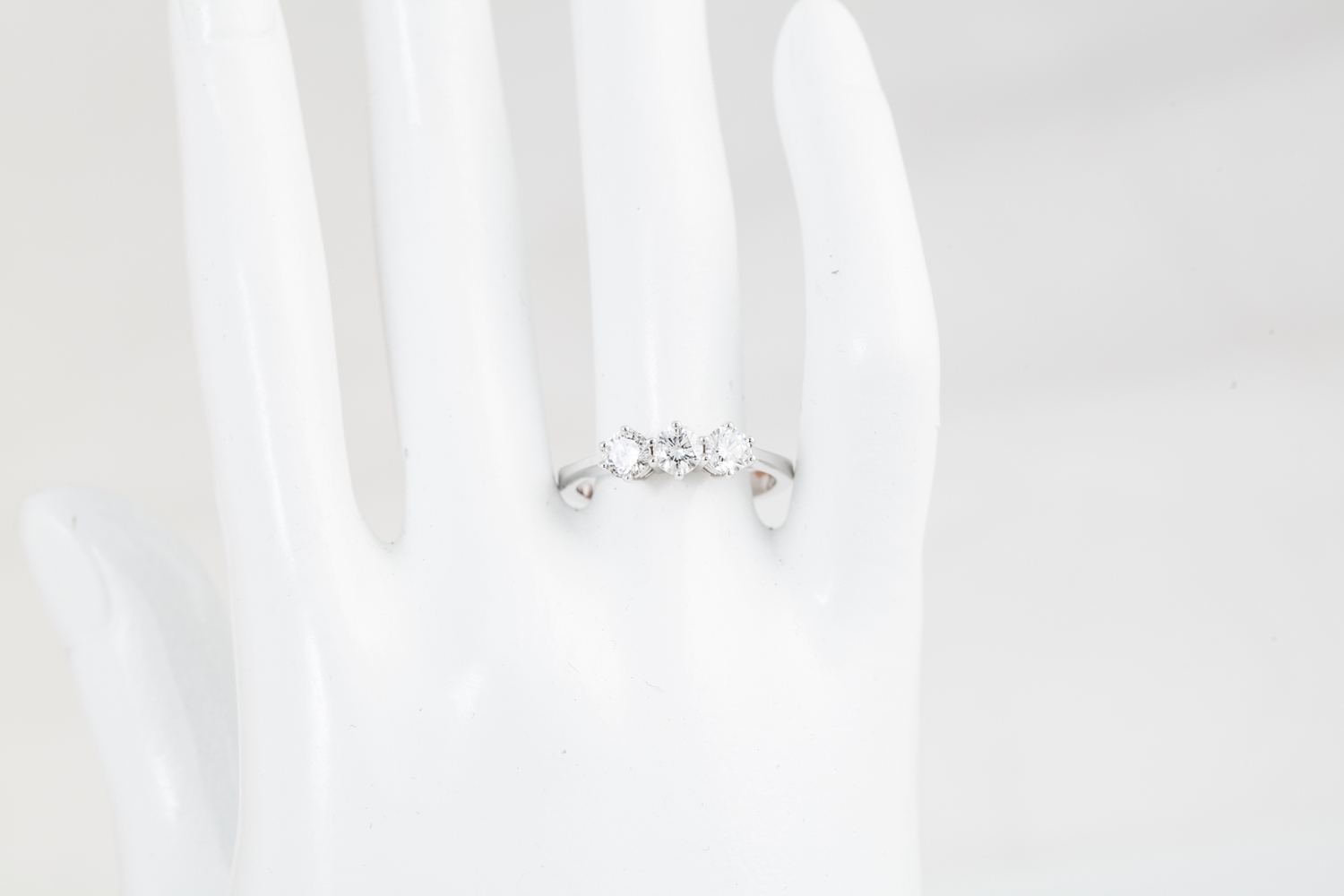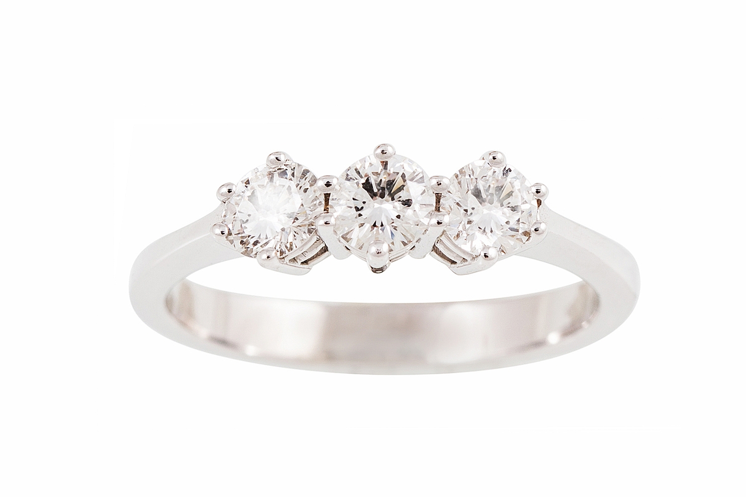 A THREE STONE DIAMOND RING, the brilliant cut diamonds mounted in 18ct white gold. Estimated; weight of diamonds; 0.98 ct, colour and clarity; J, SI2, size Q