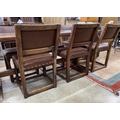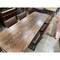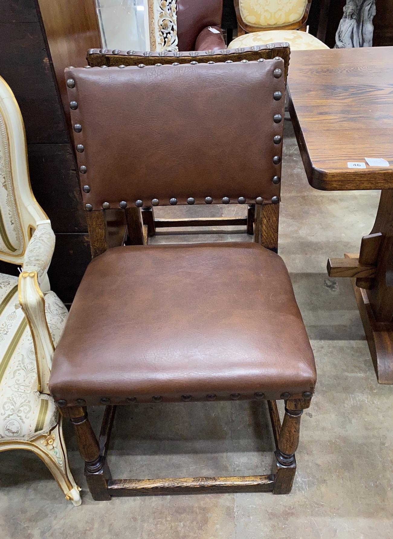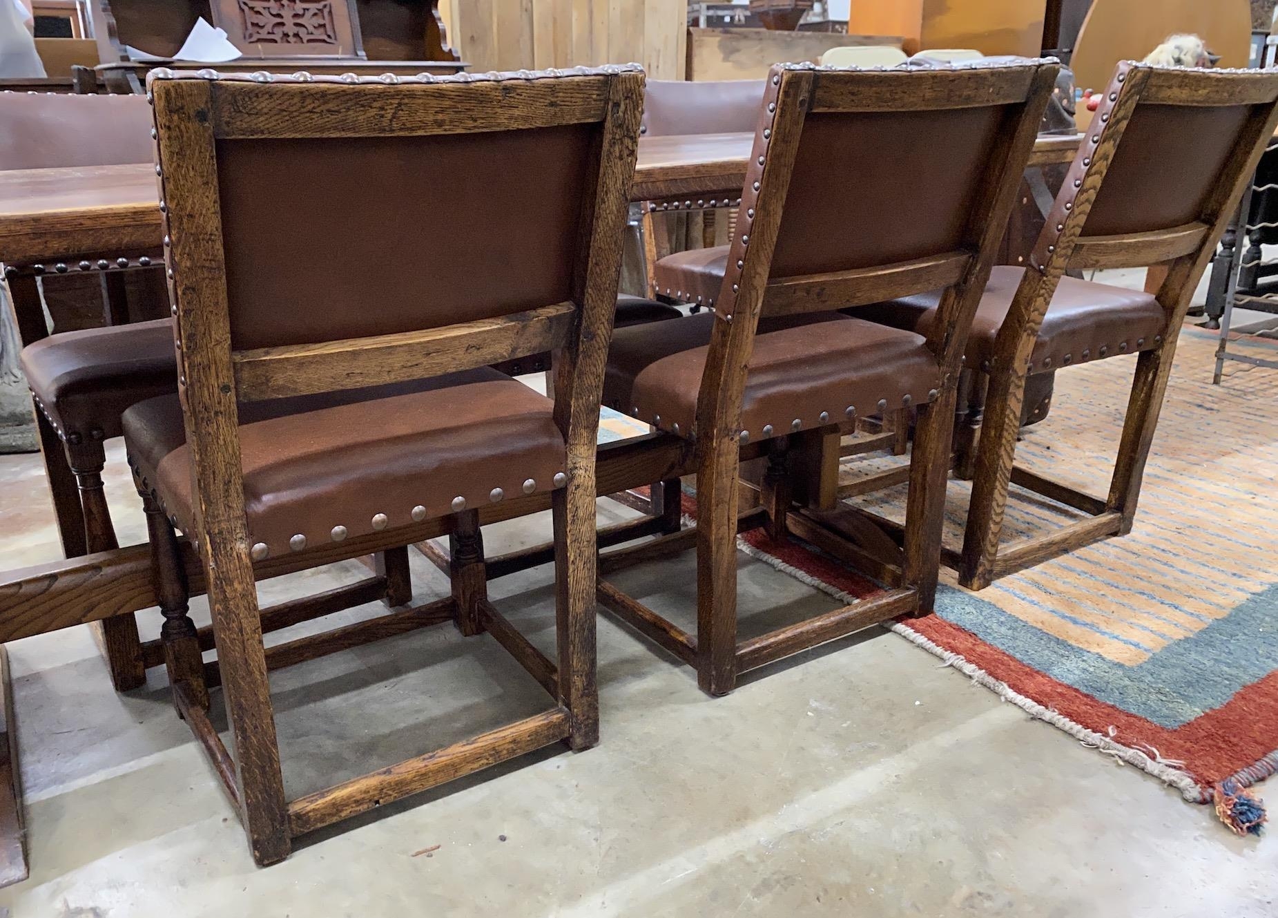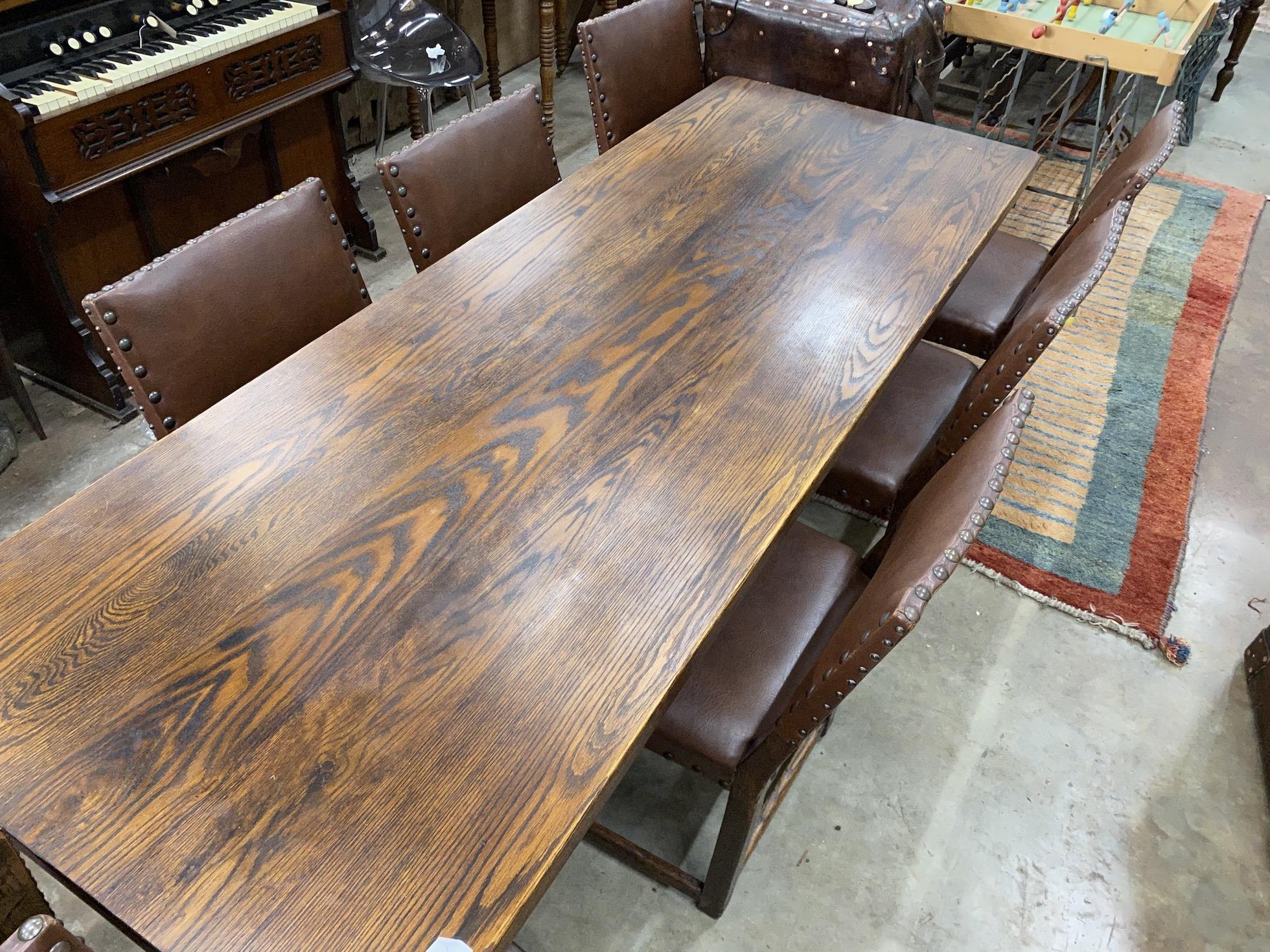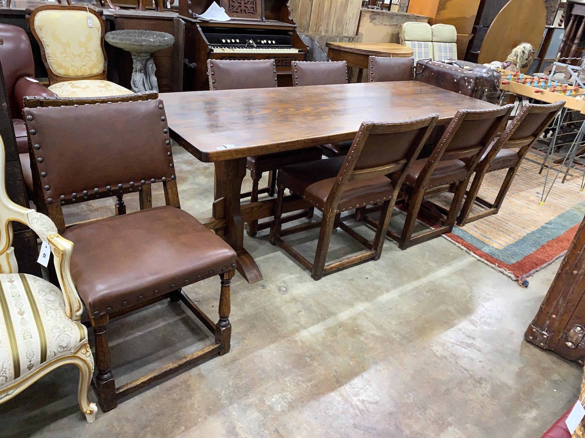 An 18th century style rectangular oak refectory dining table, length 214cm, depth 78cm, height 75cm together with a set of eight oak dining chairs