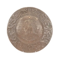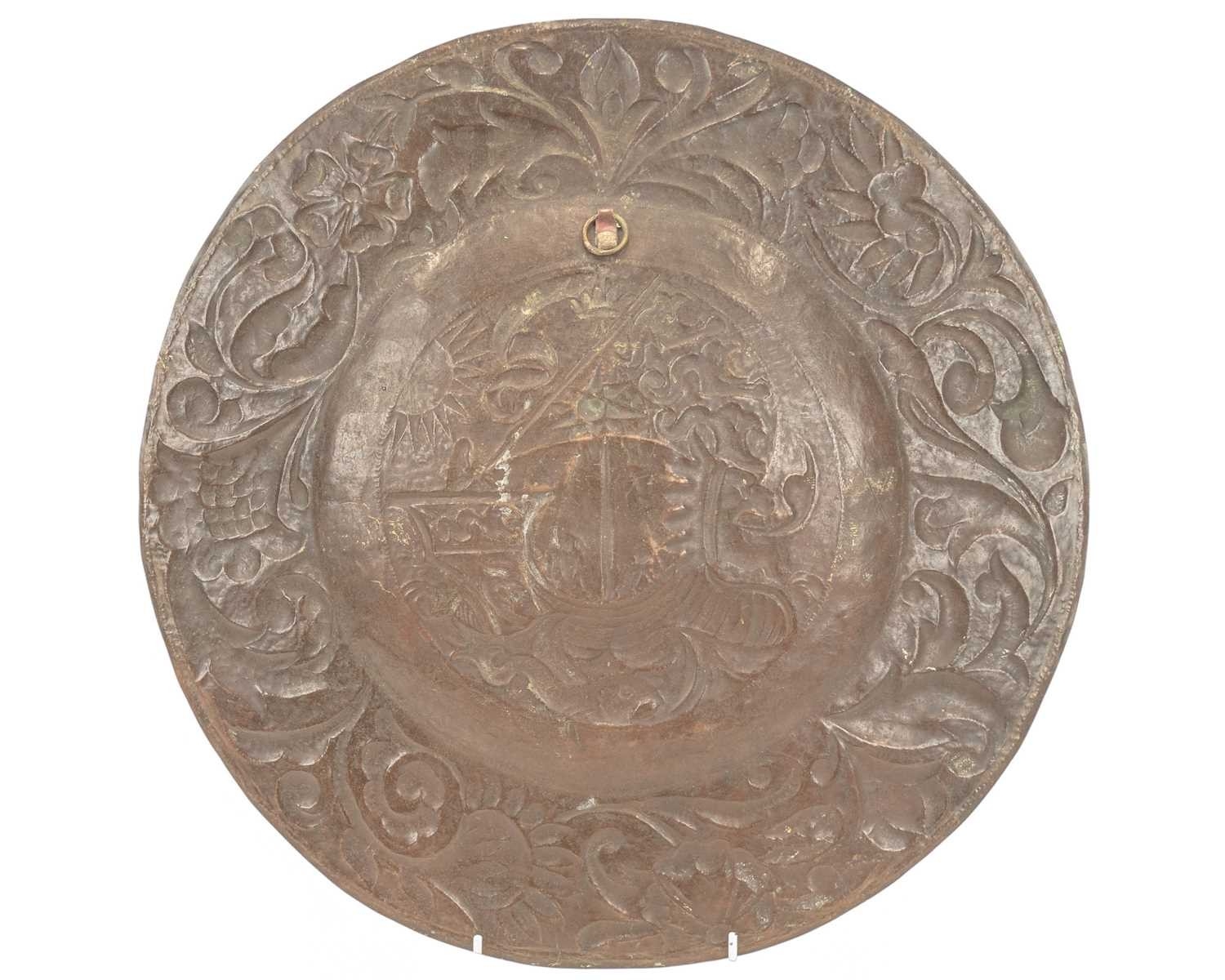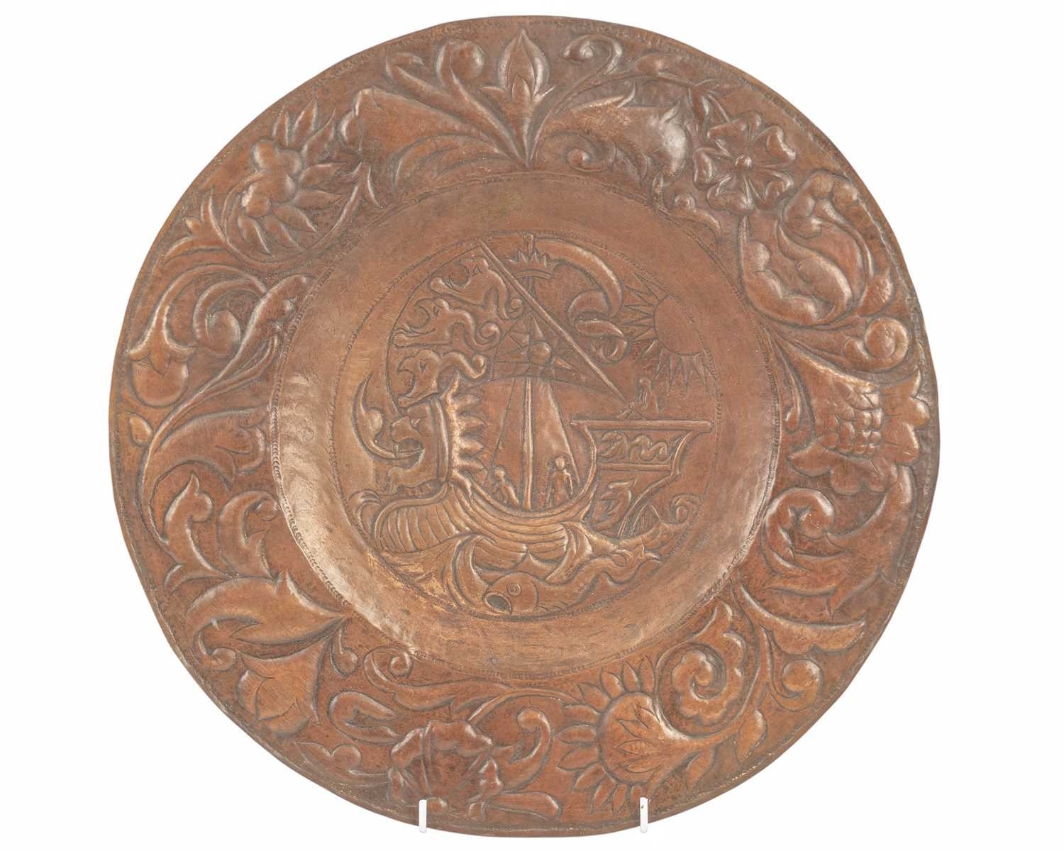 An Arts and Crafts copper charger, John Pearson style. The central well repousse decorated with a galleon, with crowned lion mask bow and sun motif, within a flower decorated border, diameter 38.5cm.