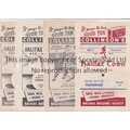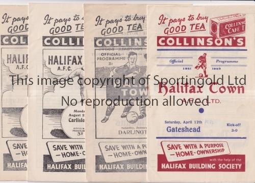 HALIFAX TOWN Nine home programmes v Gateshead 12/4/52, Darlington 9/1/54, Carlisle 22/8/55, Scunthorpe 28/4/56, Stockport County 14/9/57 and 4 X 58/59 season v Stockport, Colchester, Brentford and Southend. Minor faults. Generally good