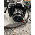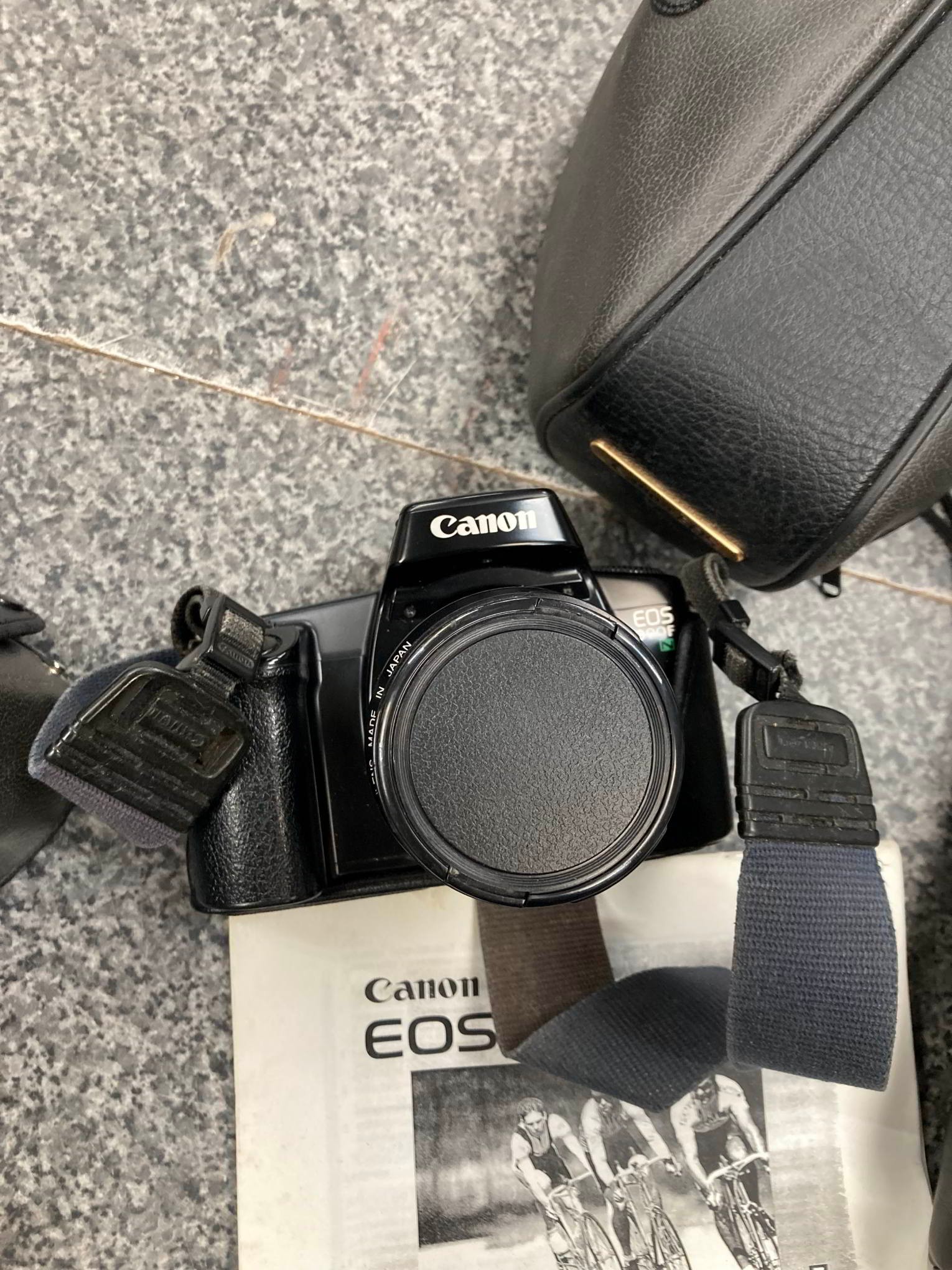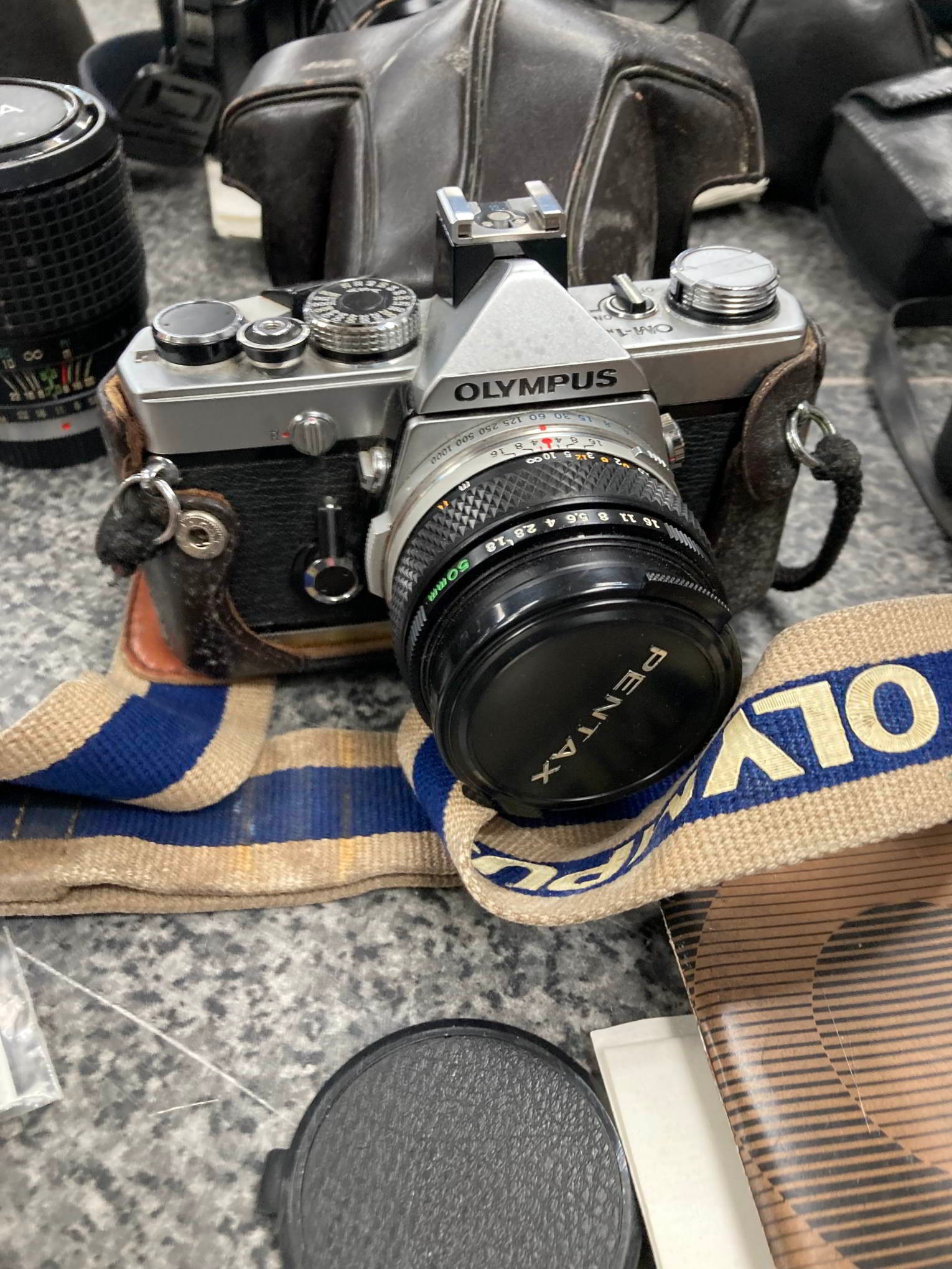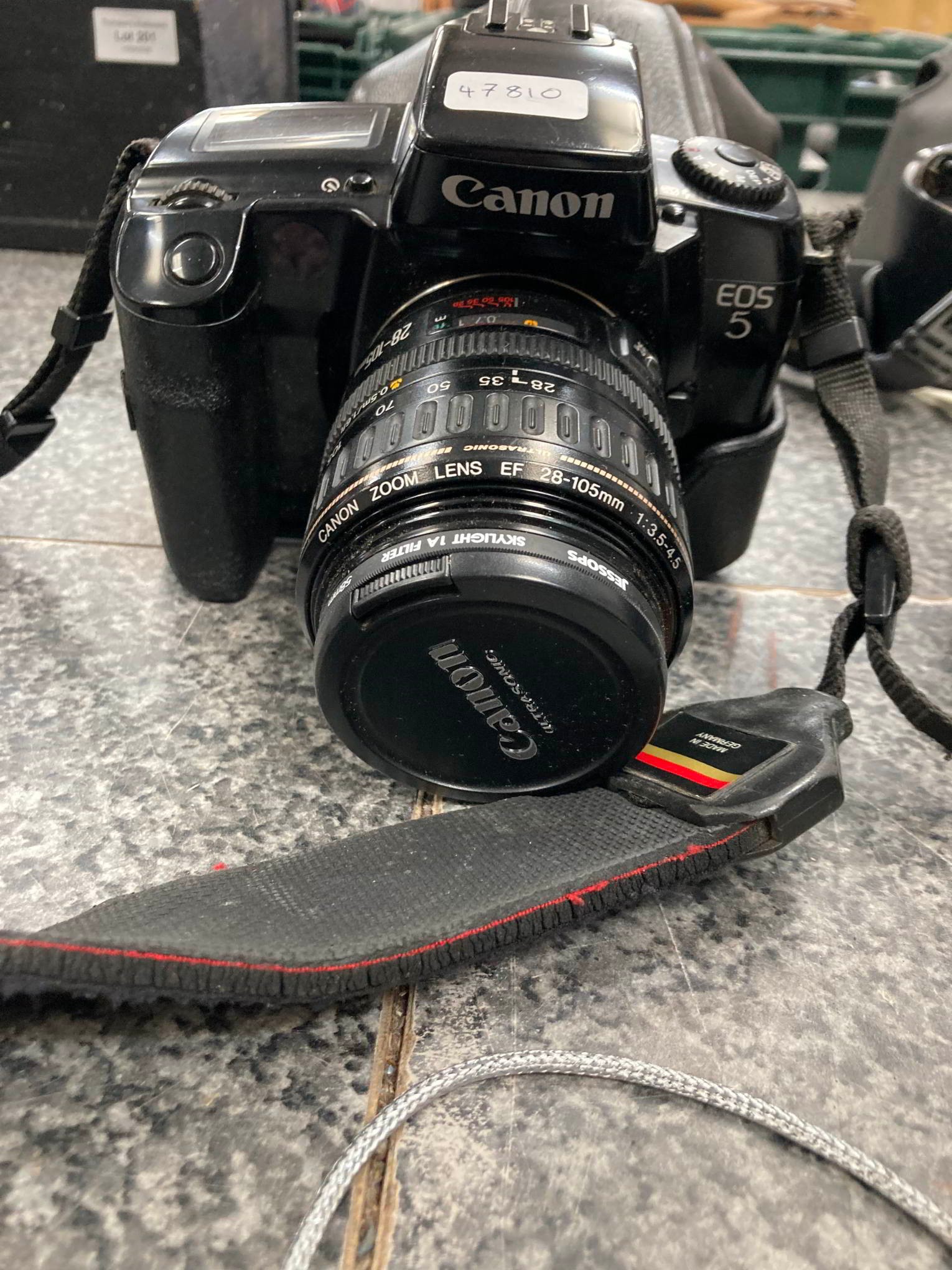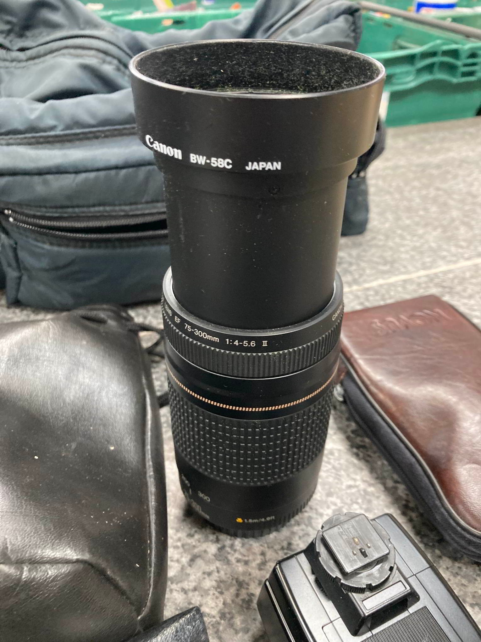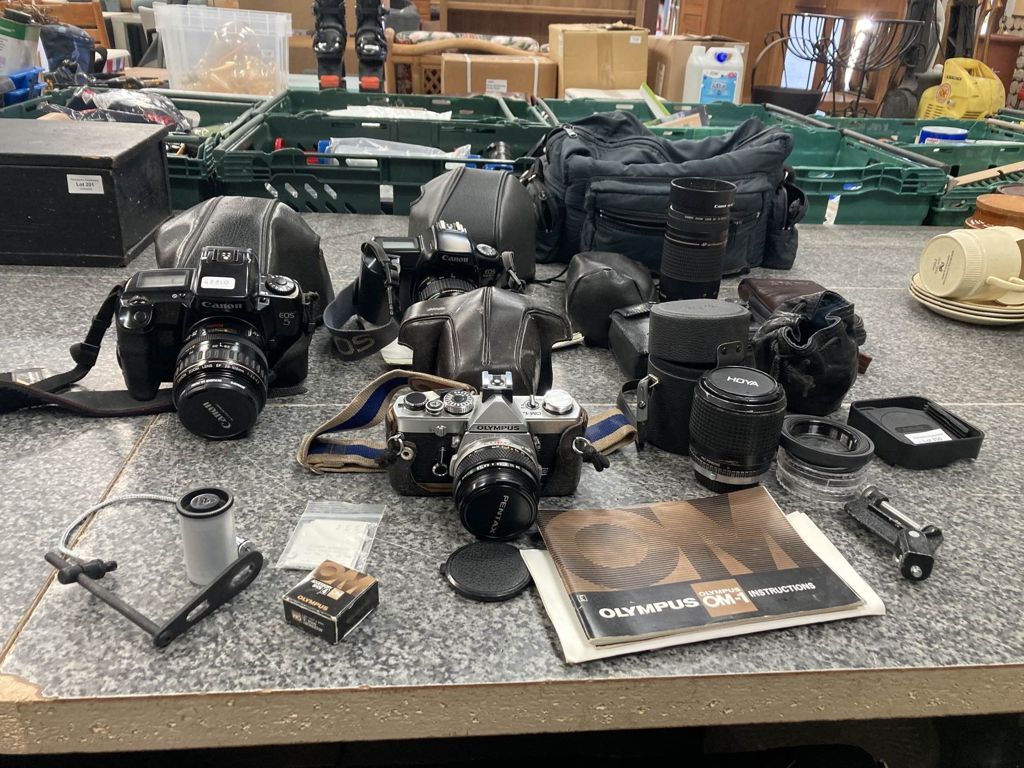 Cameras & camera accessories inc. Canon EOS 5 with Canon zoom 28-105mm lens, Canon EOS 1000F N with 35-105mm lens, Olympus OM-1 camera, Canon 75-300mm lens, Hoya 38-70mm lens etc. (unchecked - sold as seen)