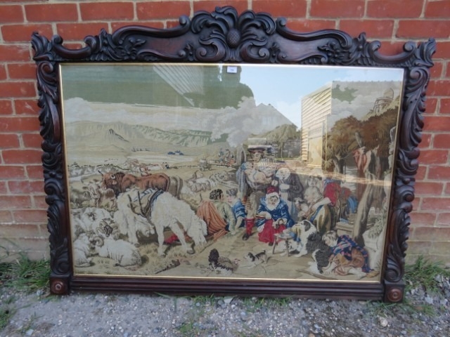 A Victorian tapestry within a carved rosewood frame. H124cm x W158cm approx.