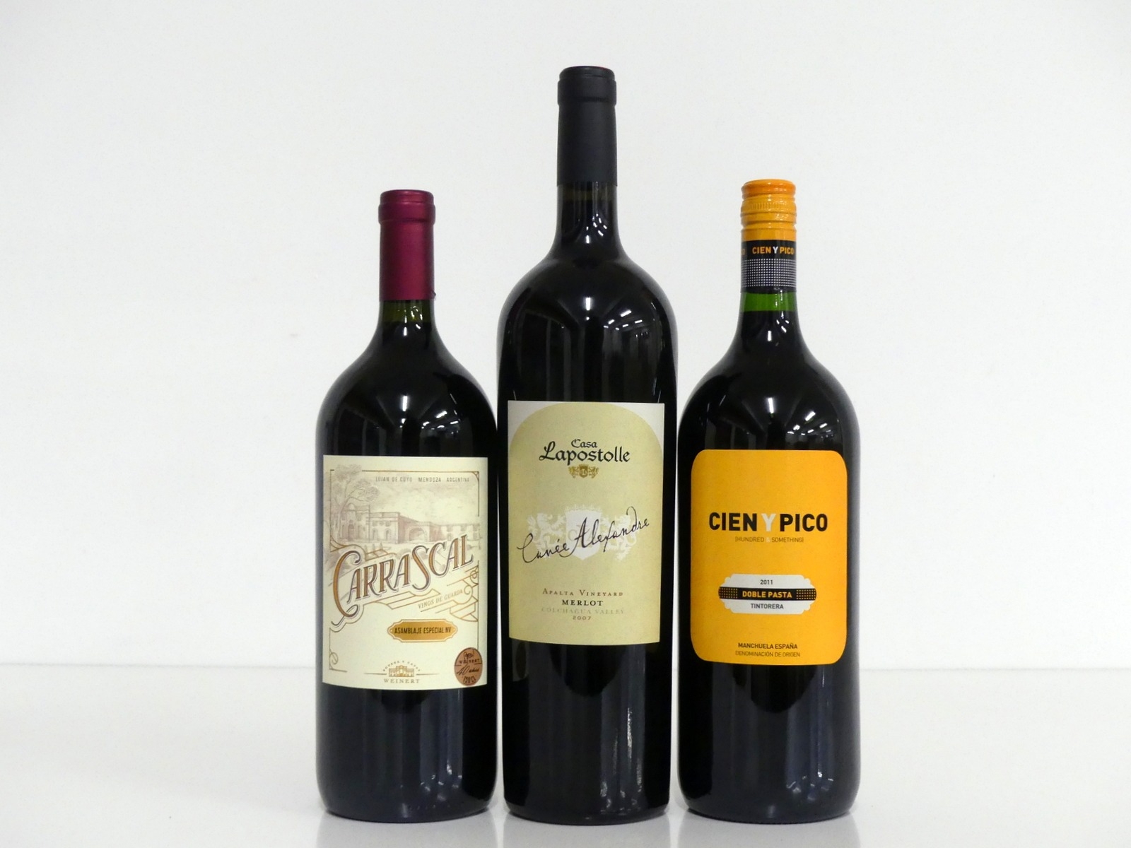 1 magnum Weinert Carrascal Asamblaje Especial NV bottled 2019 Mendoza 1 magnum Casa Lapostolle Cuvée Alexandre Apalta Vineyard Merlot 2007 Colchagua Valley 1 magnum Cien Y Pico Doble Pasta Tintotera Manchuela España 2011 Above 3 magnums