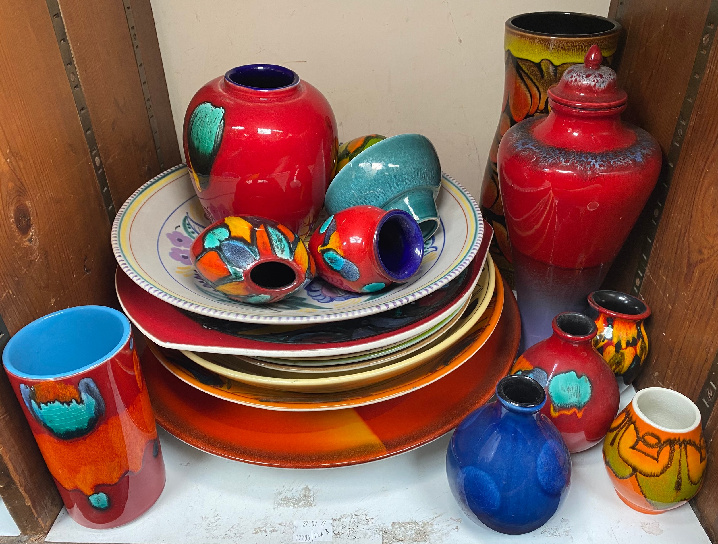 A collection of assorted Poole Pottery items comprising various vases, one with cover, a number of dishes and various chargers including a Final Quay edition example etc. (SECTION 32)