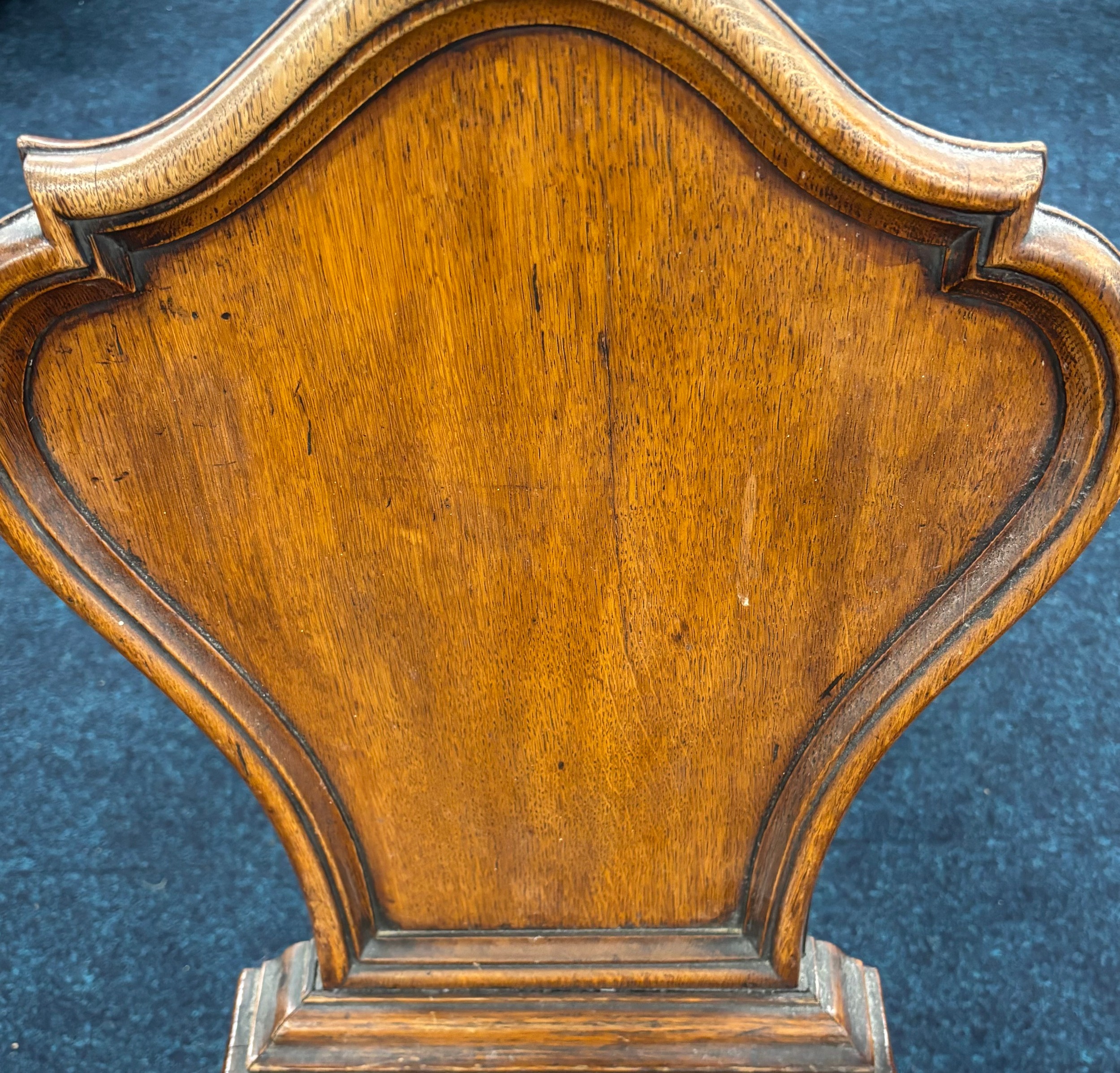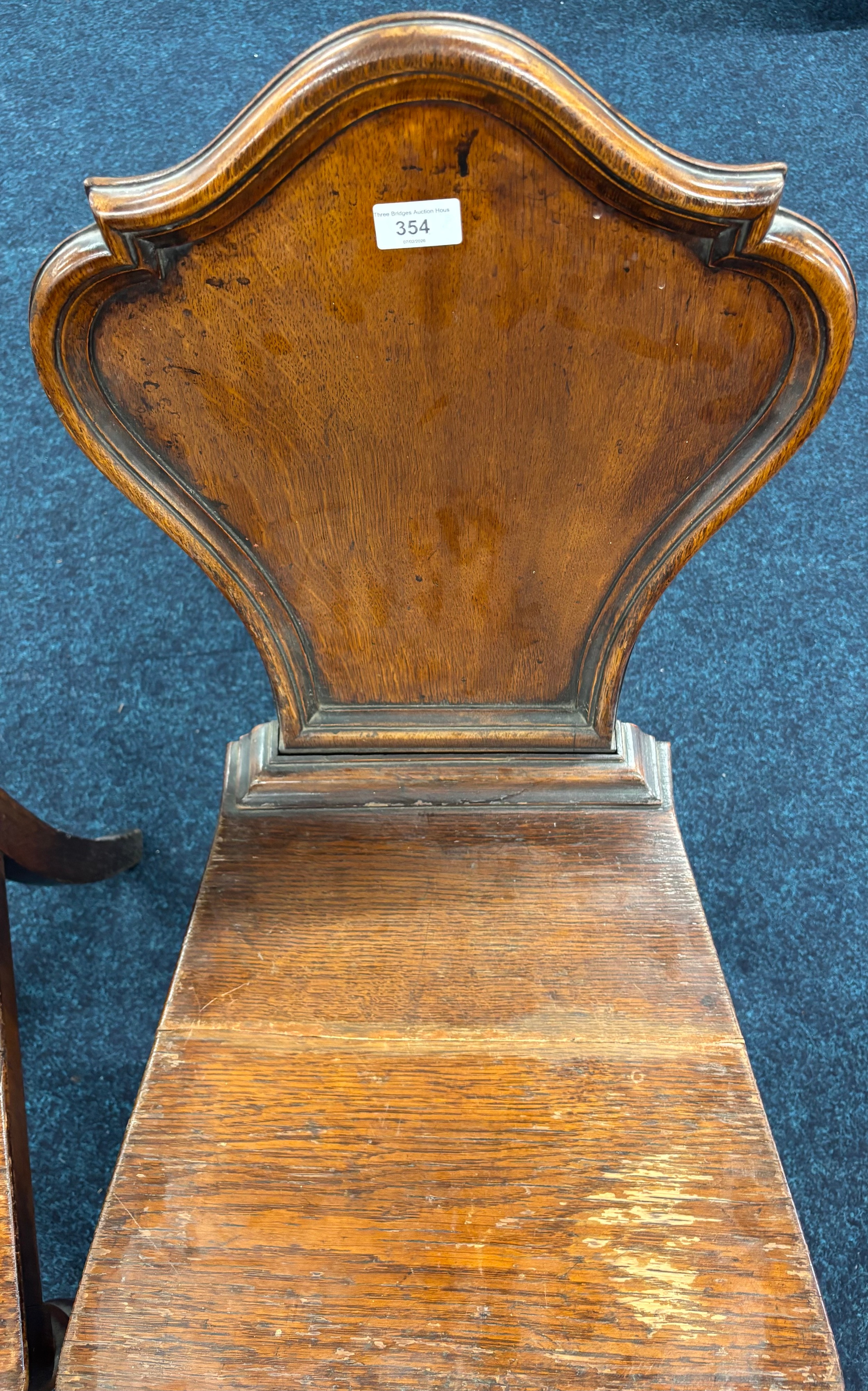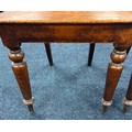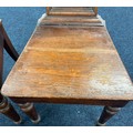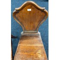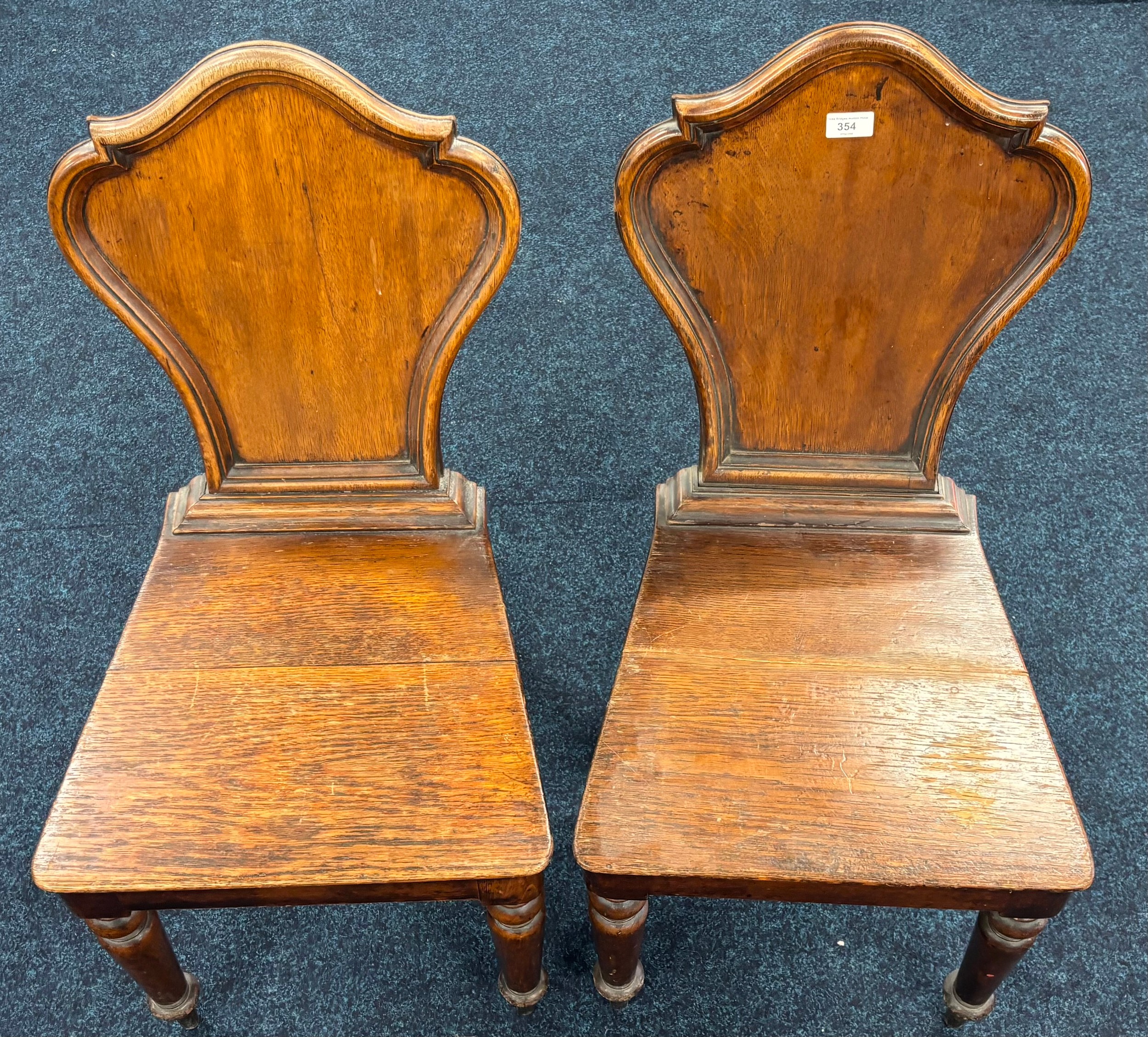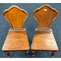 Two Victorian hall chairs with shield back and raised on turned legs. 91cm in height.