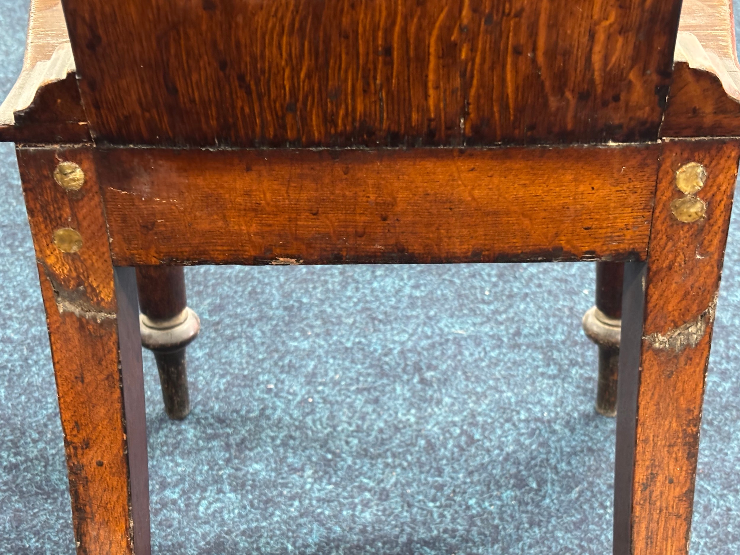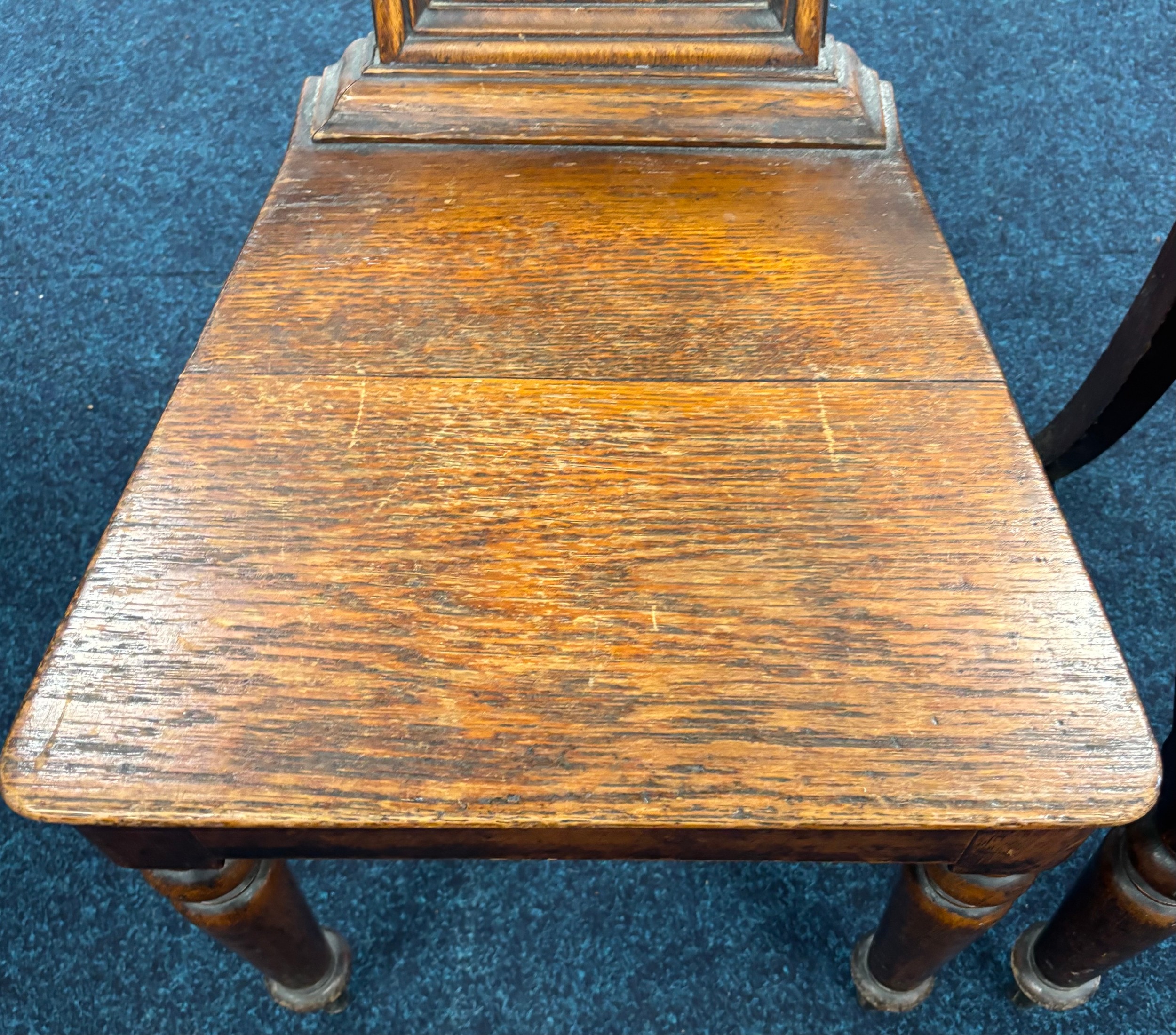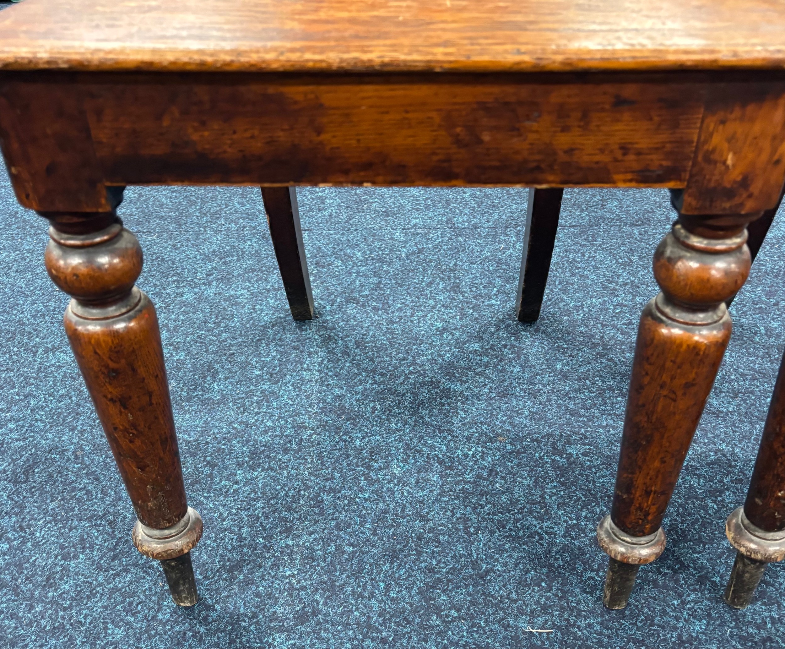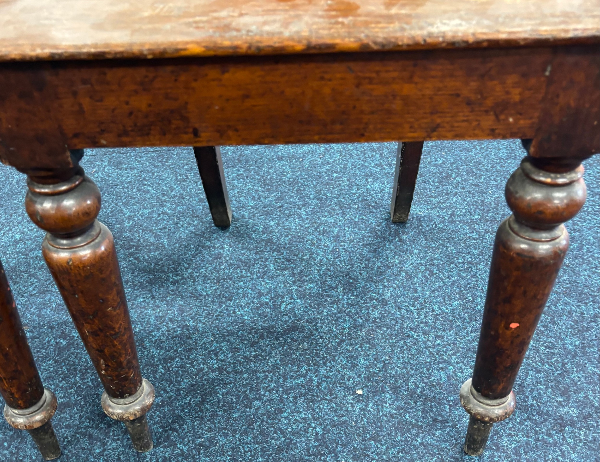 Two Victorian hall chairs with shield back and raised on turned legs. 91cm in height.