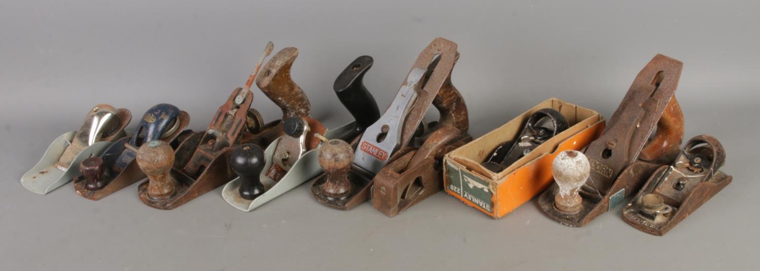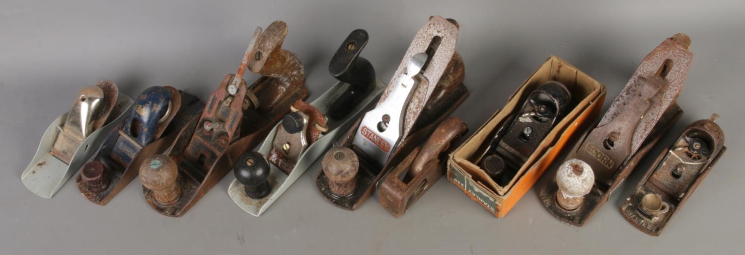 A collection of nine vintage hand planes; Including Record, Stanley, Bailey, Acorn etc.