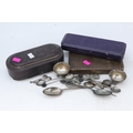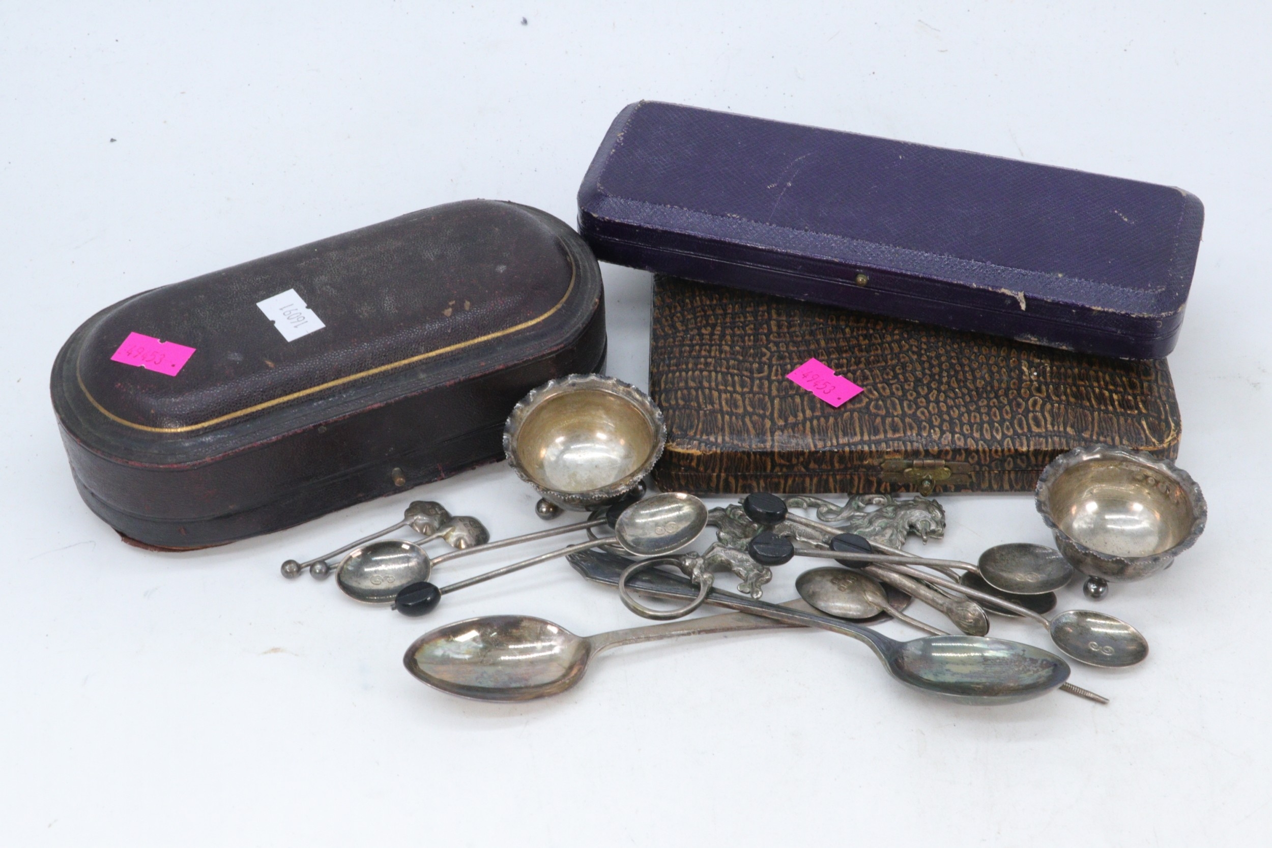 A pair of silver salts in fitted case (hinge broken) together with a silver spoon, a set of six silver coffee bead spoons, and pair of white metal sugar tongs in the shape of a griffin (silver weight approx. 120g)