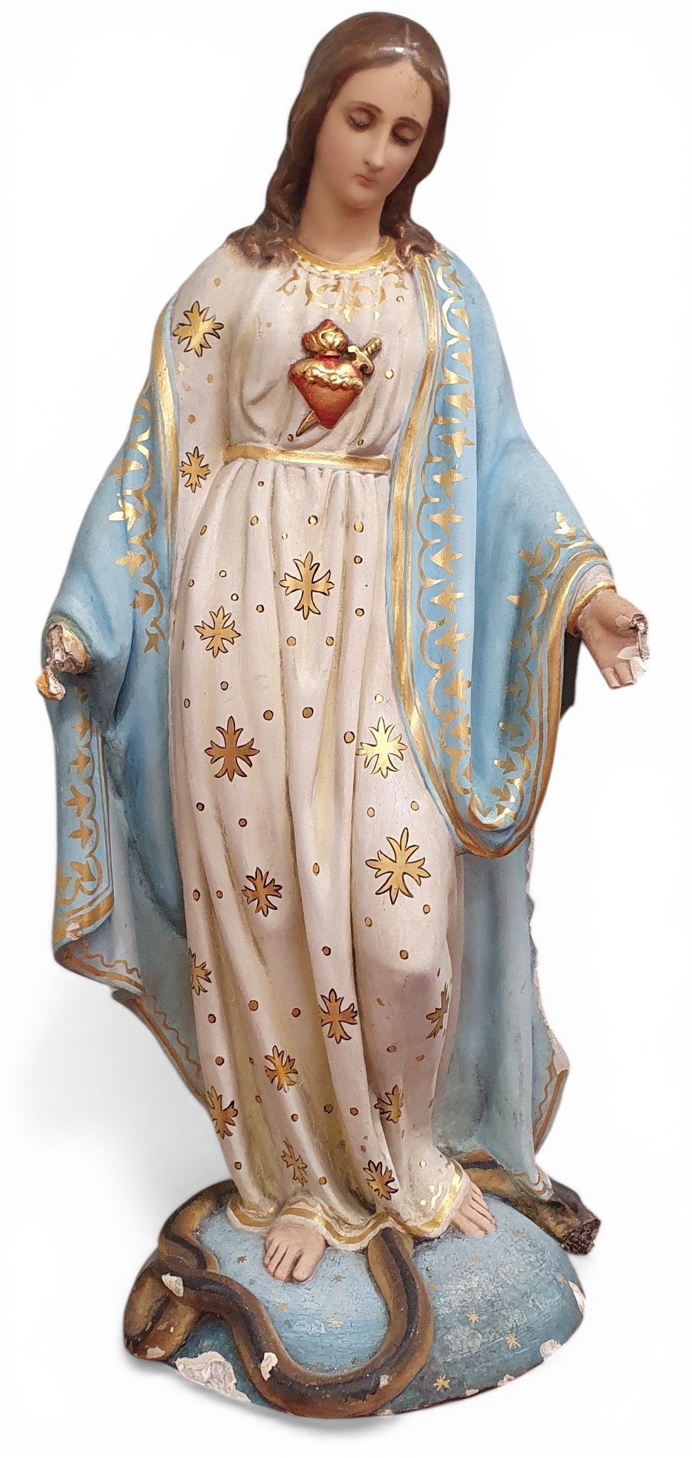 A large hand painted Statue of The Virgin Mary. With faults. H 114 cm approx.