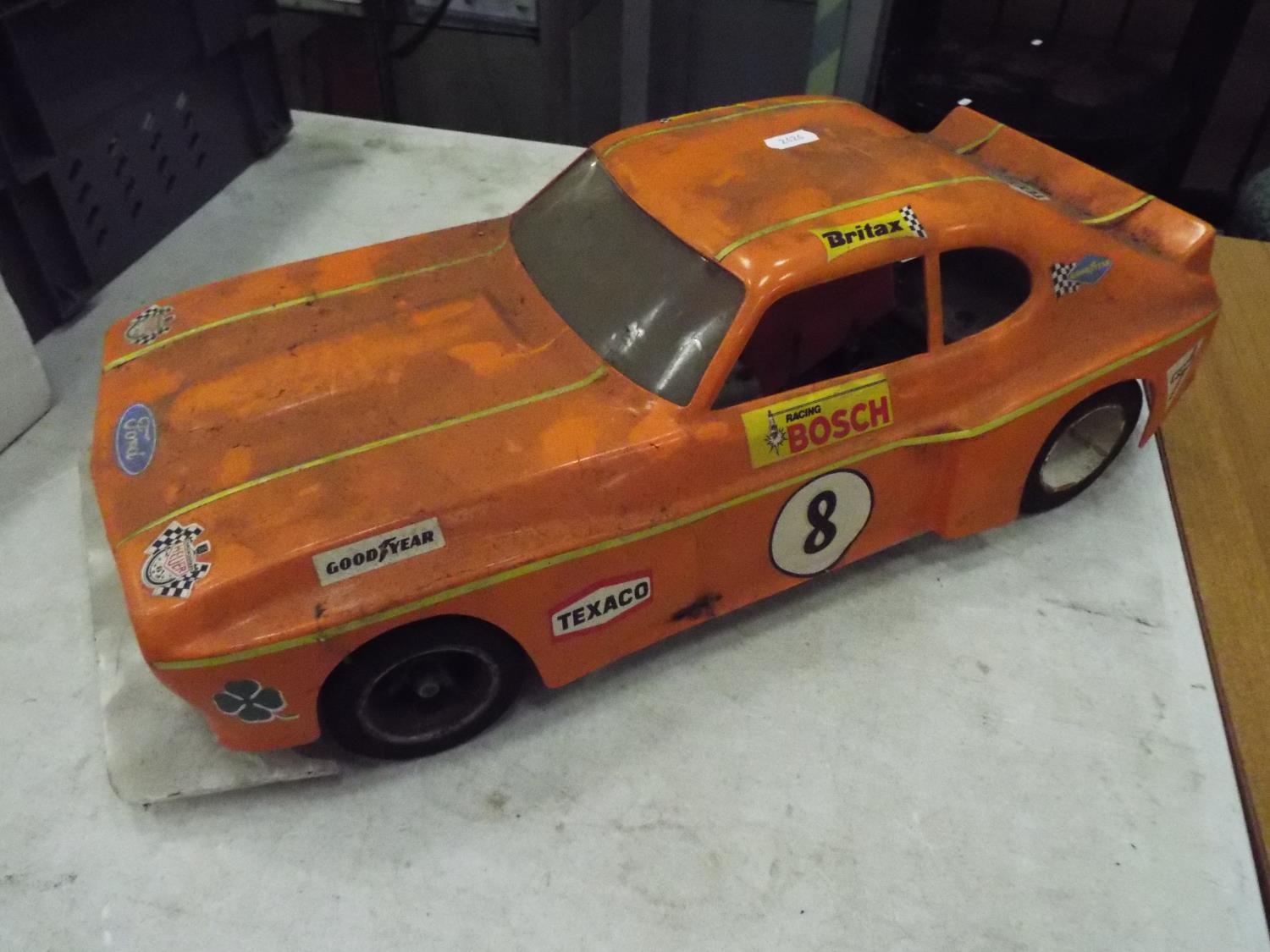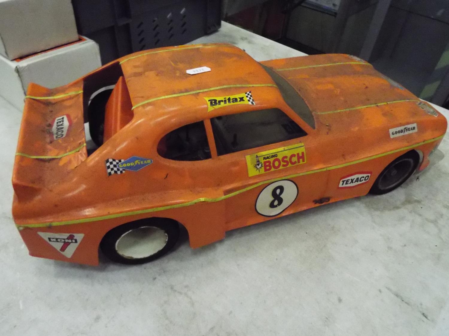 Rolling chassis and plastic bodyshell of a Ford Capri GT car 20 inches long working condition unknown.