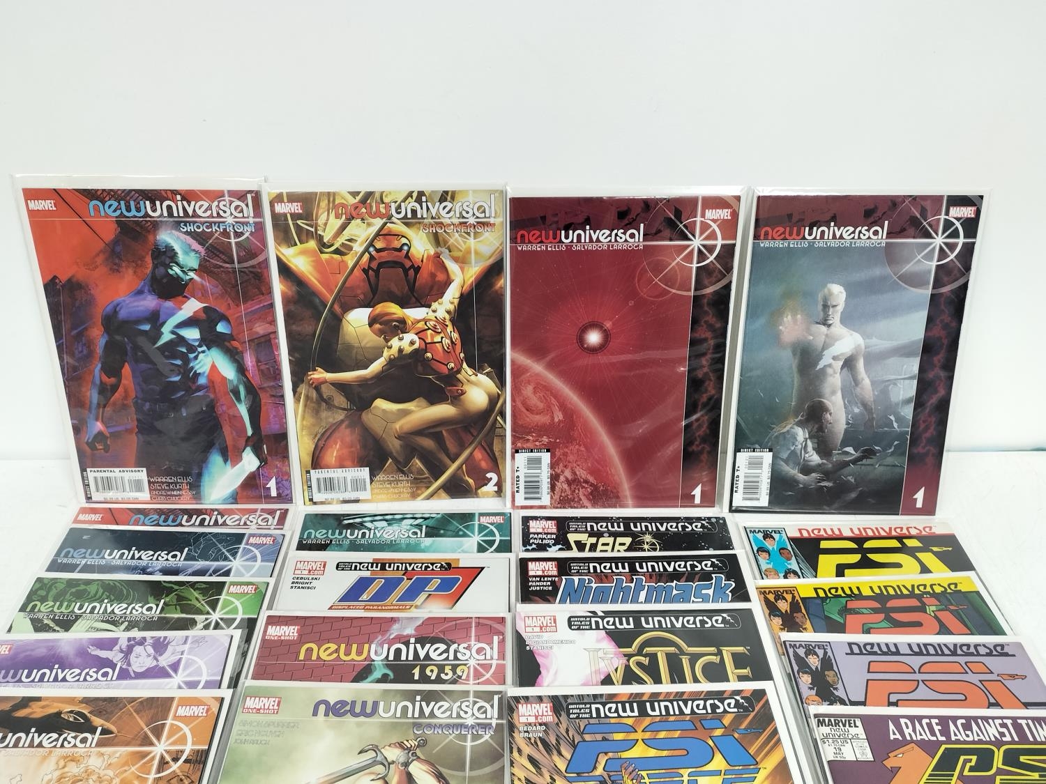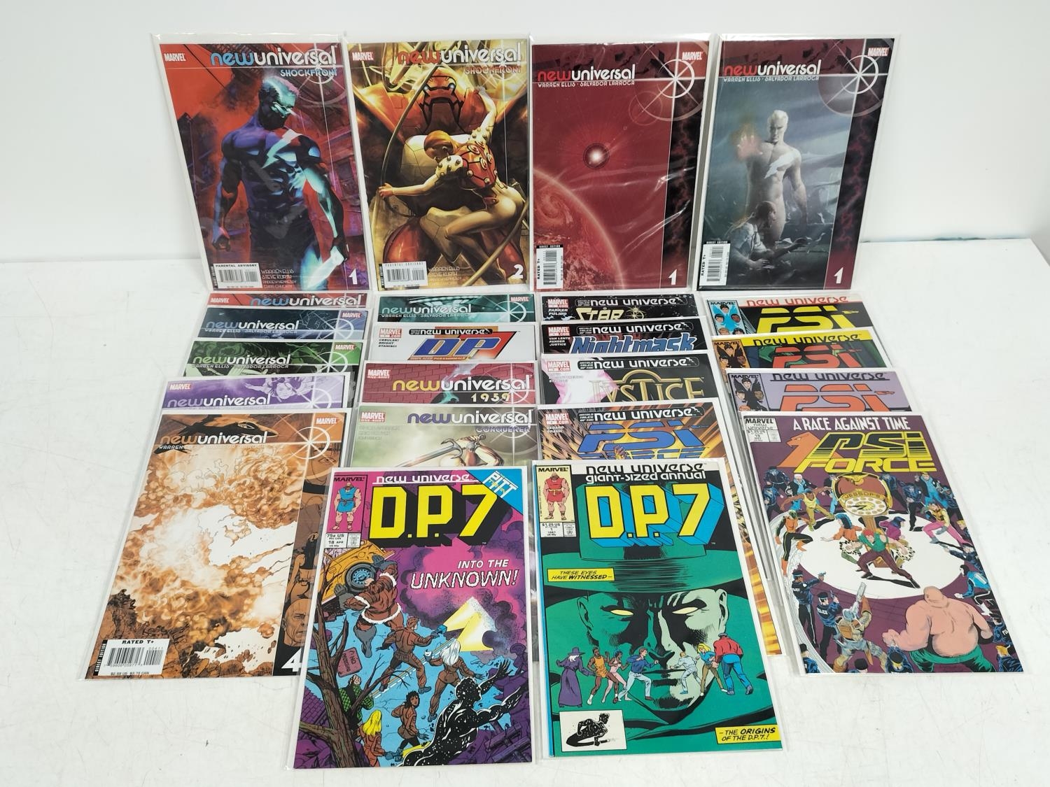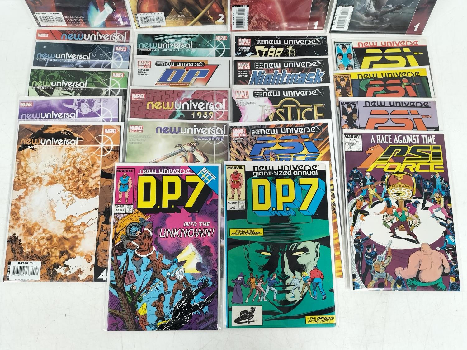 Collection of Nixed Marvel New Universal Comics (23) to include 2006 PSI Force Nos 1, 12, 13, 14, 19 and 2006 Star Brand No 1, 2006 Nightmask No 1, 2006 Justice No 1, 2008 Oneshot Conquerer, 1959 Oneshot, 2006 DP7 No1, 2008 Shockfront 1x2 and 2, 1987 DP7 Annual No1 and 1988 No 18, etc. Bagged and Boarded