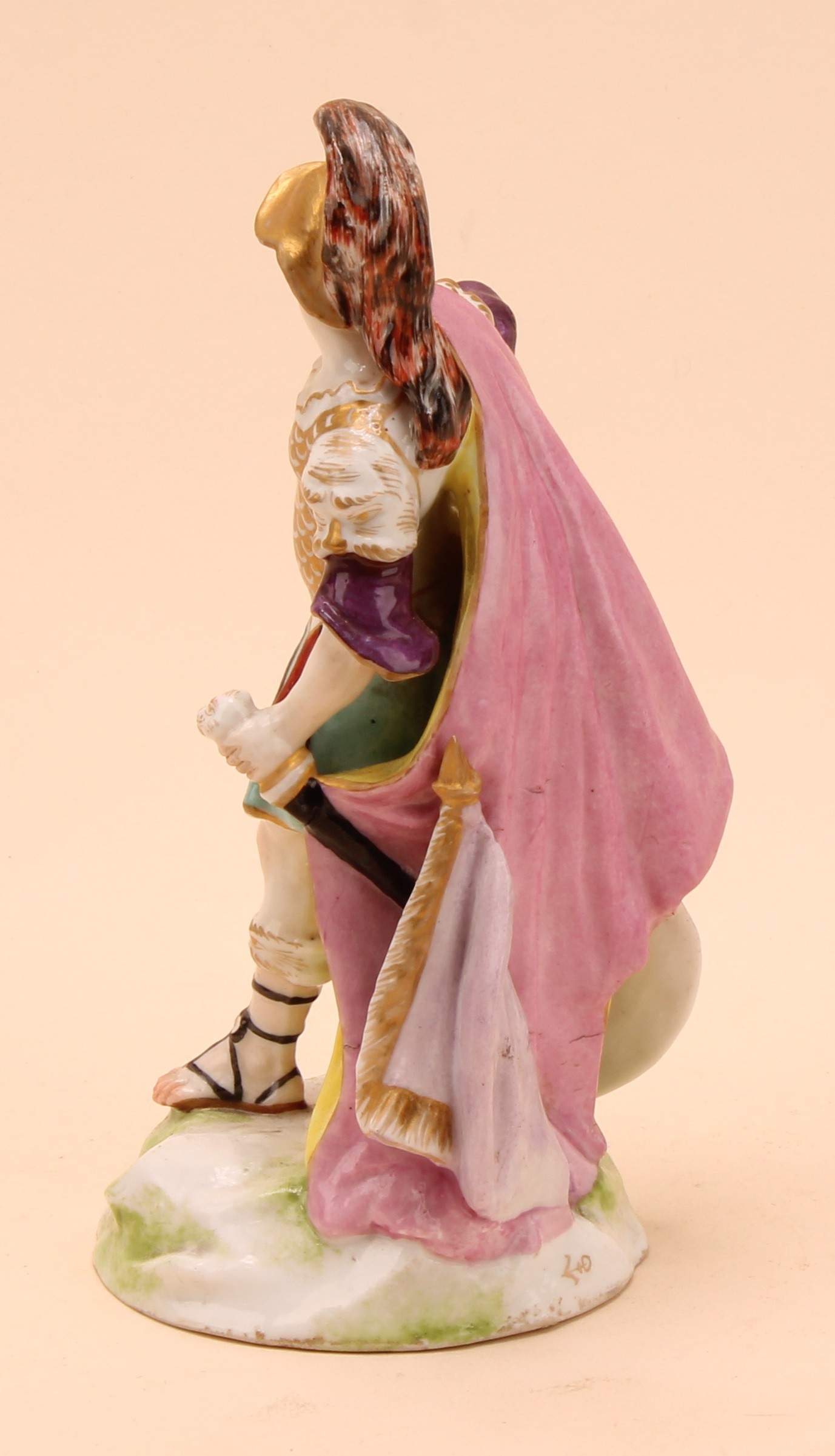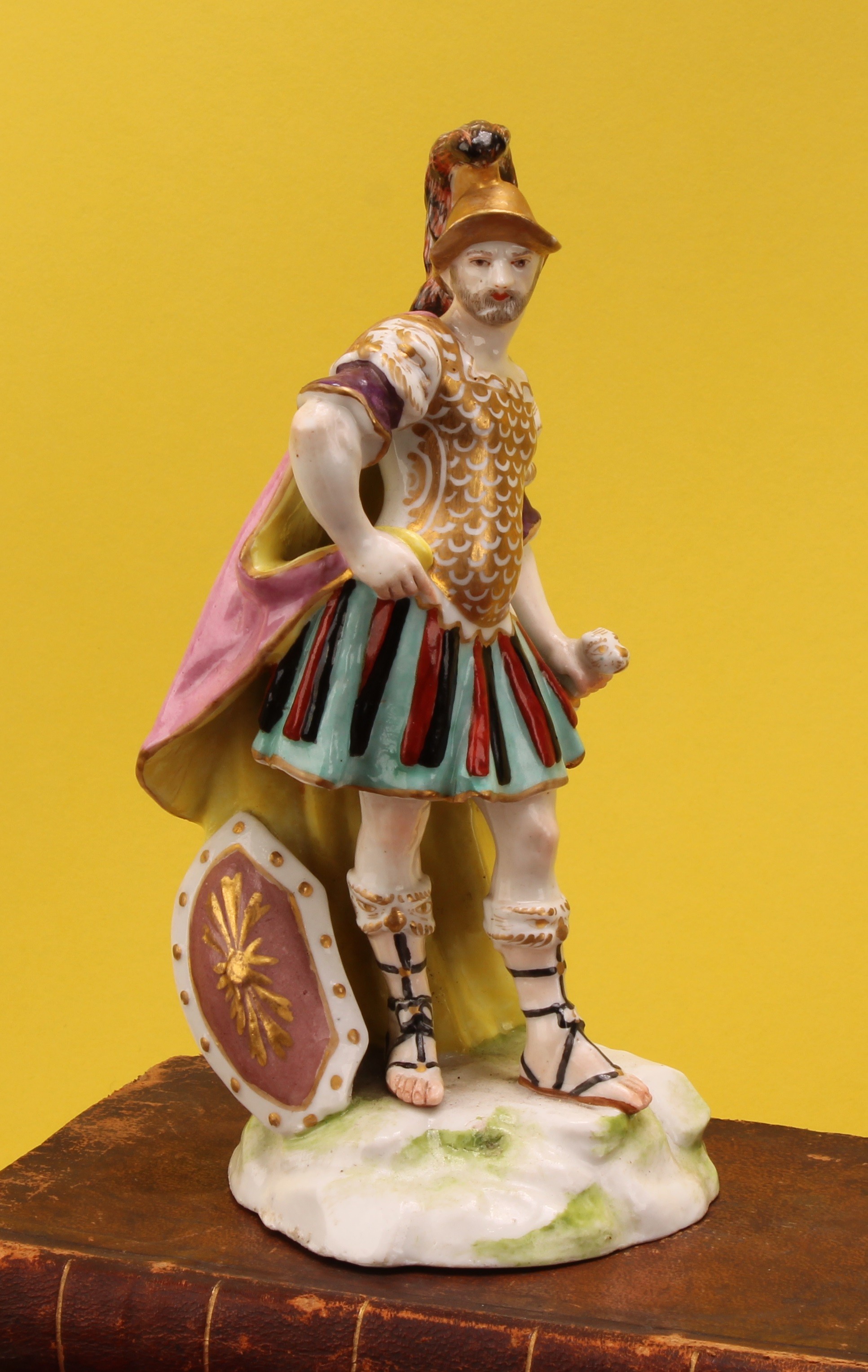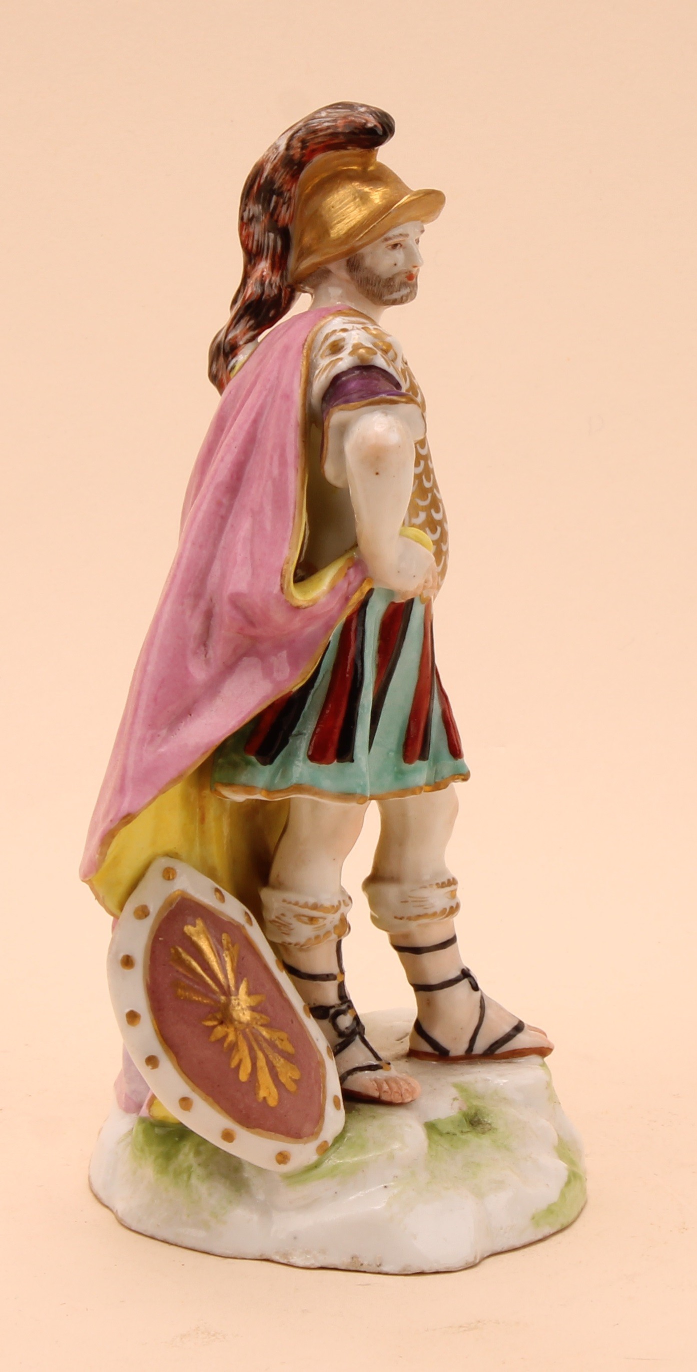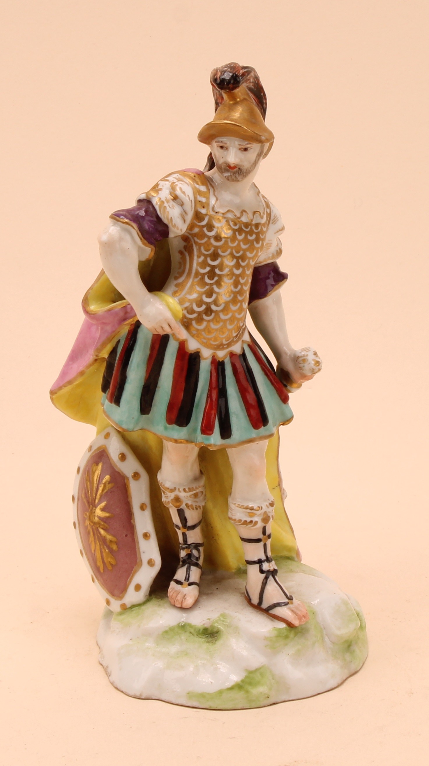 A Samson Paris figure, of Mars as a centurion, he stands wearing a feathered helmet, chain mail uniform and sandals, sword in hand, his shield at his side, 18cm high, anchor mark in gilt, 19th century
