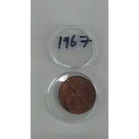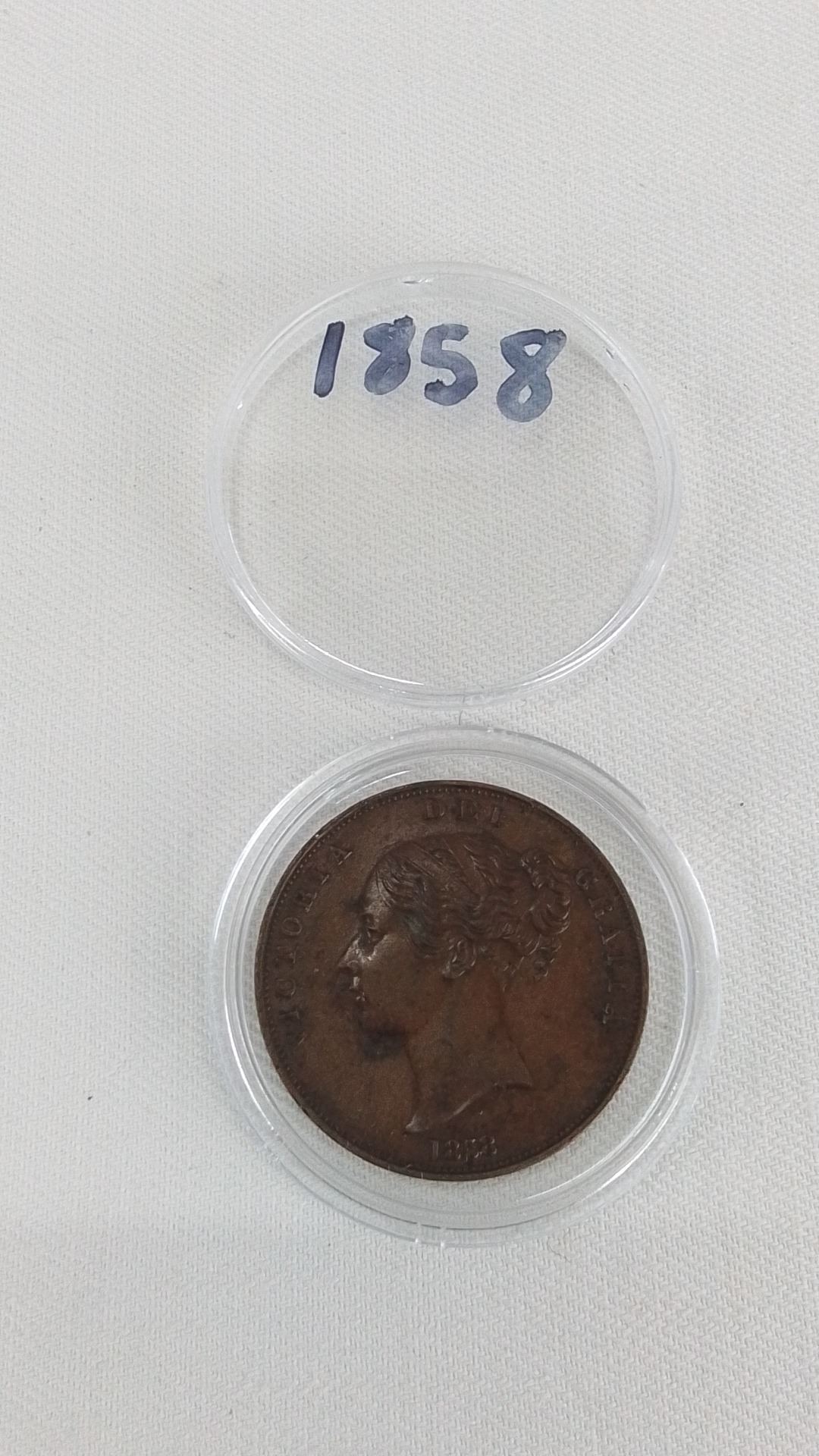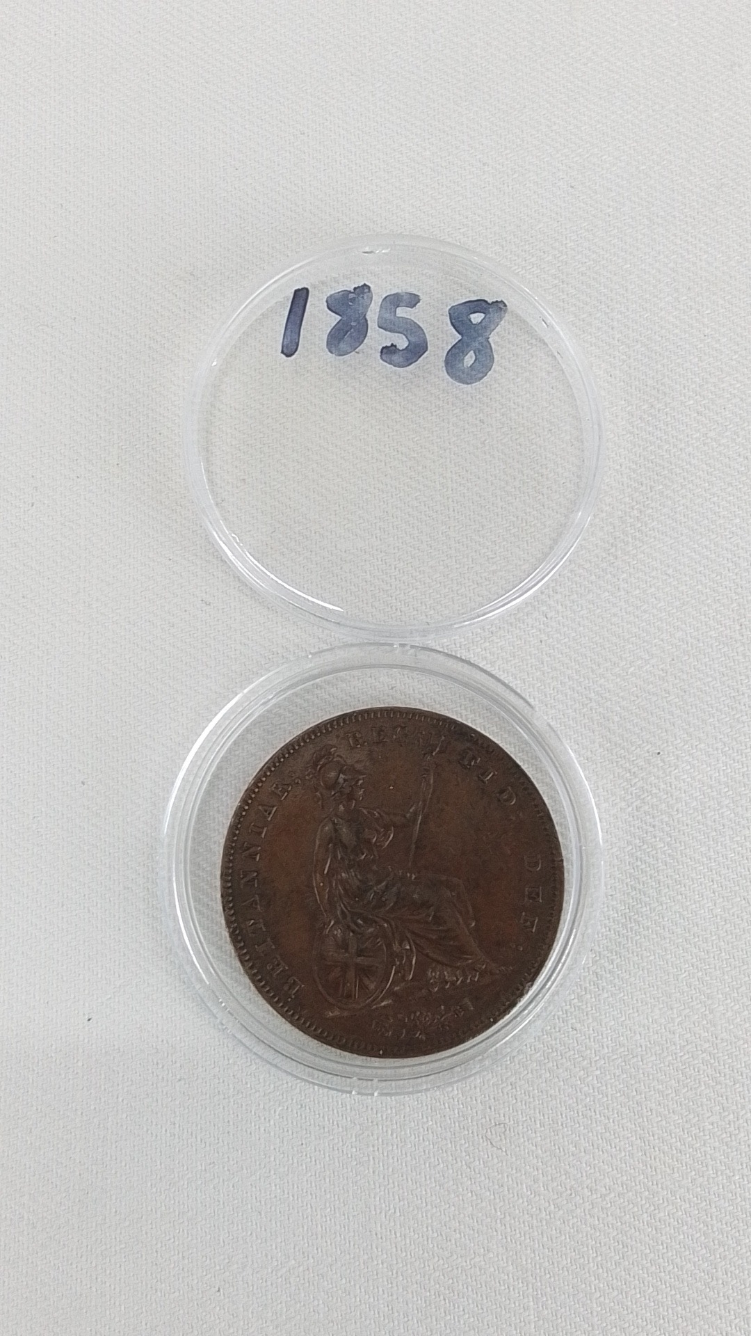 Victorian British one penny, dated 1858, copper, obverse with veiled head of Queen Victoria and reverse Britannia seated, housed in a clear plastic capsule.