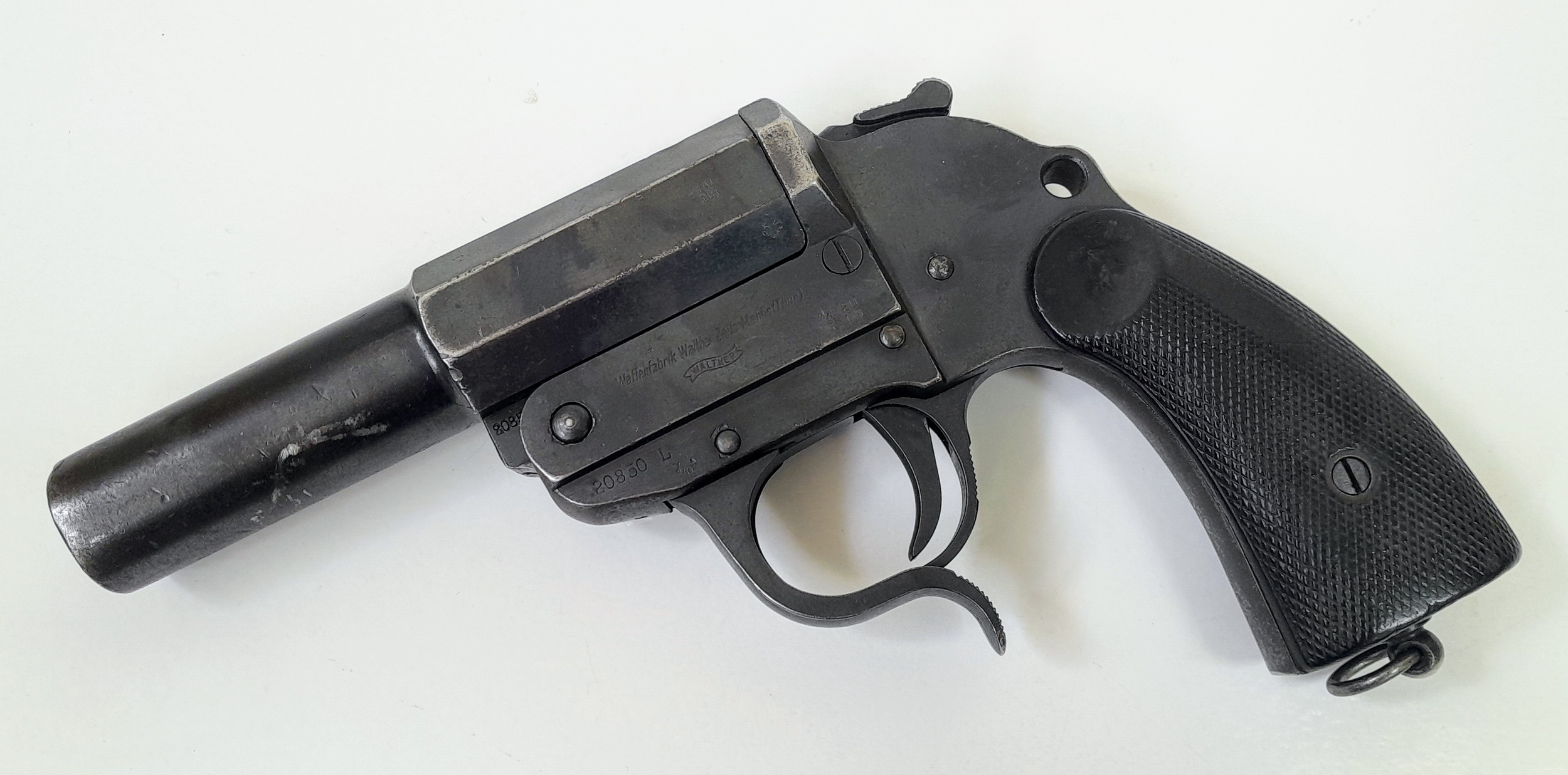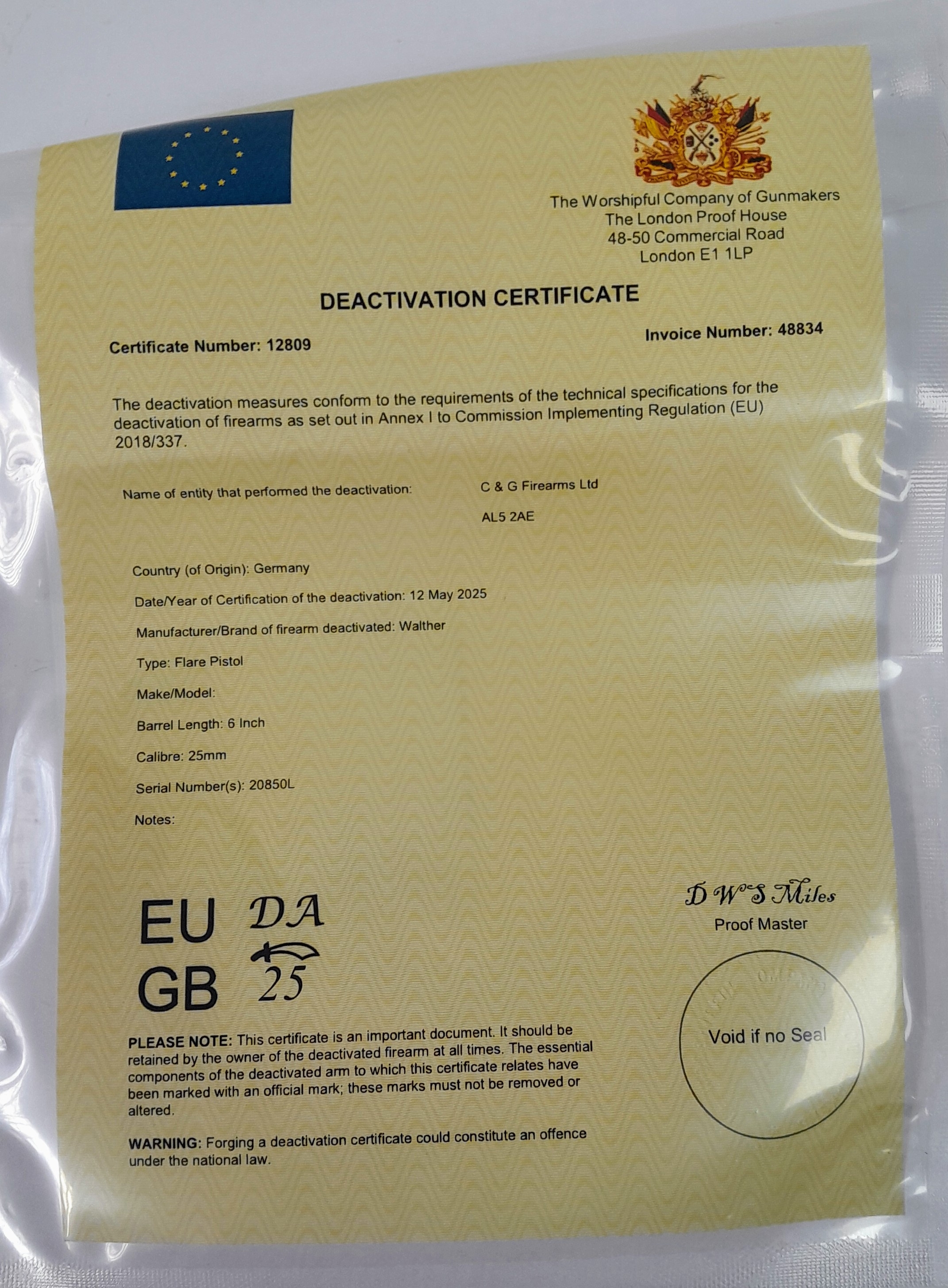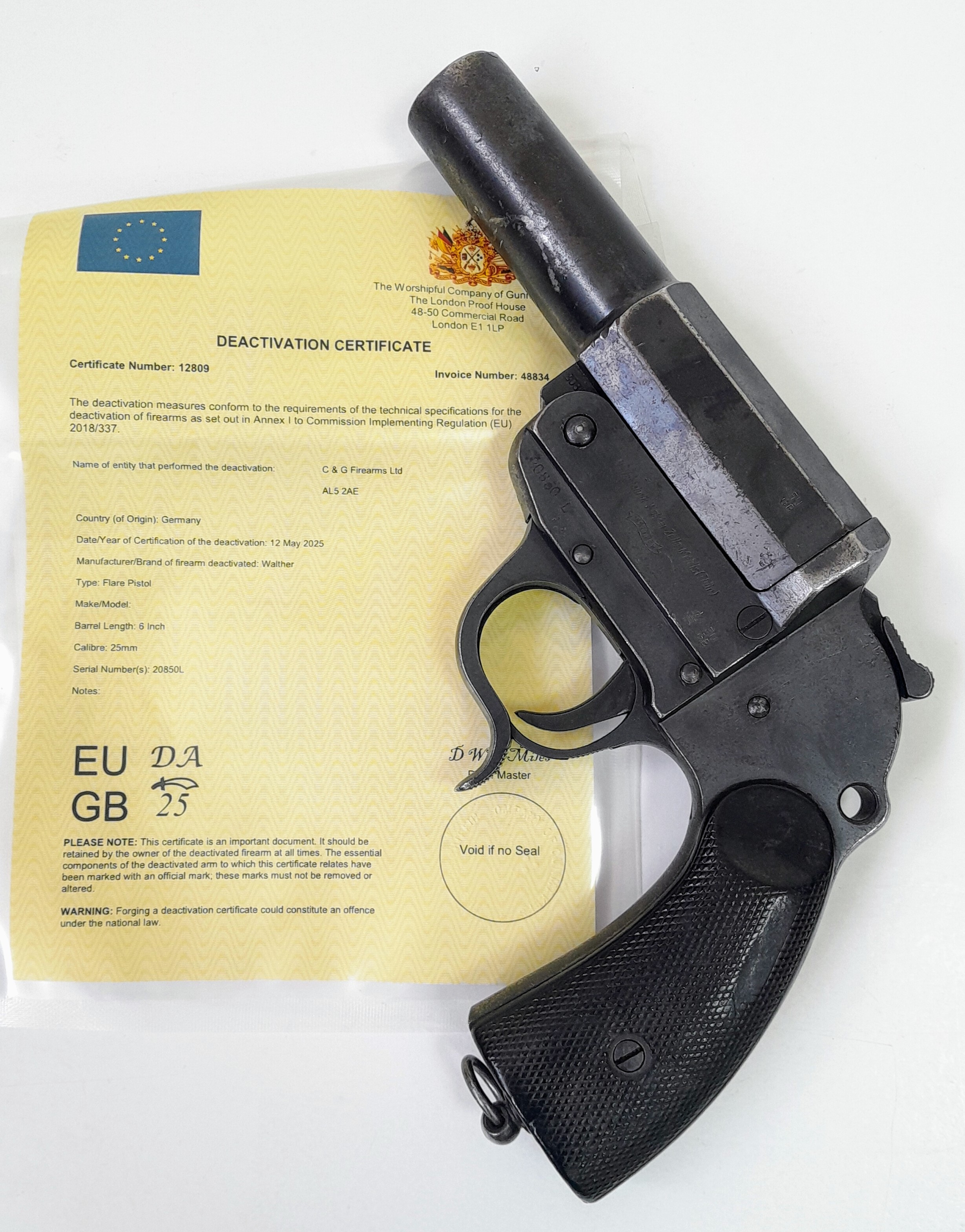 A deactivated Walther single shot flare pistol, 6 inch barrel, 25mm calibre. UK/EU Sales Only - Not Holland. Comes with an EU deactivation certificate.
