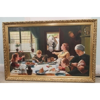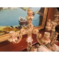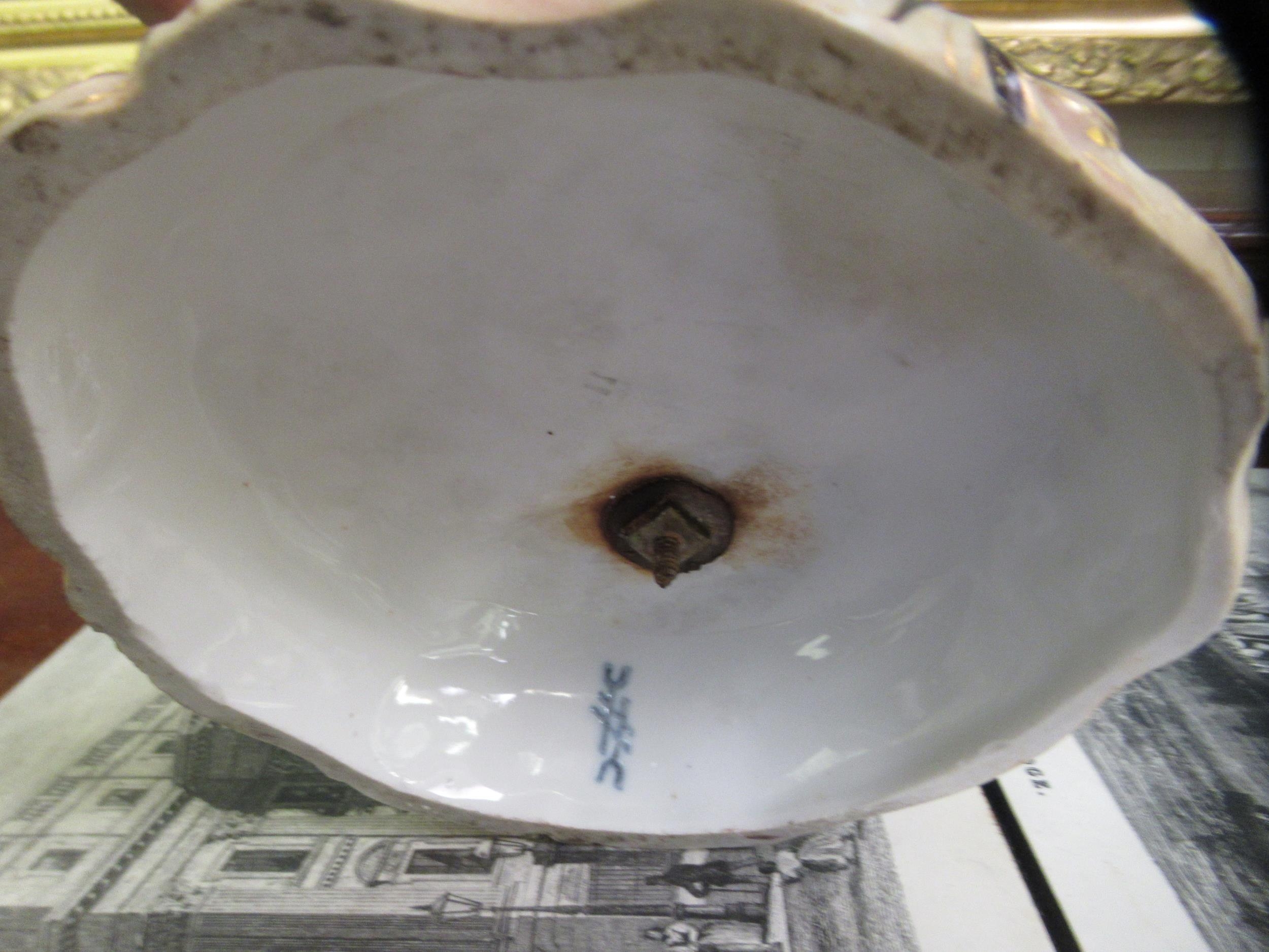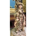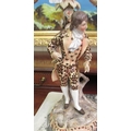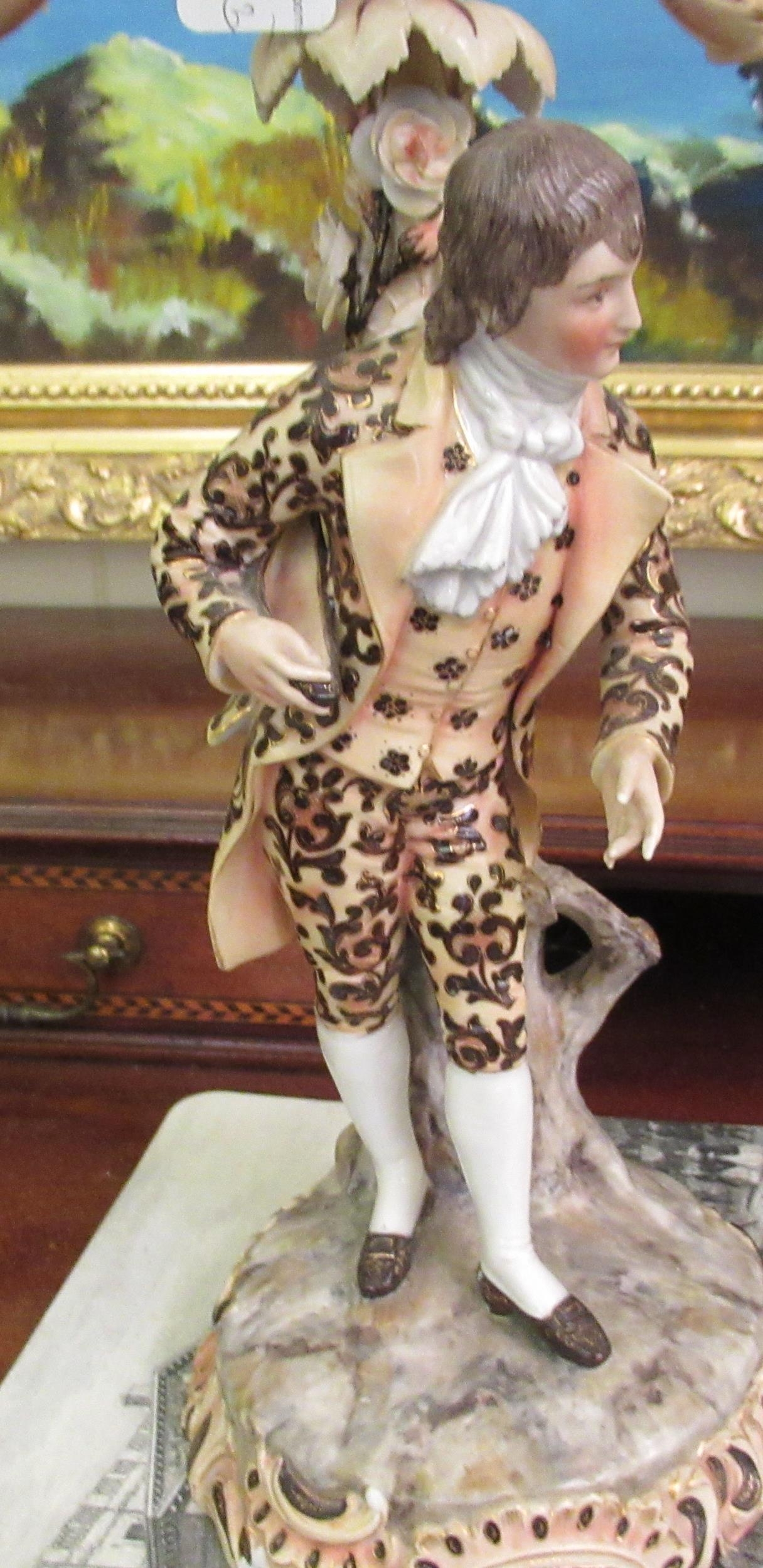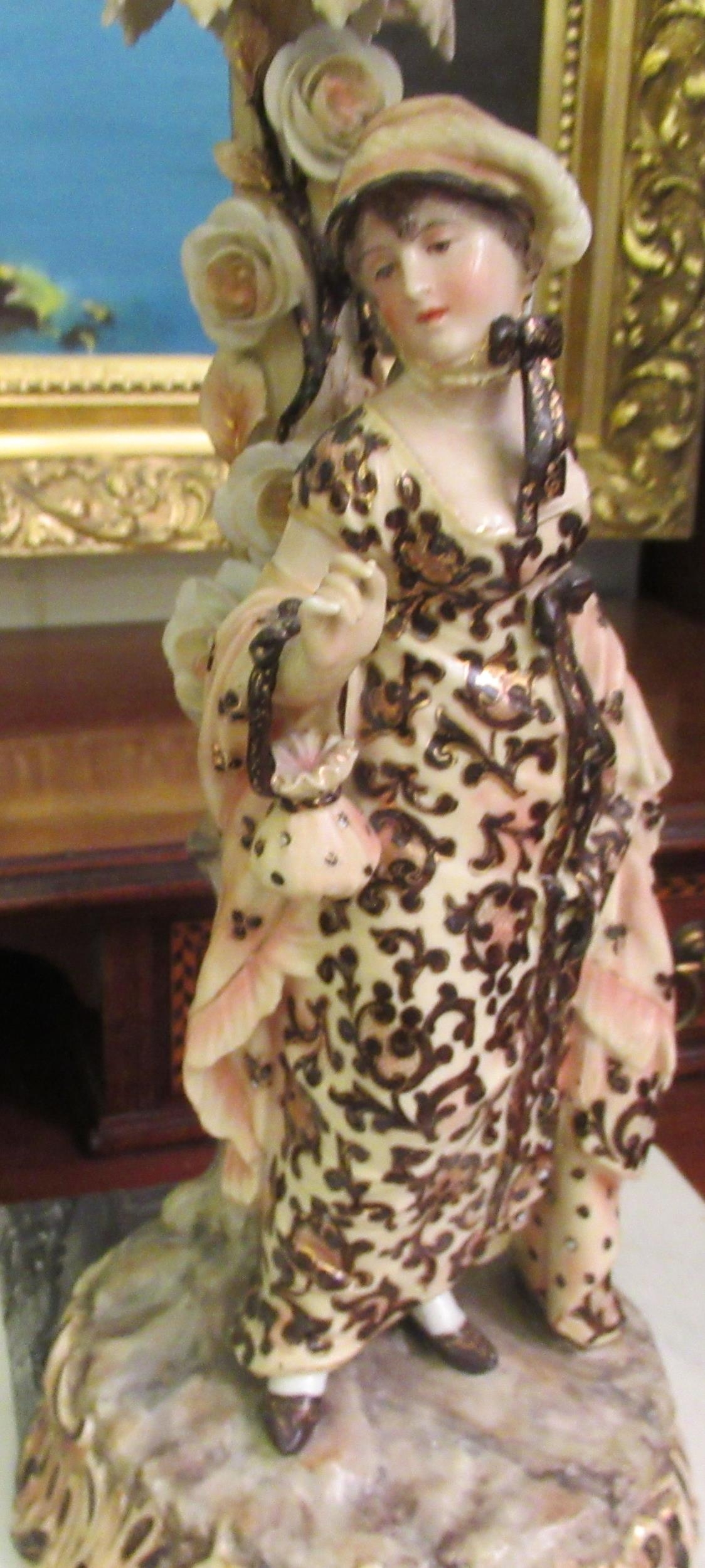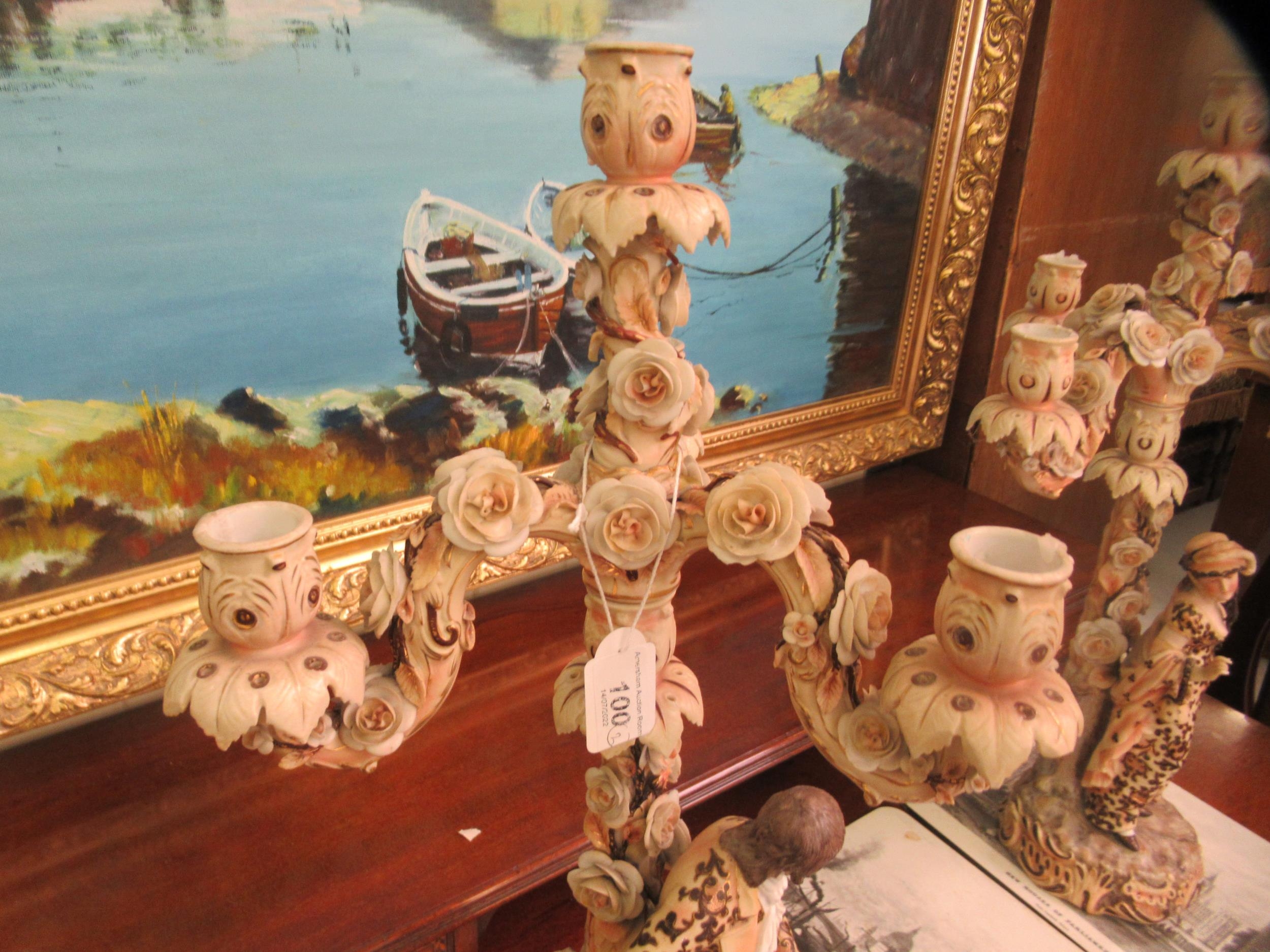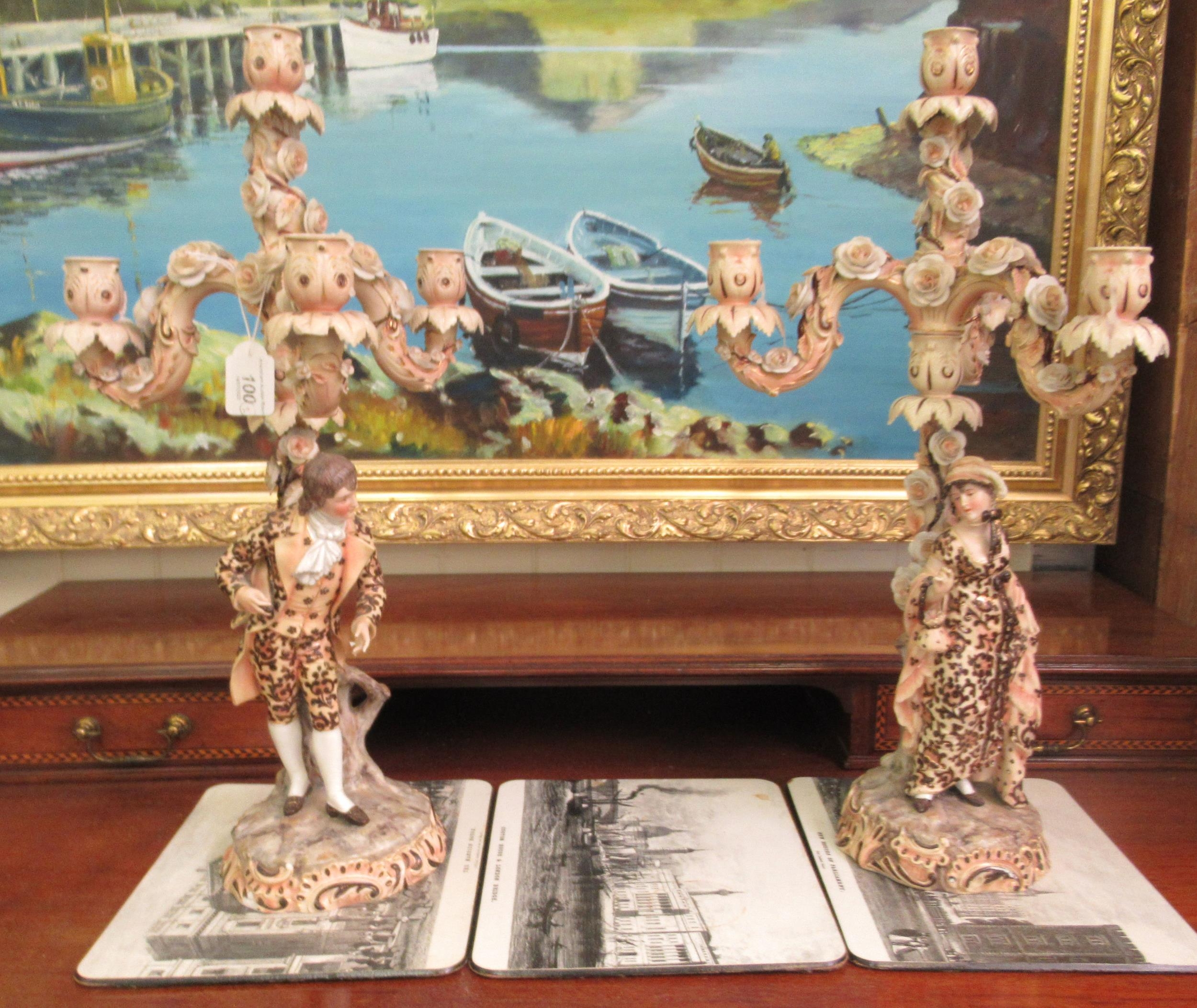 A pair of post 1950s European (possibly Austrian) porcelain triple branch candelabra, decorated with roses, foliage, tree trunks and figures wearing period costume 20"h