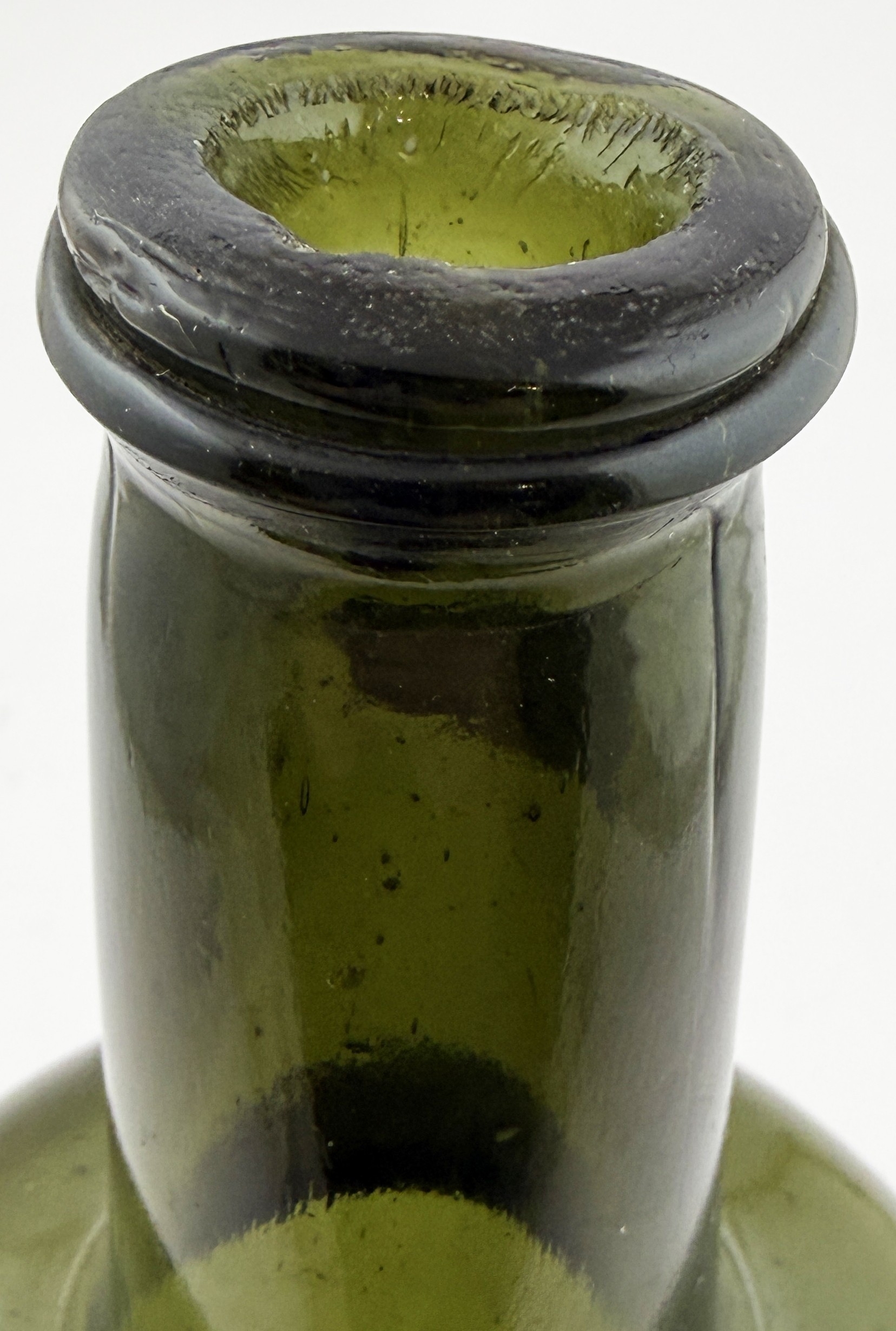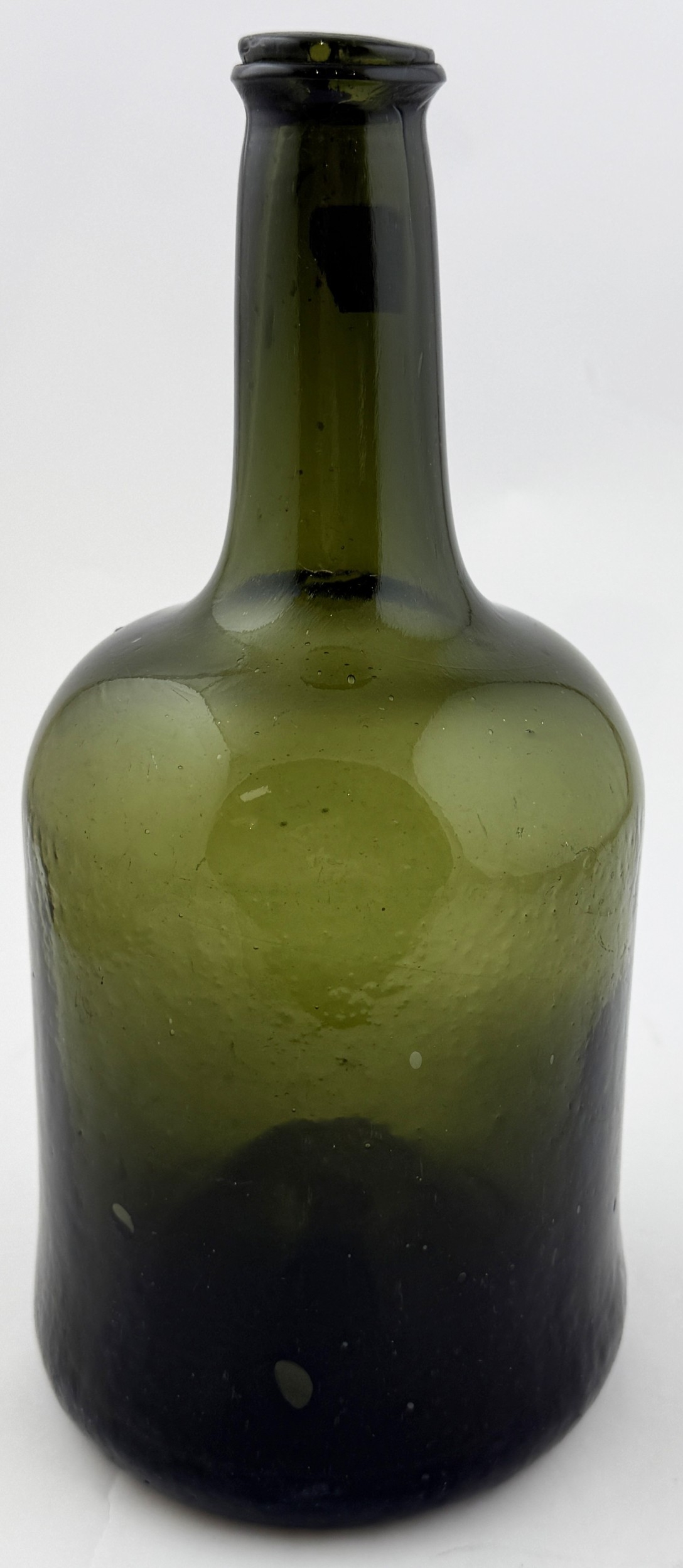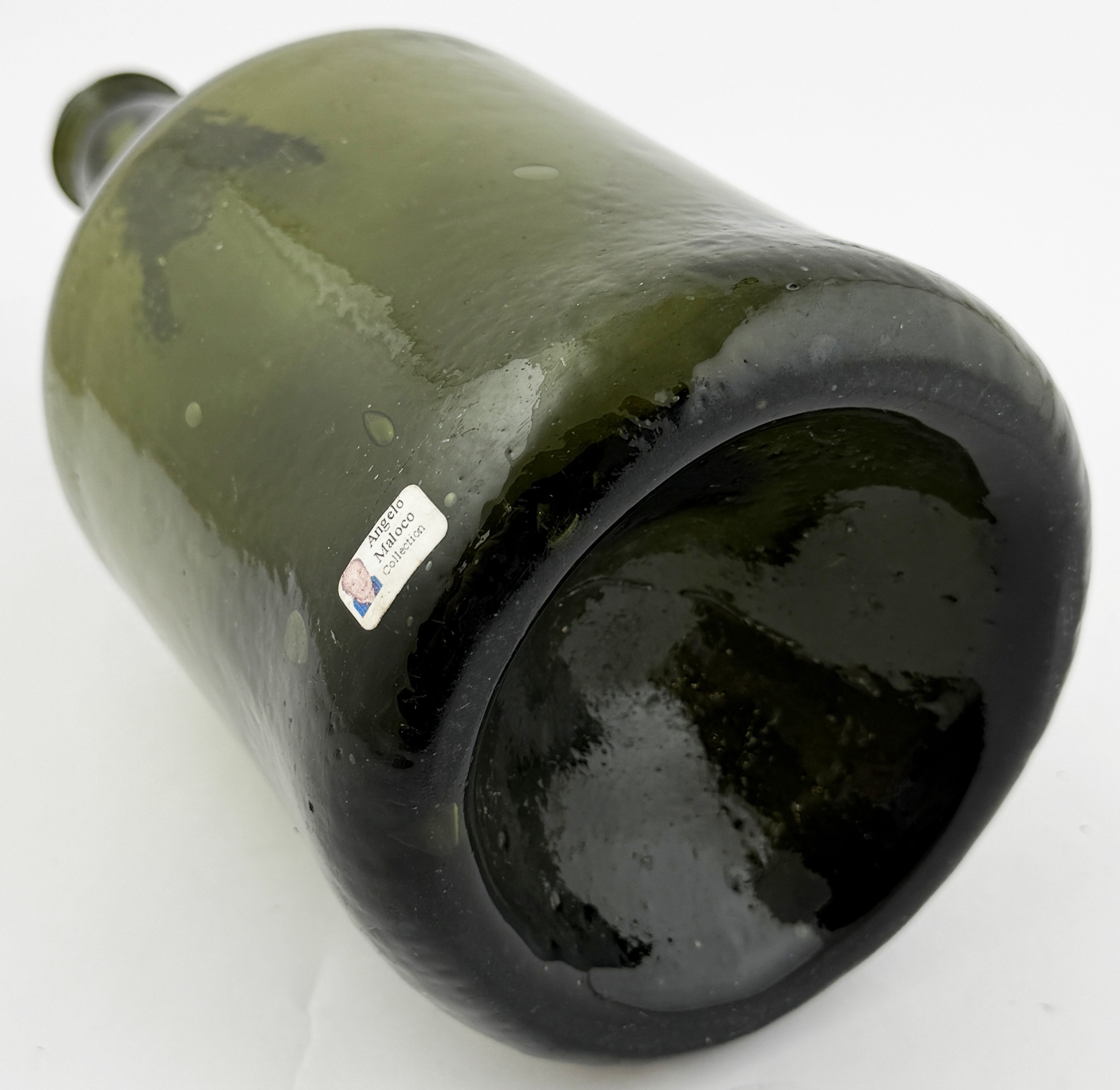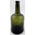 SQUAT ENGLISH CYLINDER BOTTLE. 10.8ins tall. Large squat bodied cylinder, attractive whittling to sides. Wide sand pontil within fairly deep kickup. Excellent undamaged condition