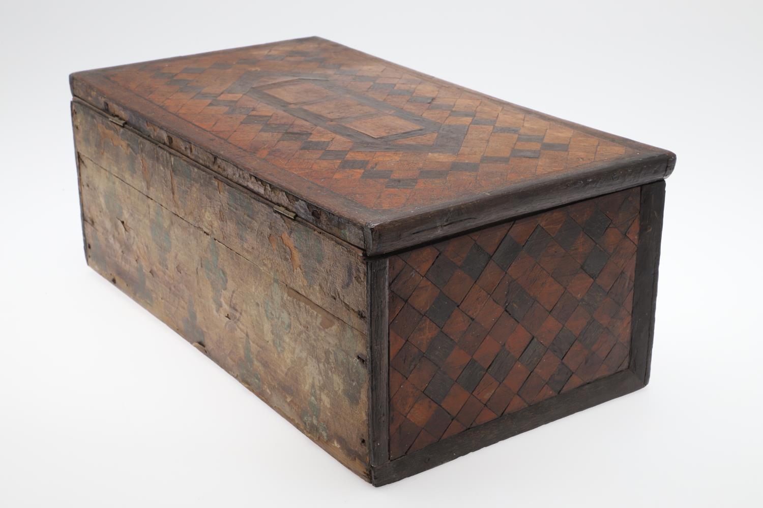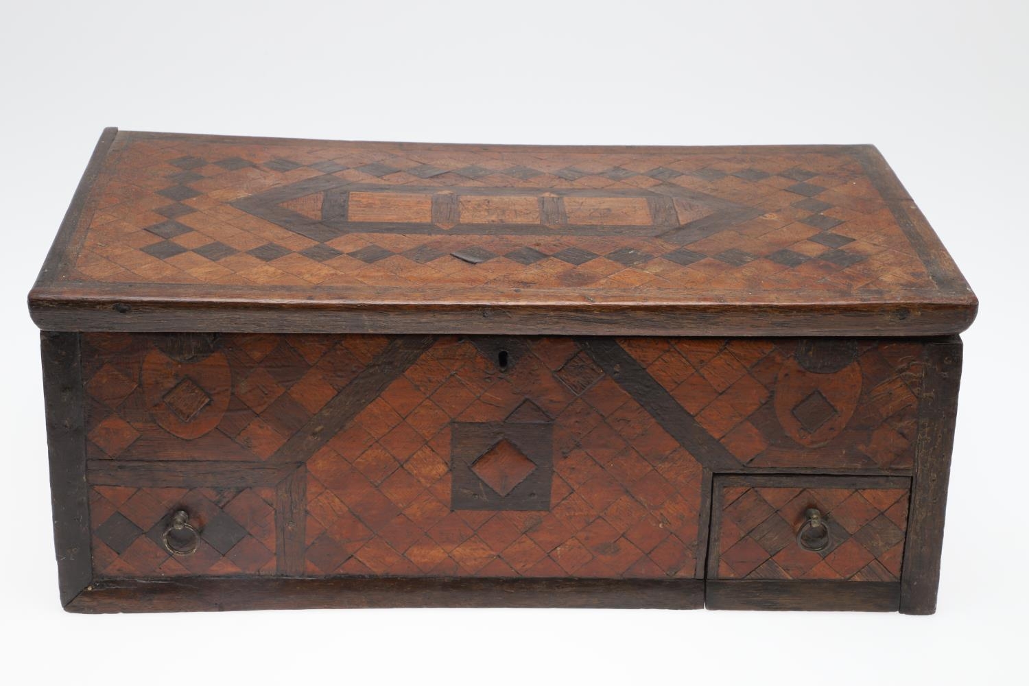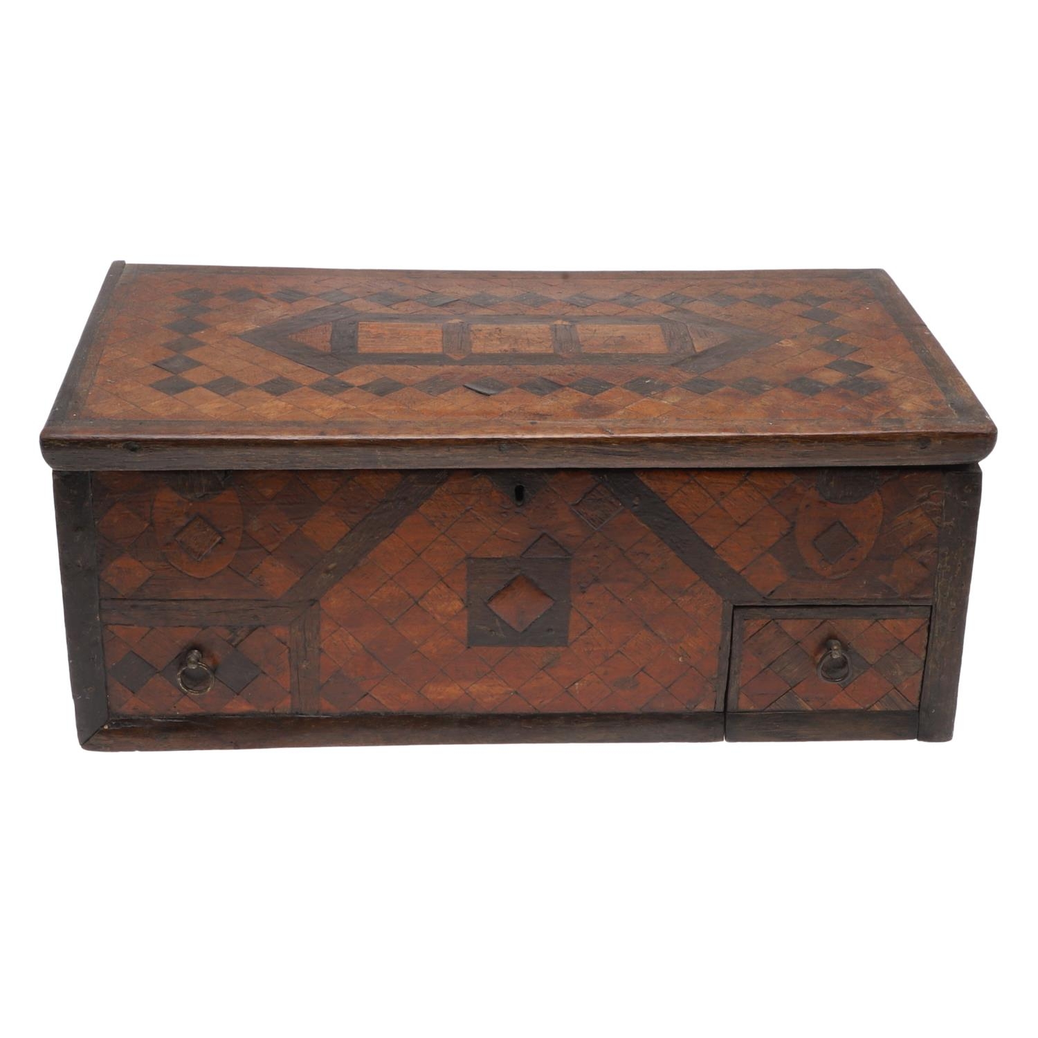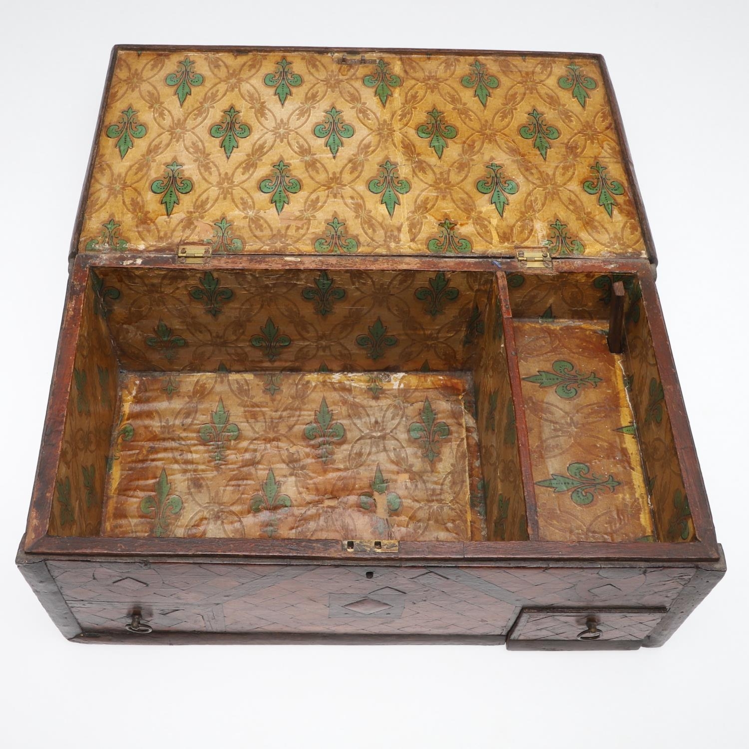 AN ANTIQUE CONTINENTAL PARQUETRY BOX. the hinged lid enclosing a fleur de lys patterned paper lined interior, single compartment with drawer below, locked with wooden peg, height 18cm, width 46cm, depth 25cm.