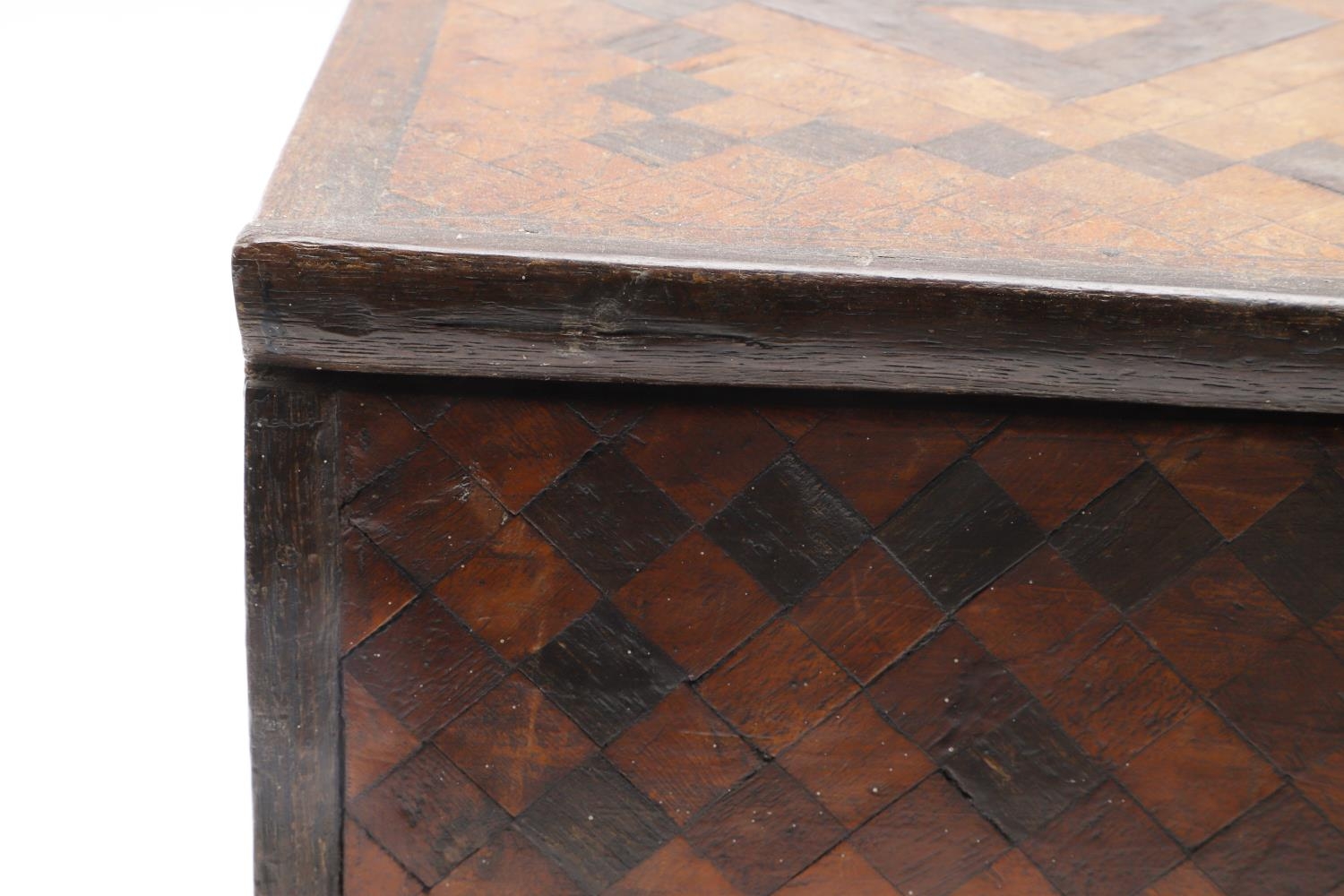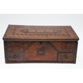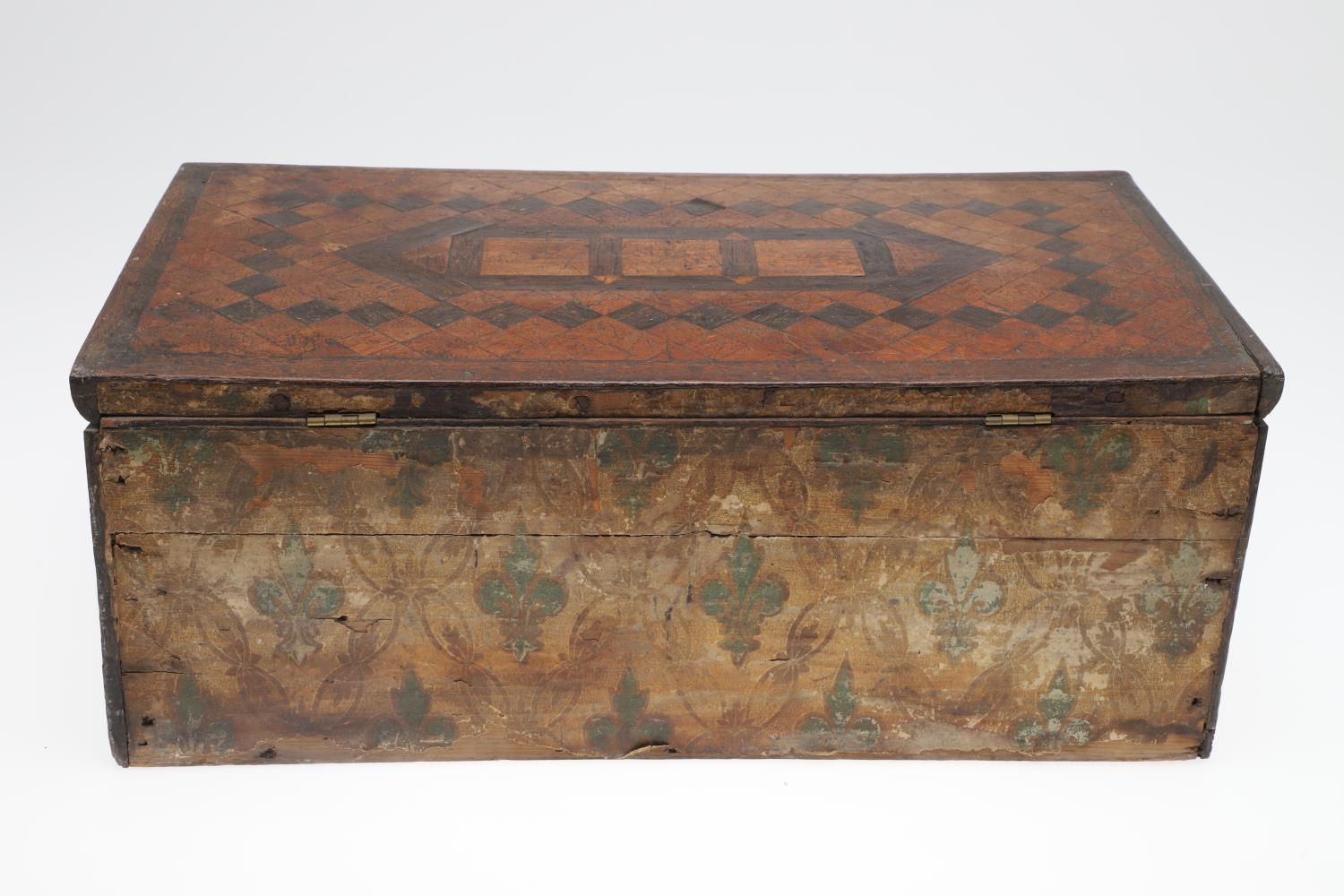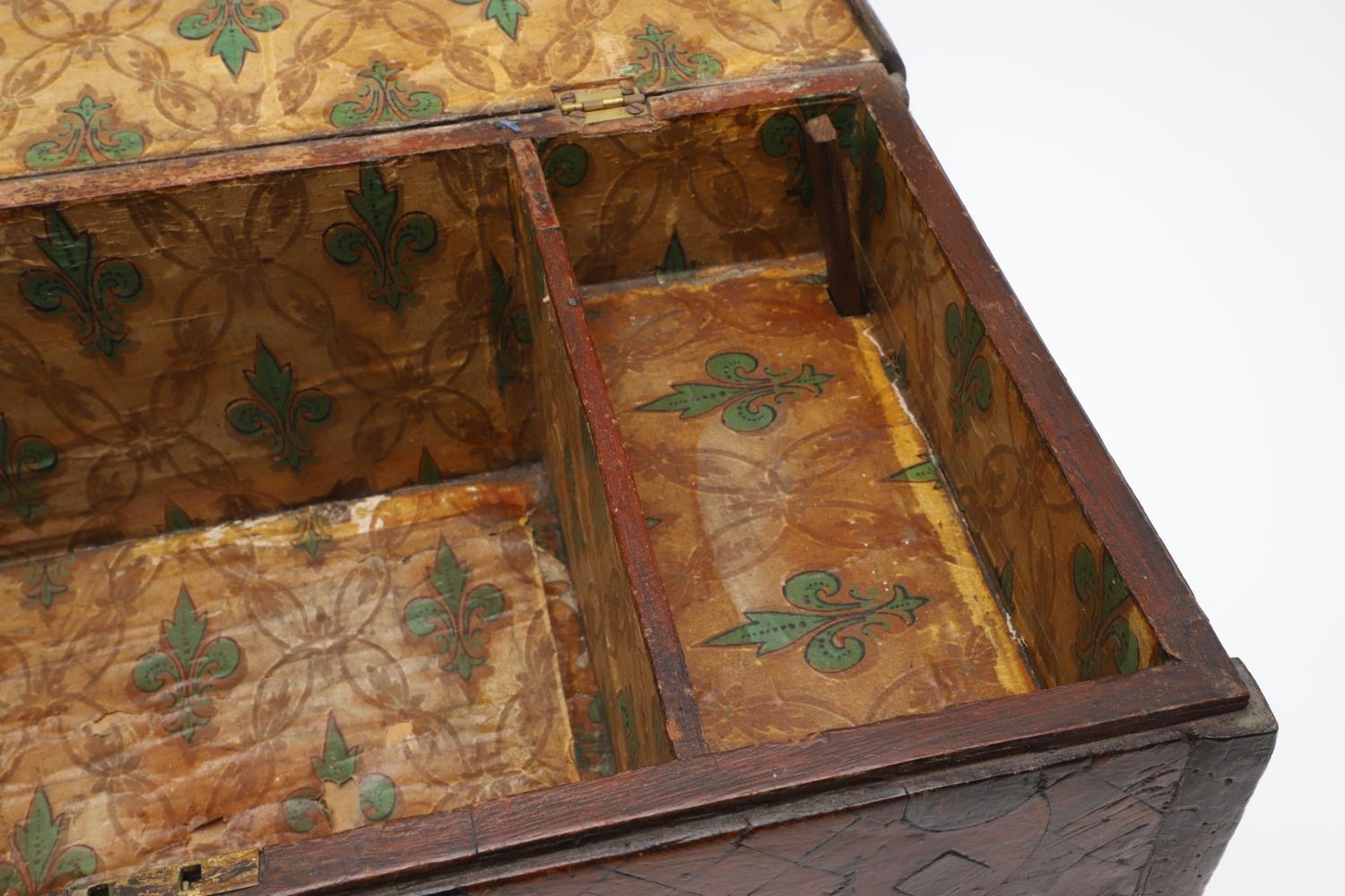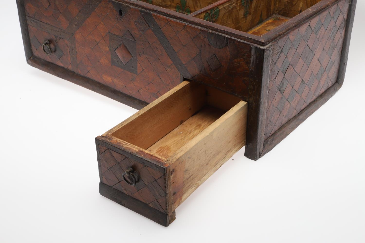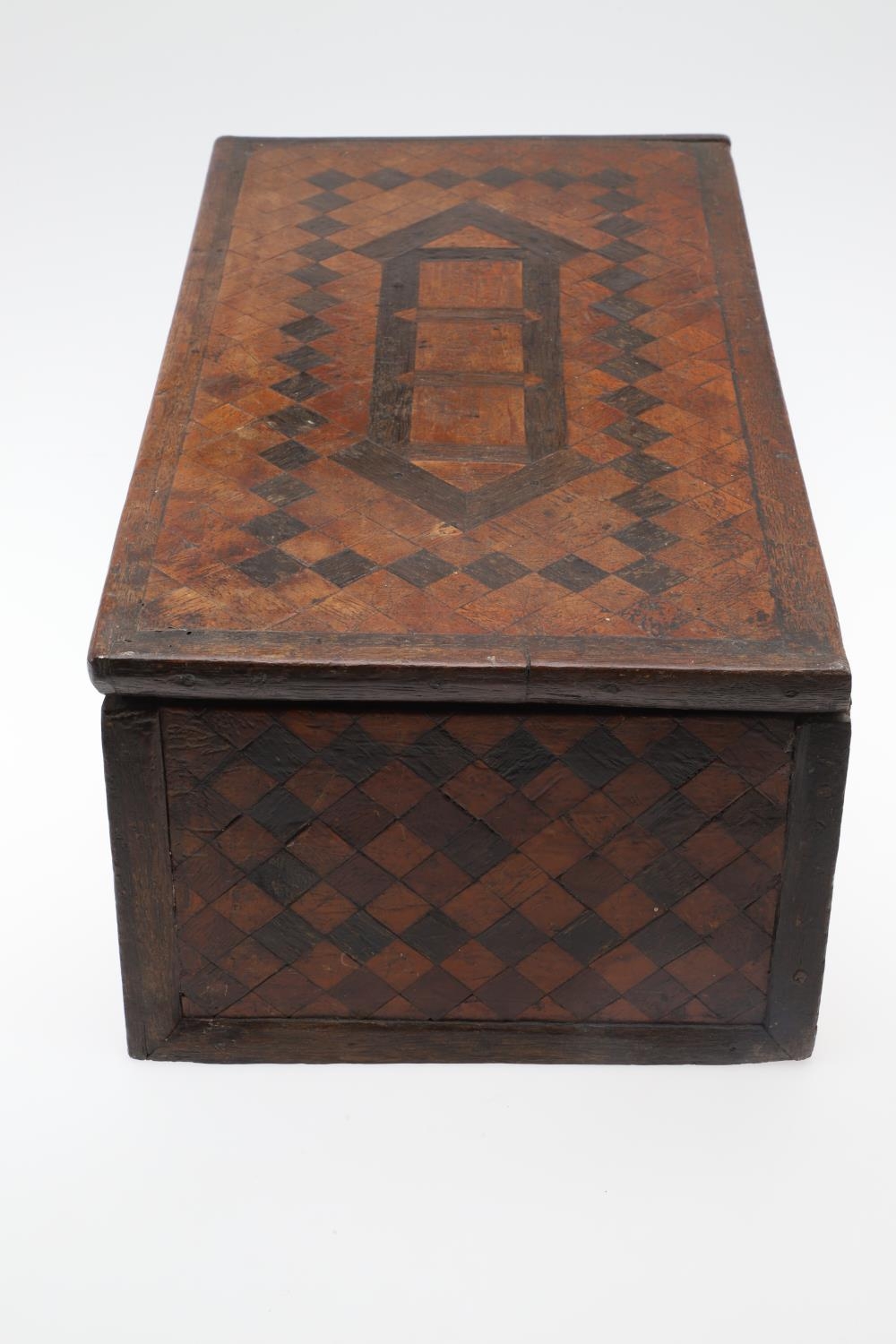 AN ANTIQUE CONTINENTAL PARQUETRY BOX. the hinged lid enclosing a fleur de lys patterned paper lined interior, single compartment with drawer below, locked with wooden peg, height 18cm, width 46cm, depth 25cm.