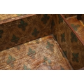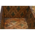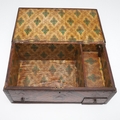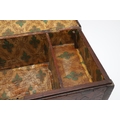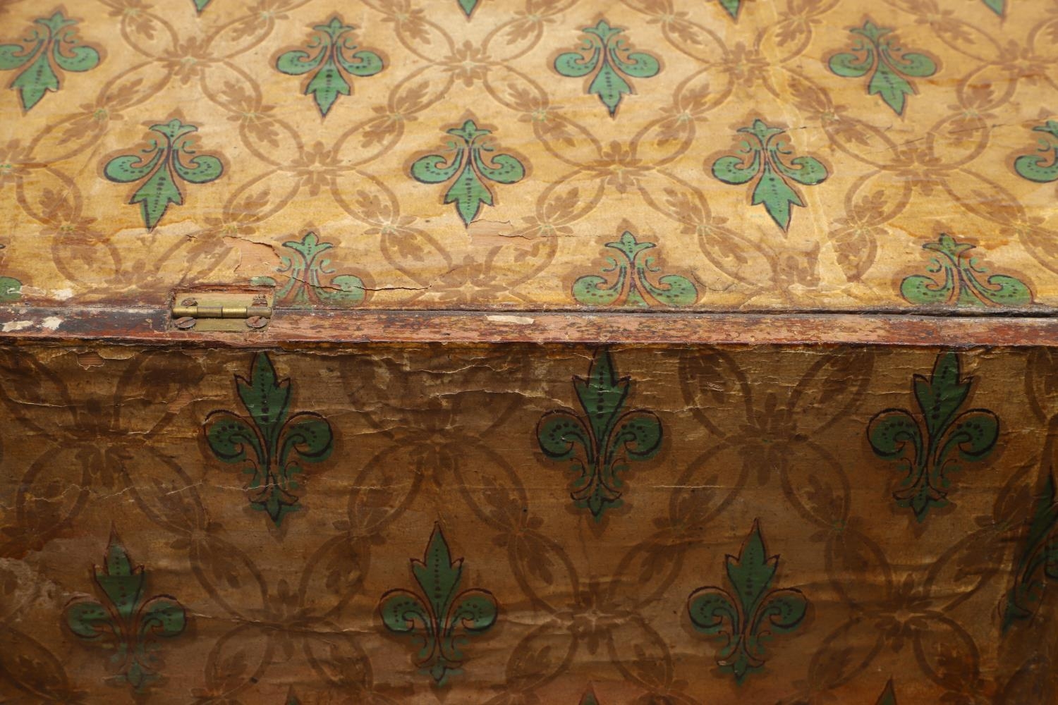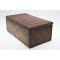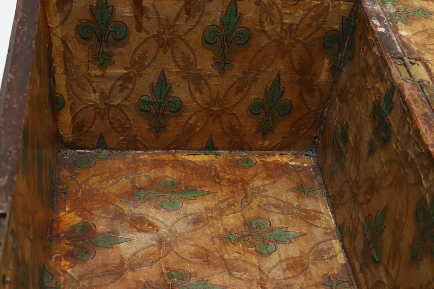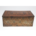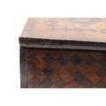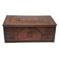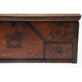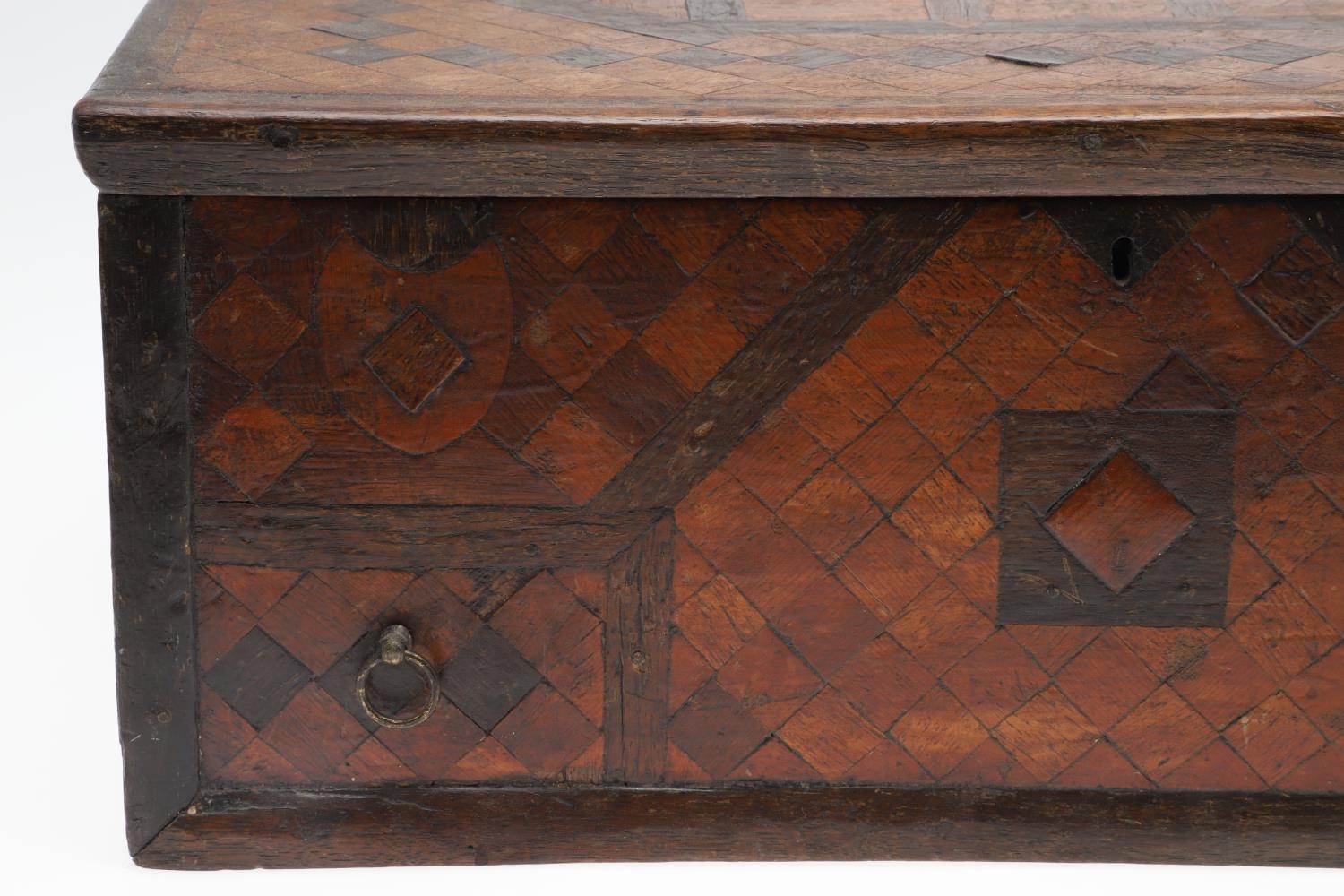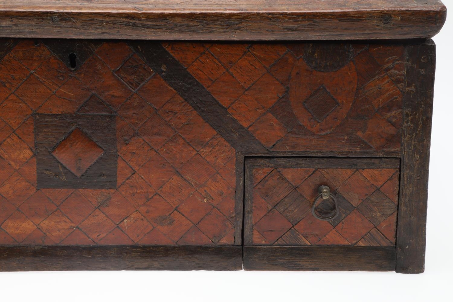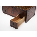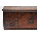 AN ANTIQUE CONTINENTAL PARQUETRY BOX. the hinged lid enclosing a fleur de lys patterned paper lined interior, single compartment with drawer below, locked with wooden peg, height 18cm, width 46cm, depth 25cm.