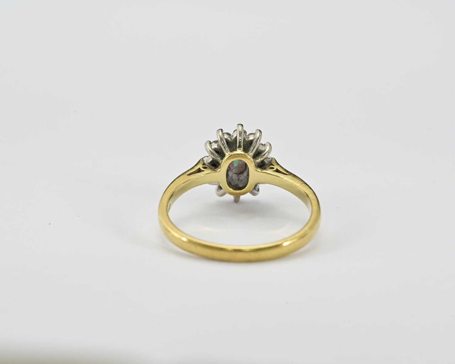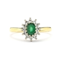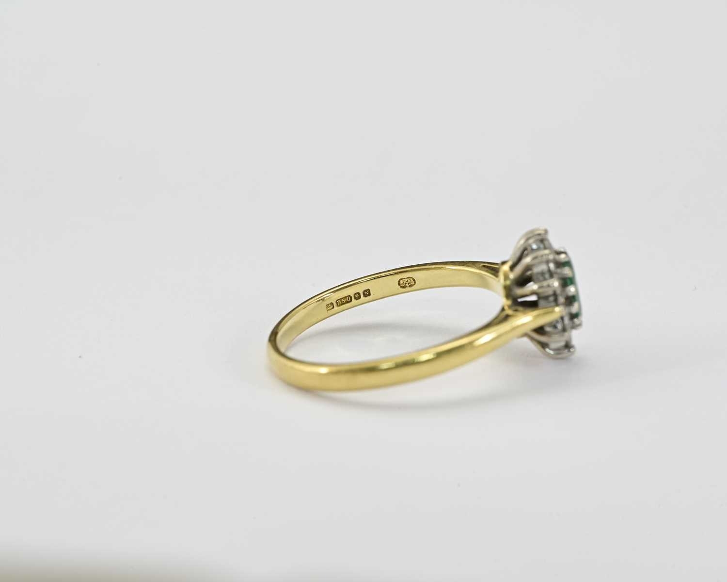 An 18ct gold emerald and brilliant-cut diamond cluster ring, estimated total diamond weight 0.25ct, hallmarks for London, 1981, ring size N, 3.5g.
