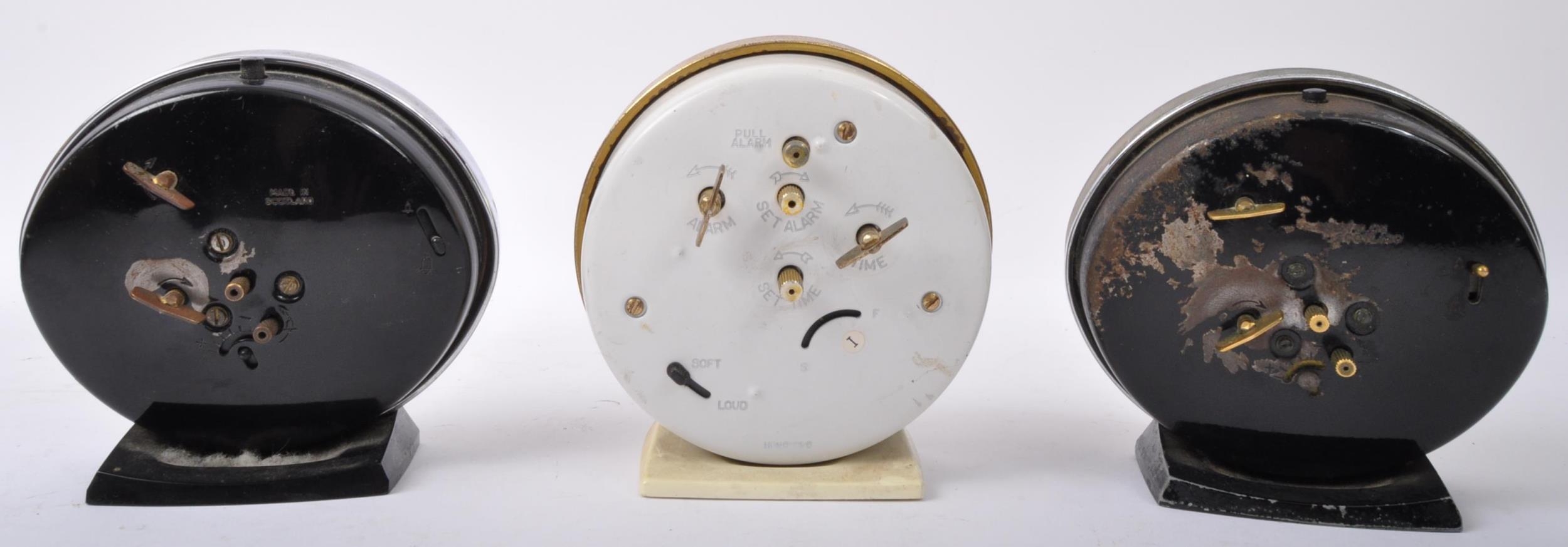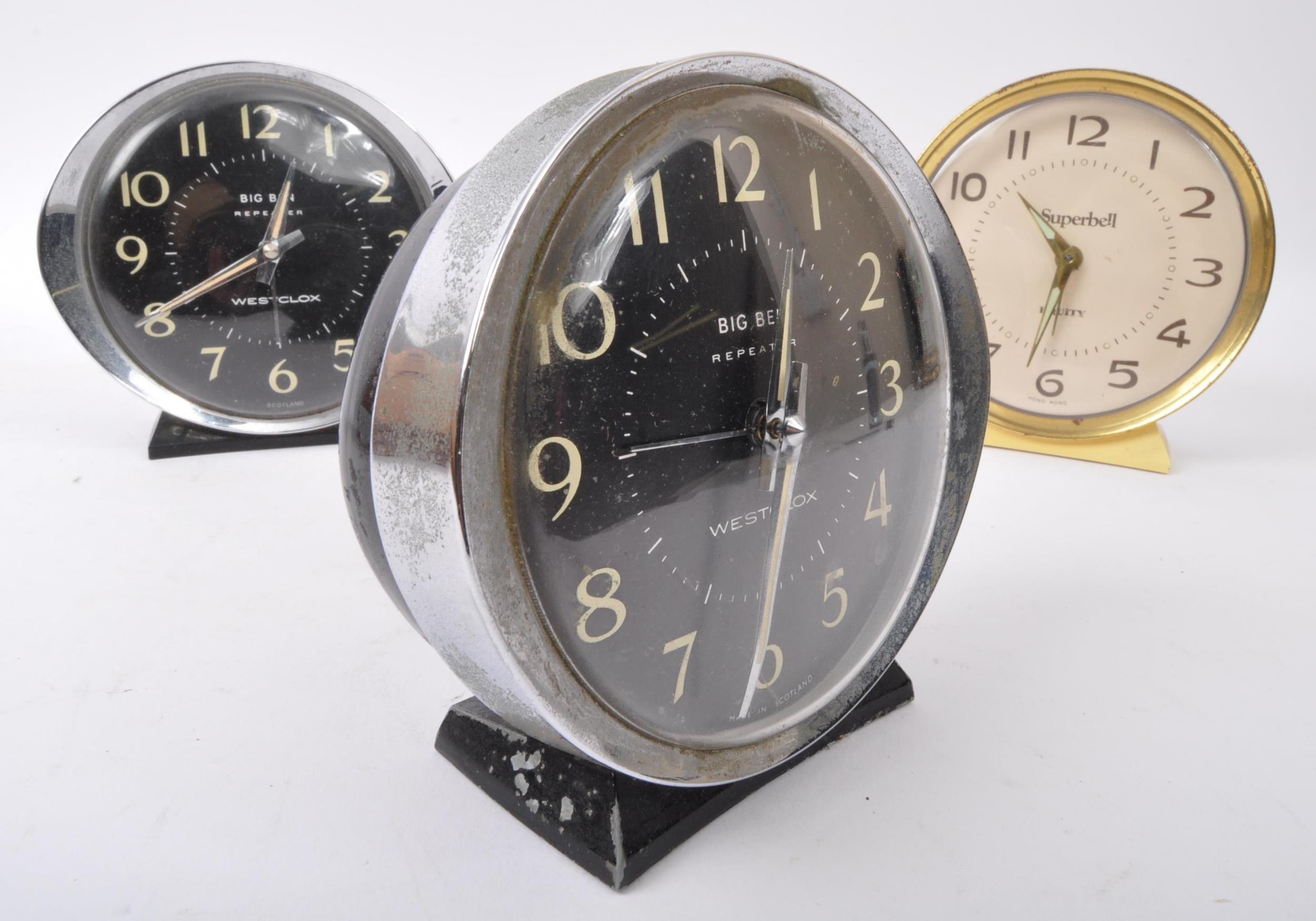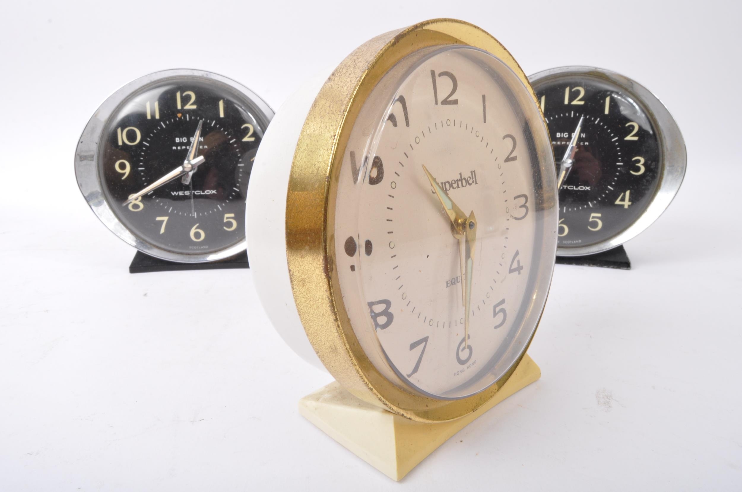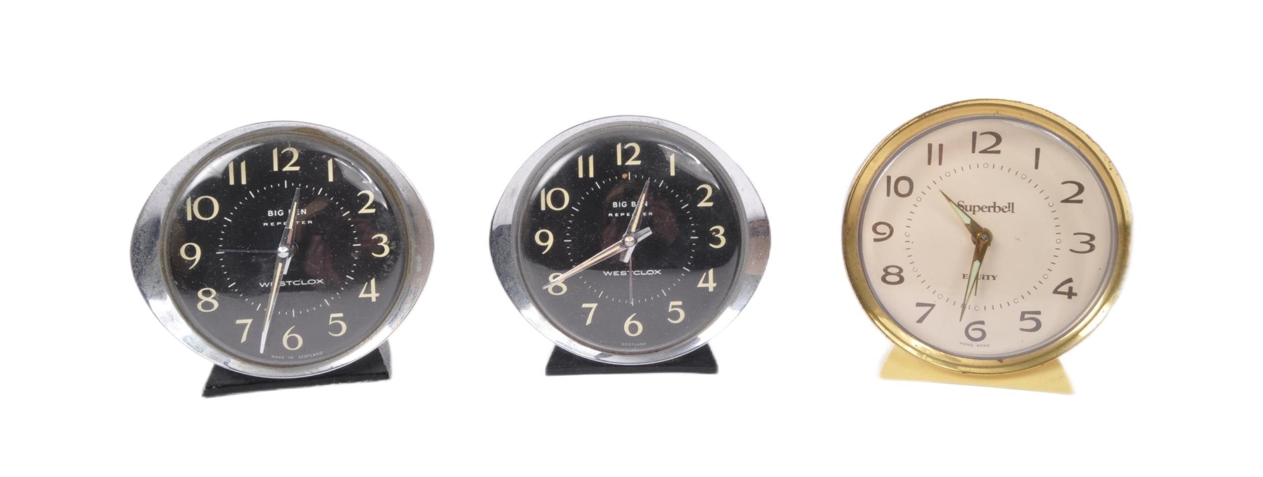 A collection of three vintage mid 20th century clocks to include a Superbell accompanied by two Westclox clocks. Measures 13cm tall.