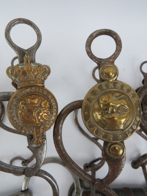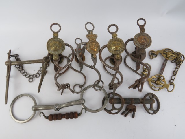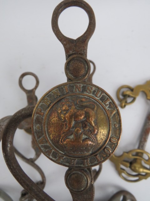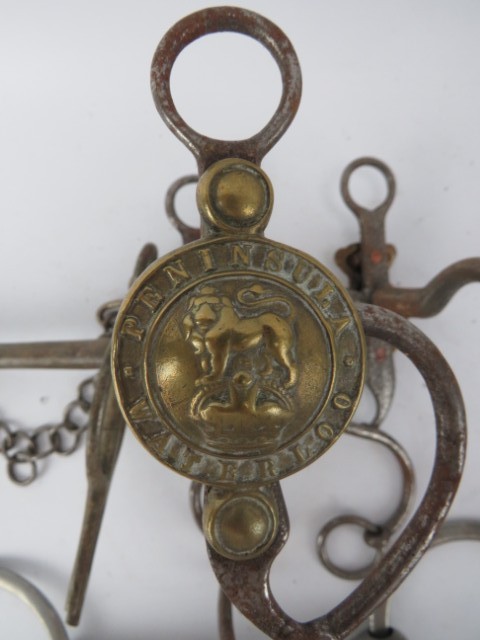 A group of British military cavalry brass and steel horse bits and related items, 19th century. (9 items)
