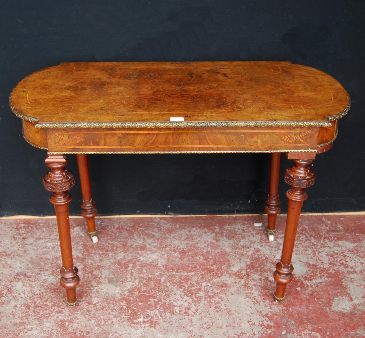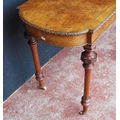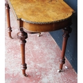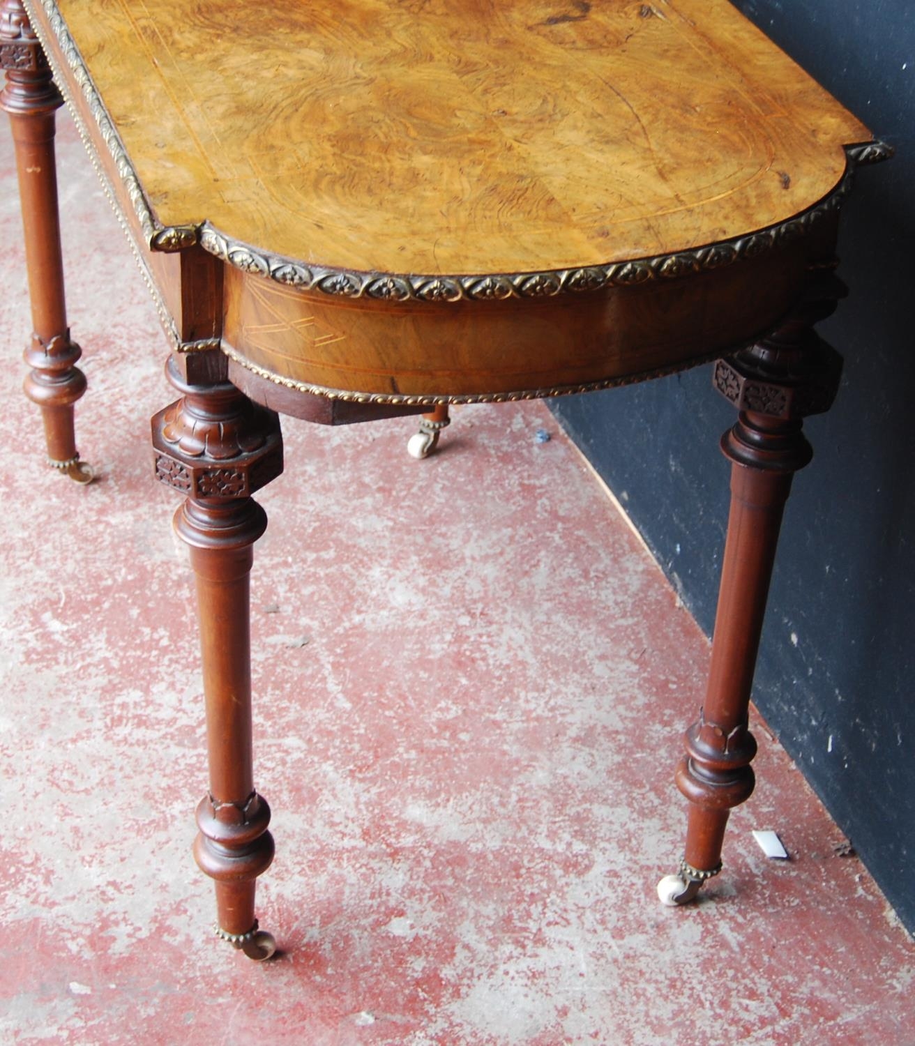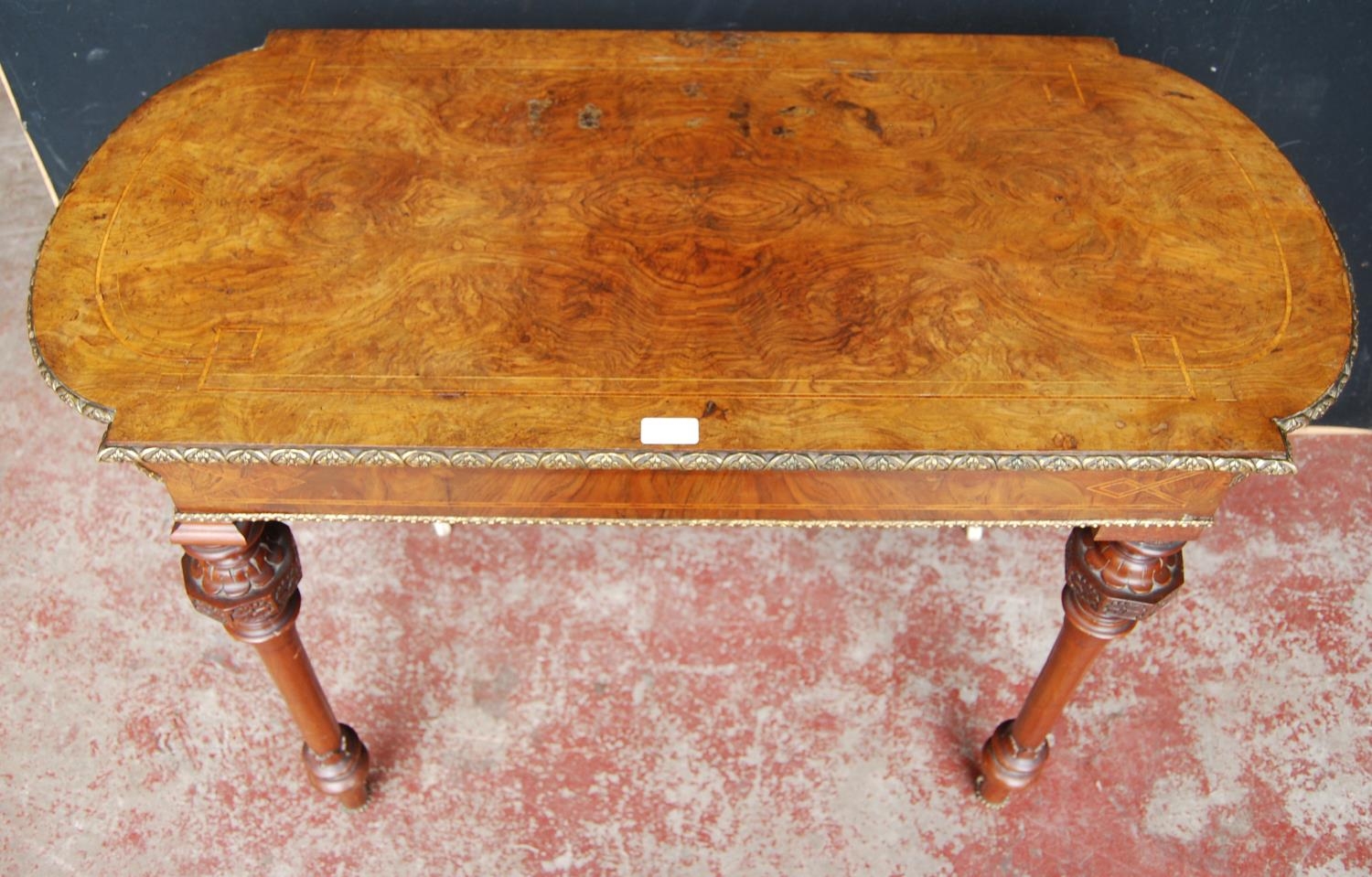 19th century French inlaid burr walnut hall table, the D-end top above an inlaid frieze decorated with gilt metal beading, on turned legs with ceramic castors, 73cm high, 105cm wide and 53cm deep.