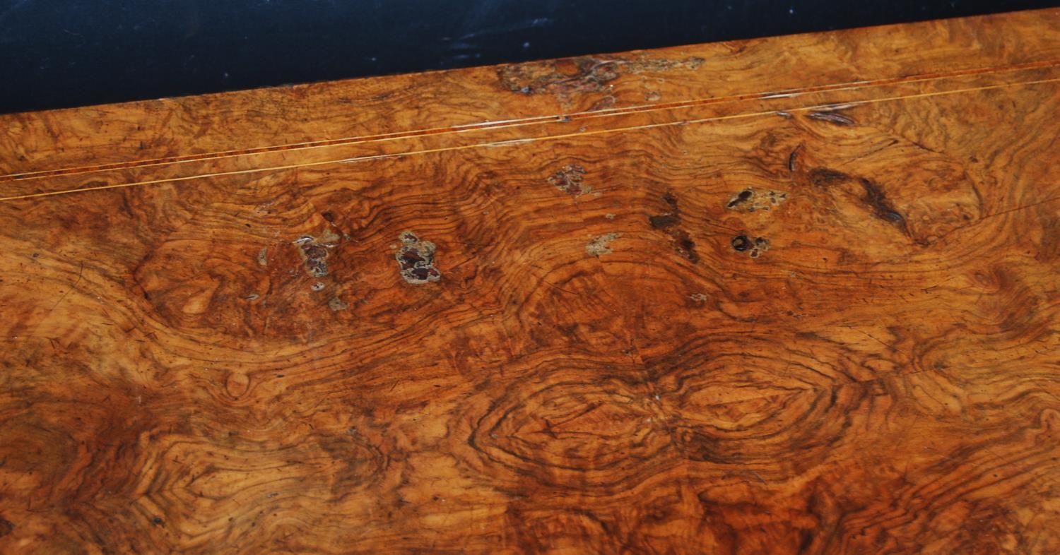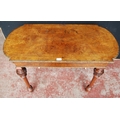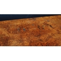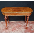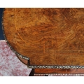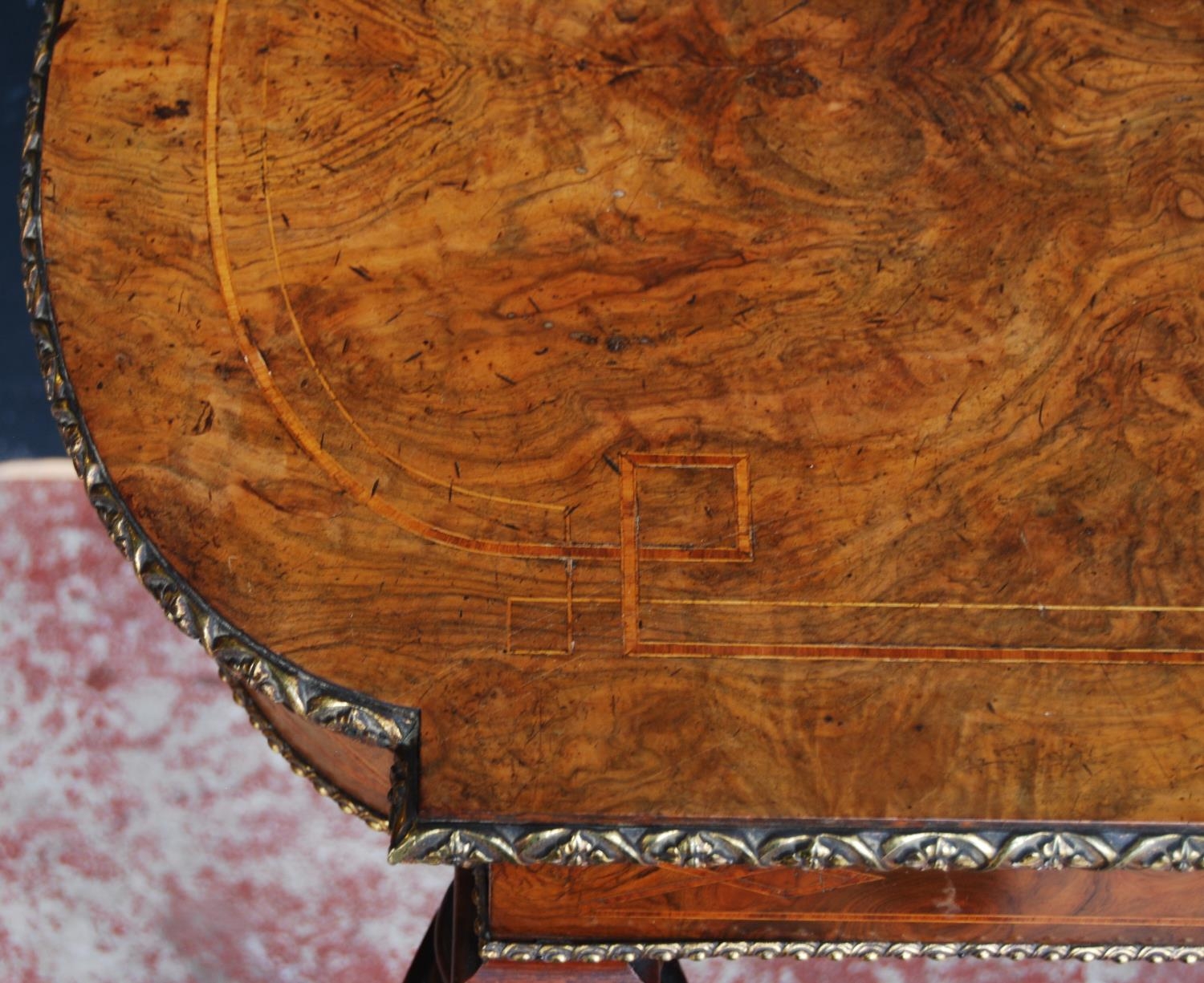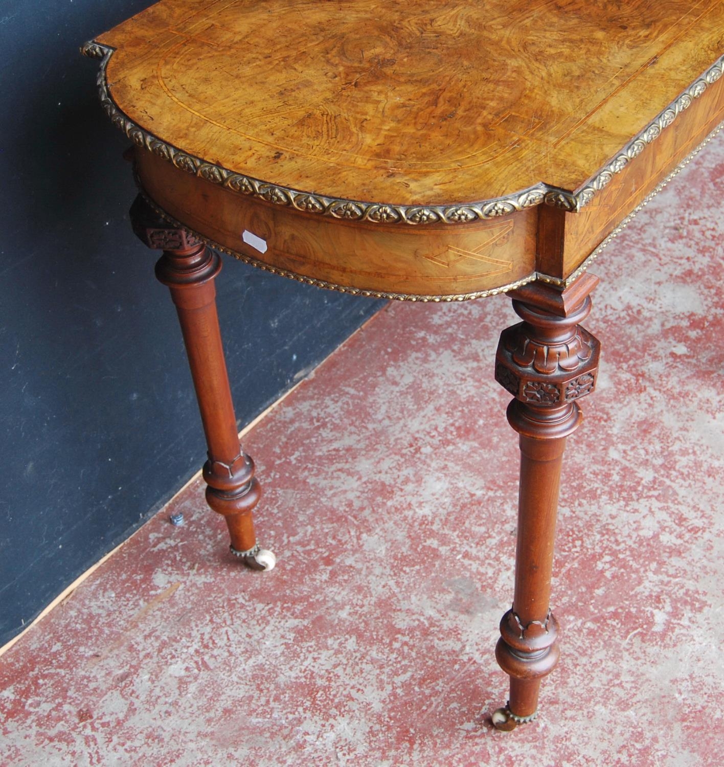 19th century French inlaid burr walnut hall table, the D-end top above an inlaid frieze decorated with gilt metal beading, on turned legs with ceramic castors, 73cm high, 105cm wide and 53cm deep.