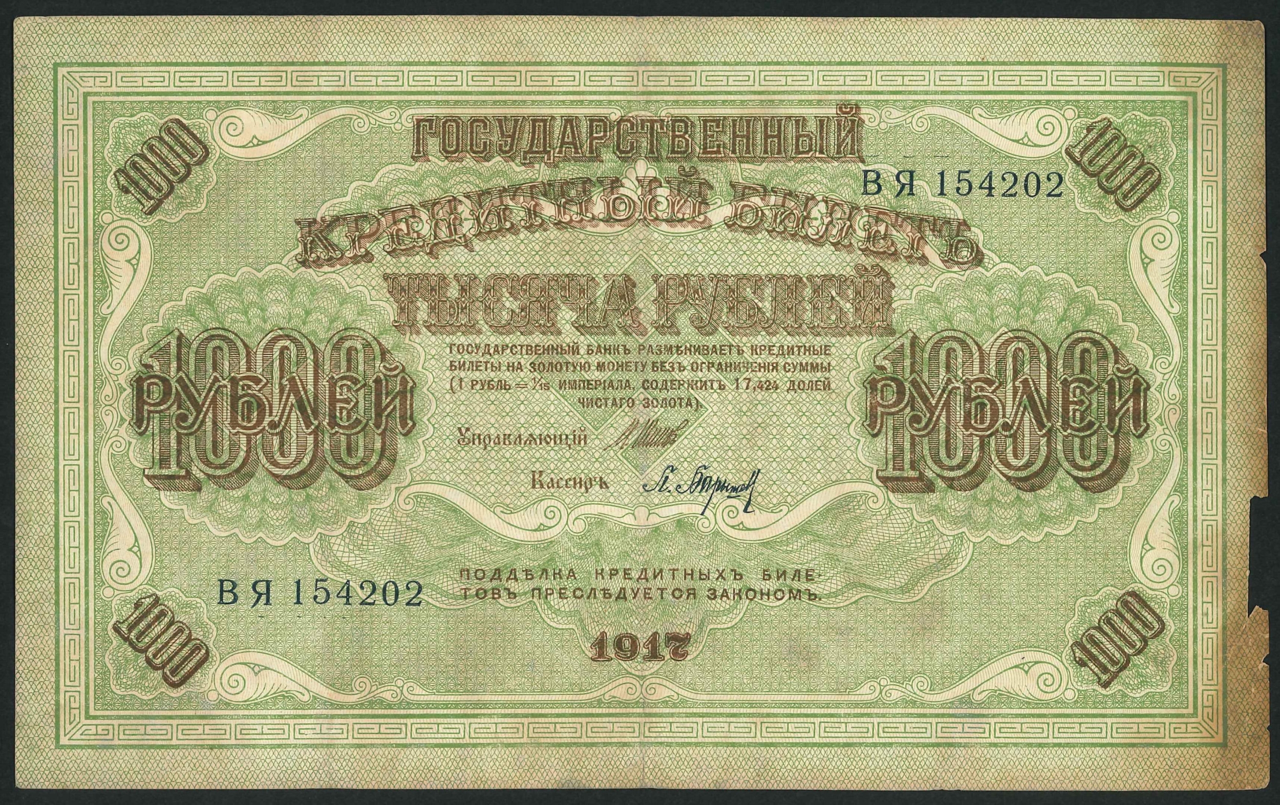 Banknotes; Russia; 1917 1,000r generally VF but bad at right, Krause 37. (214x133mm).