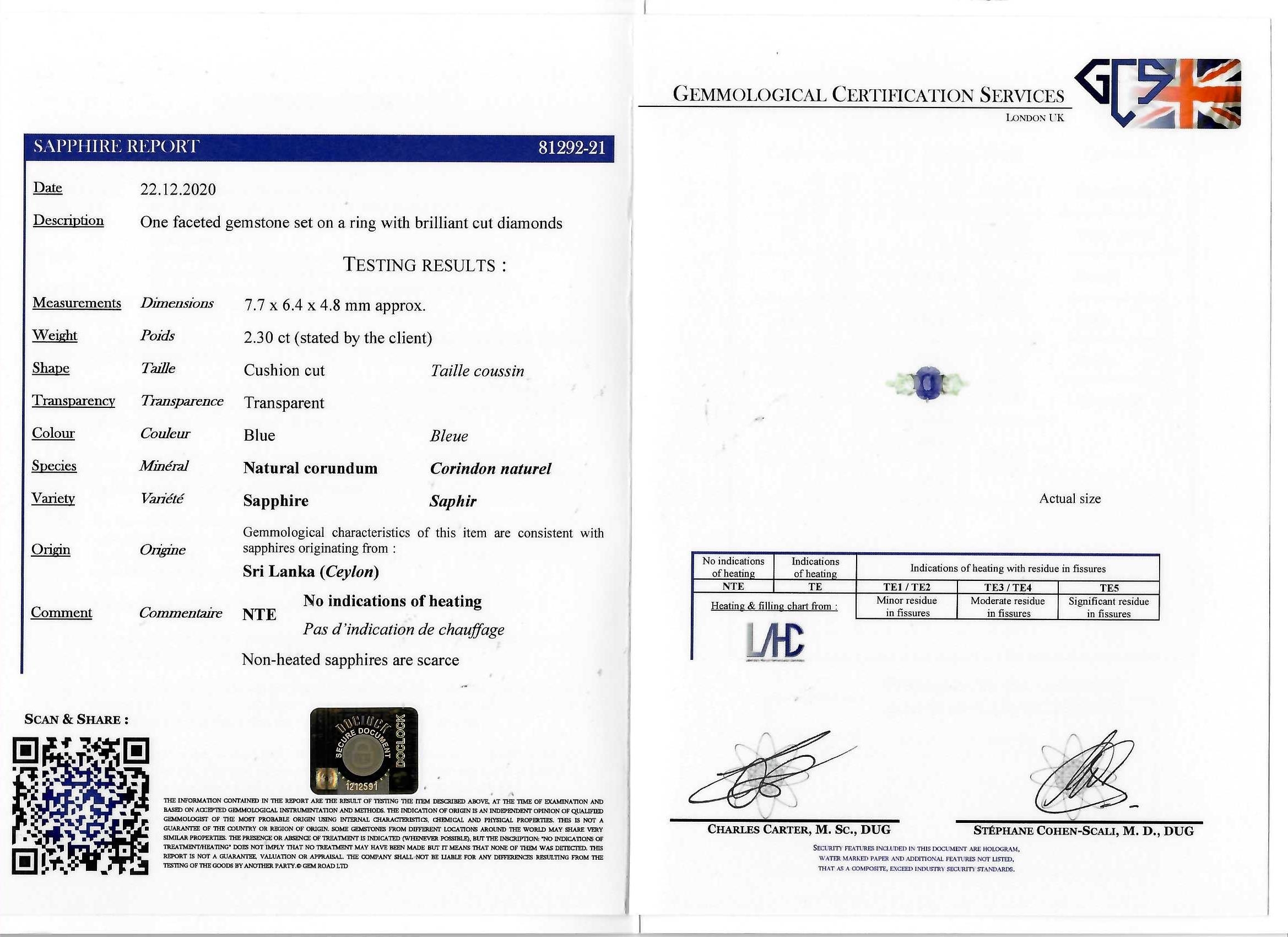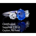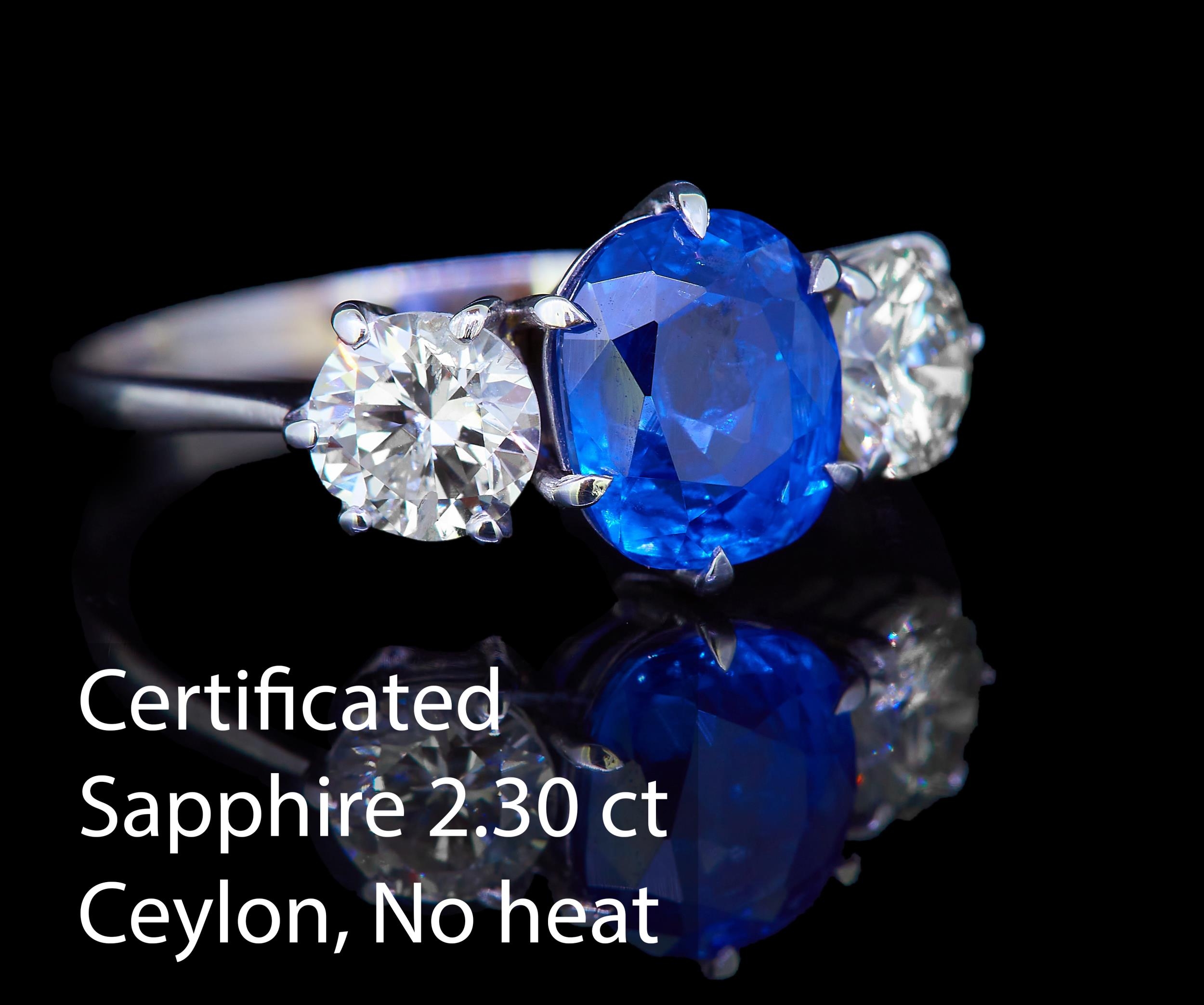 CERTIFICATED SAPPHIRE AND DIAMOND 3-STONE RING, set with a central blue sapphire of approx. 2.30 ct. Flanked with a diamond on each side, totalling approx. 1 ct. Size N. 3.1 grams. Accompanied by GCS London report No. 81292-21 stating that the sapphire is Natural, Ceylon origin, No indications of heating.