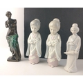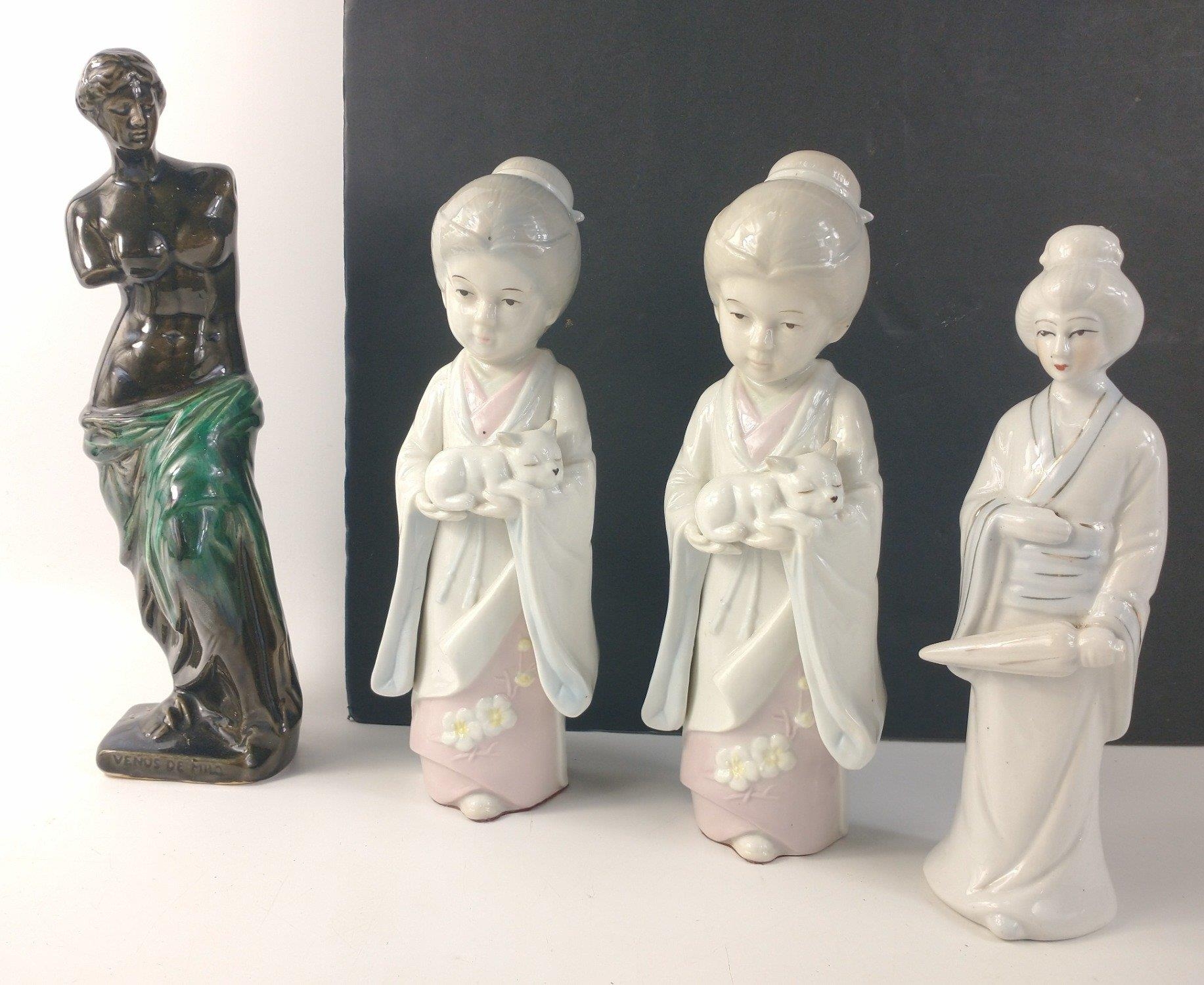 A selection of four ceramic figurines to include a Venus di Milo figure (approx H27cm), two delicately painted Japanese Geishas carrying a dog in their arms (approx. H25cm) and a Japanese Geisha carrying a parasol (approx. H23cm).