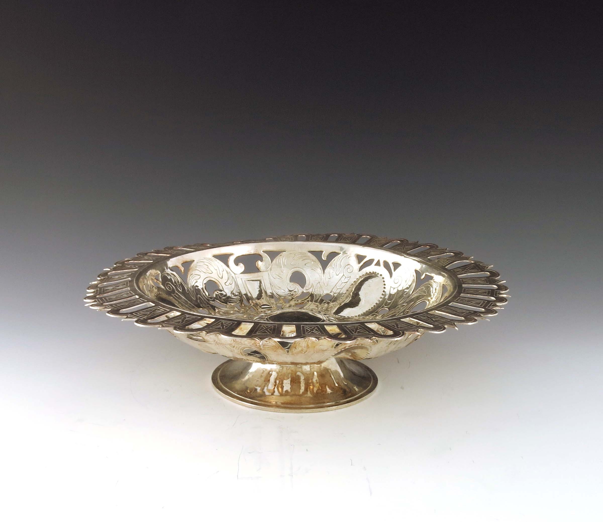 Duchess of Sutherland's Cripples Guild, an Arts and Crafts silver plated bowl, circa 1910, reticulated and engraved Alms dish form on splayed foot, decorated in the Mannerist style with winged cartouches, foliate scrolls and an arcade of panelled and ogee arched lappets, 33cm diameter