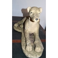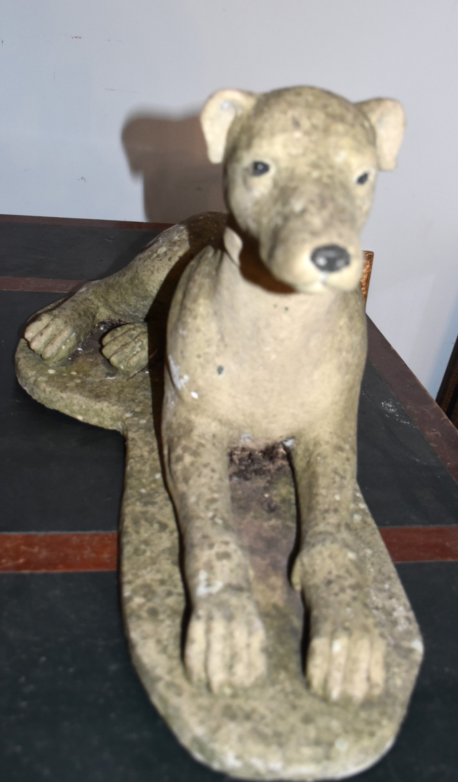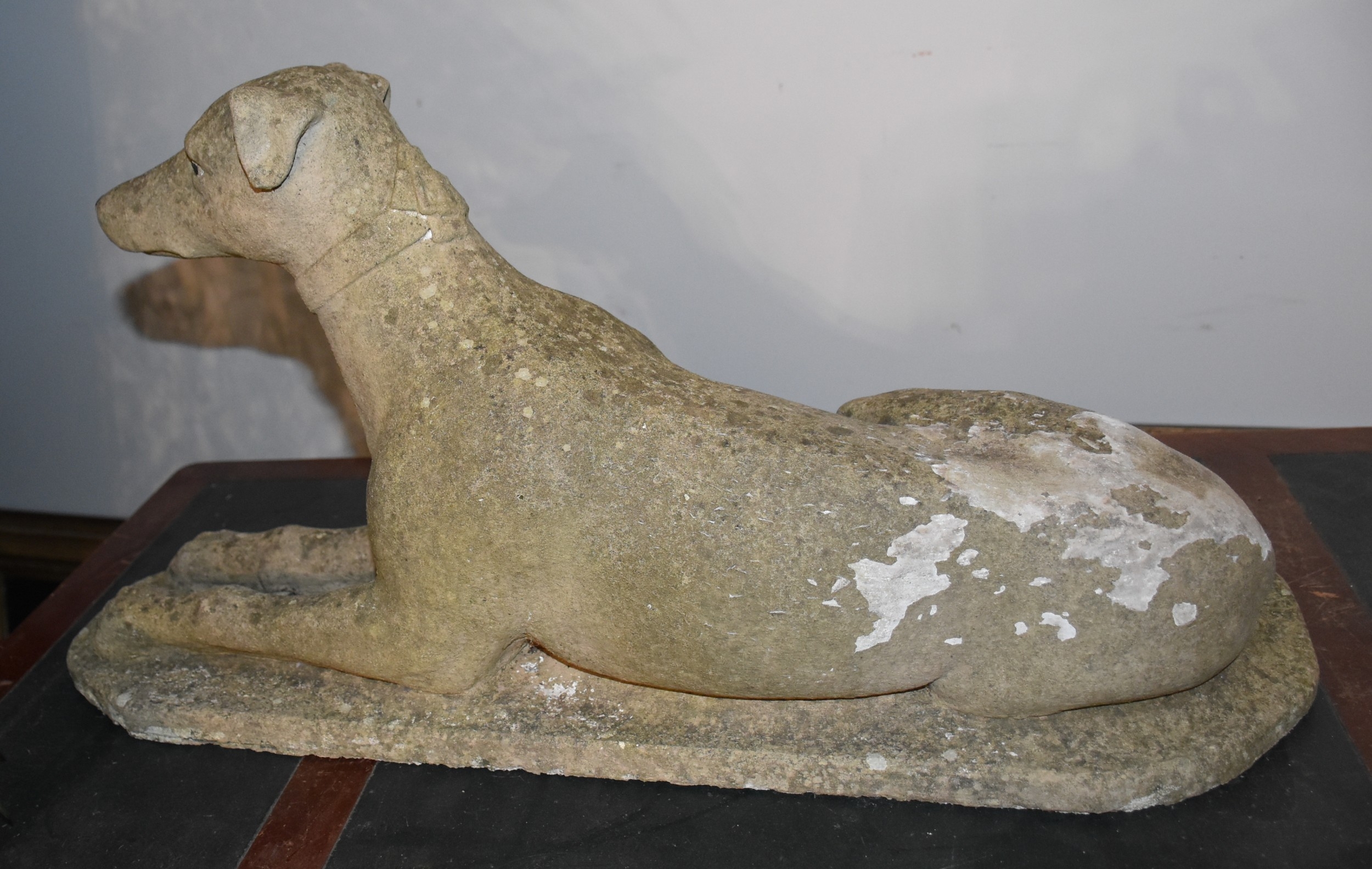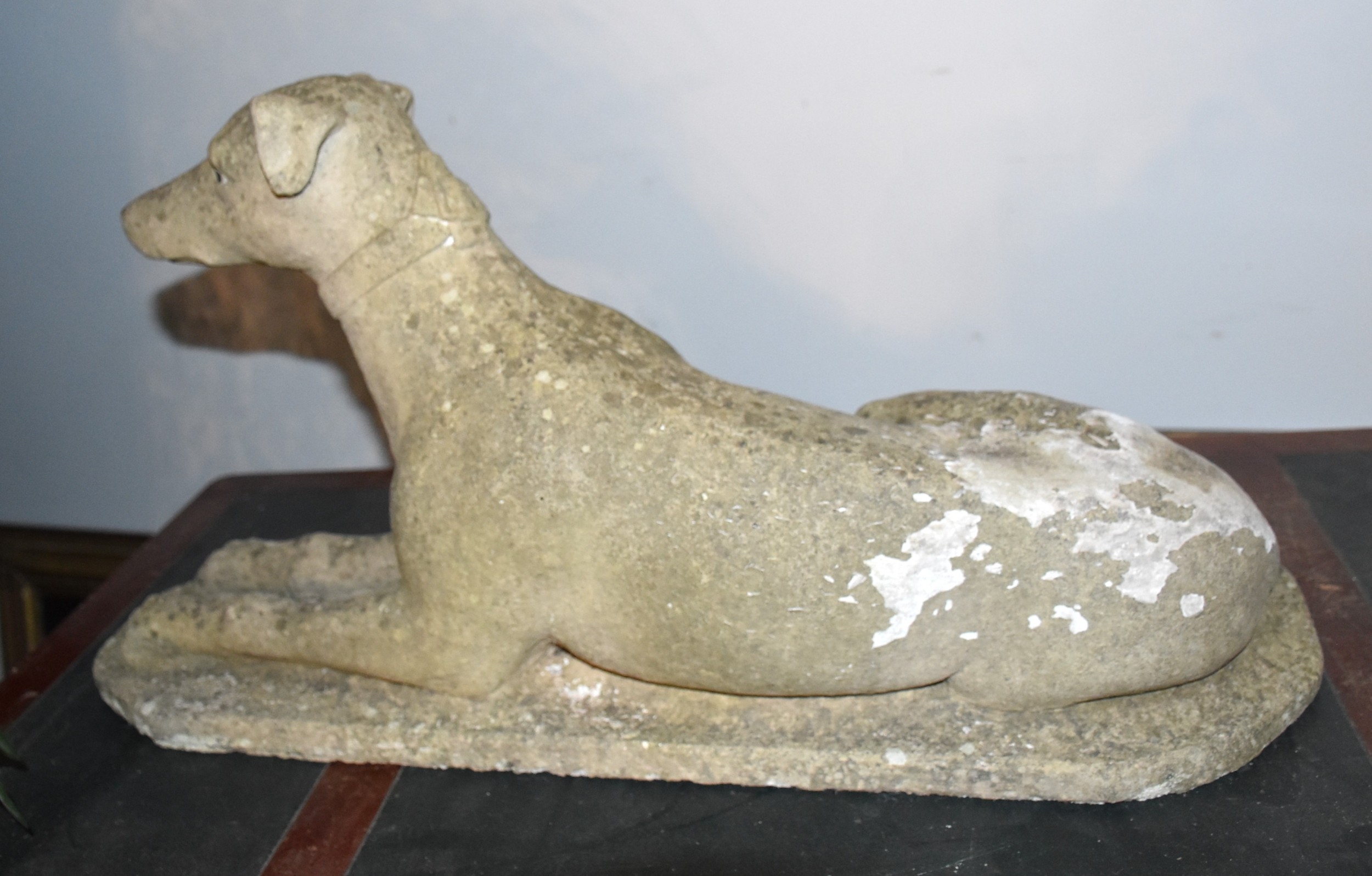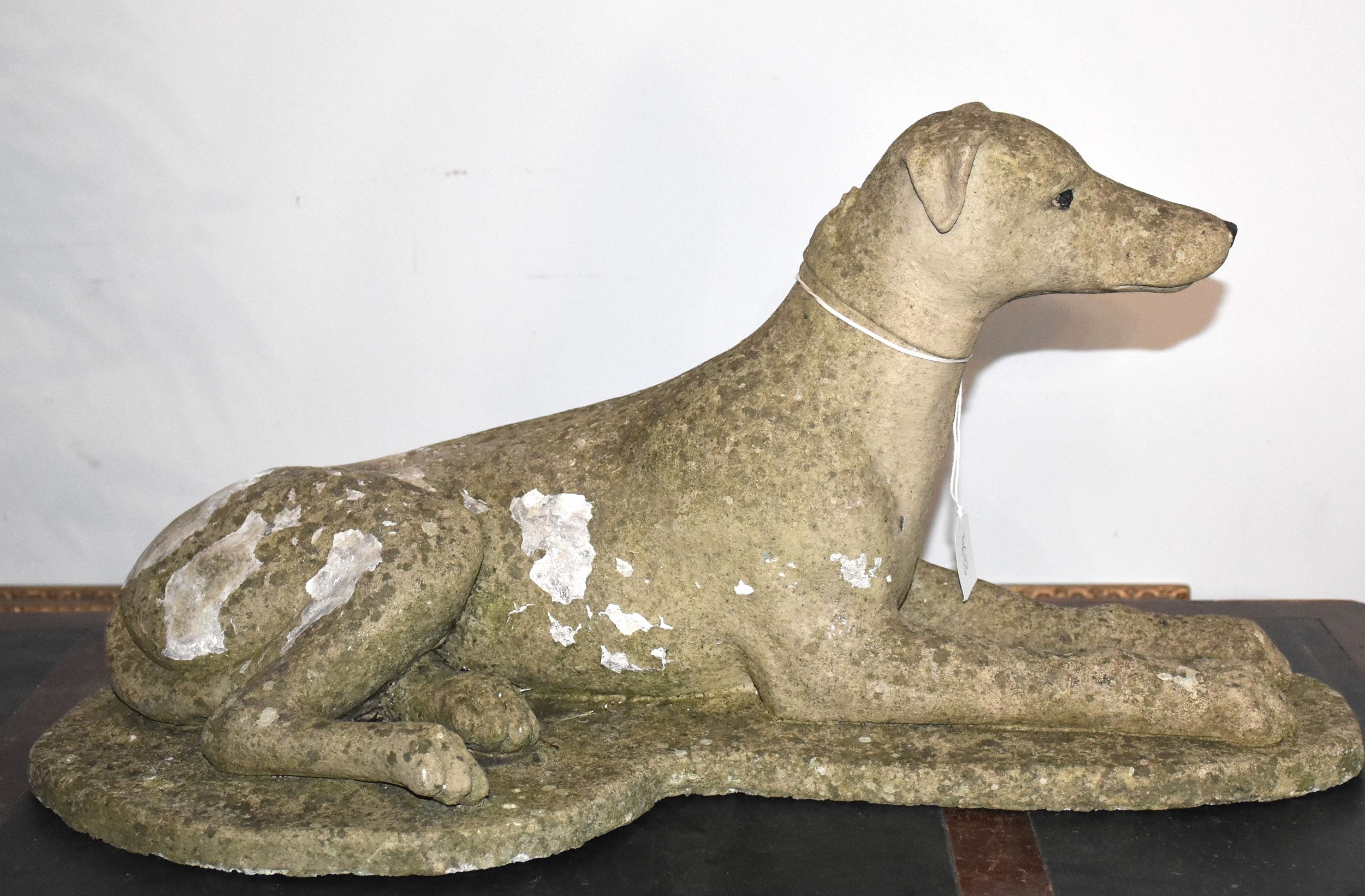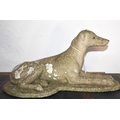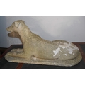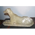 A cast concrete model of a greyhound laying down, on a plinth, 66cm long, 34cm high.