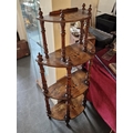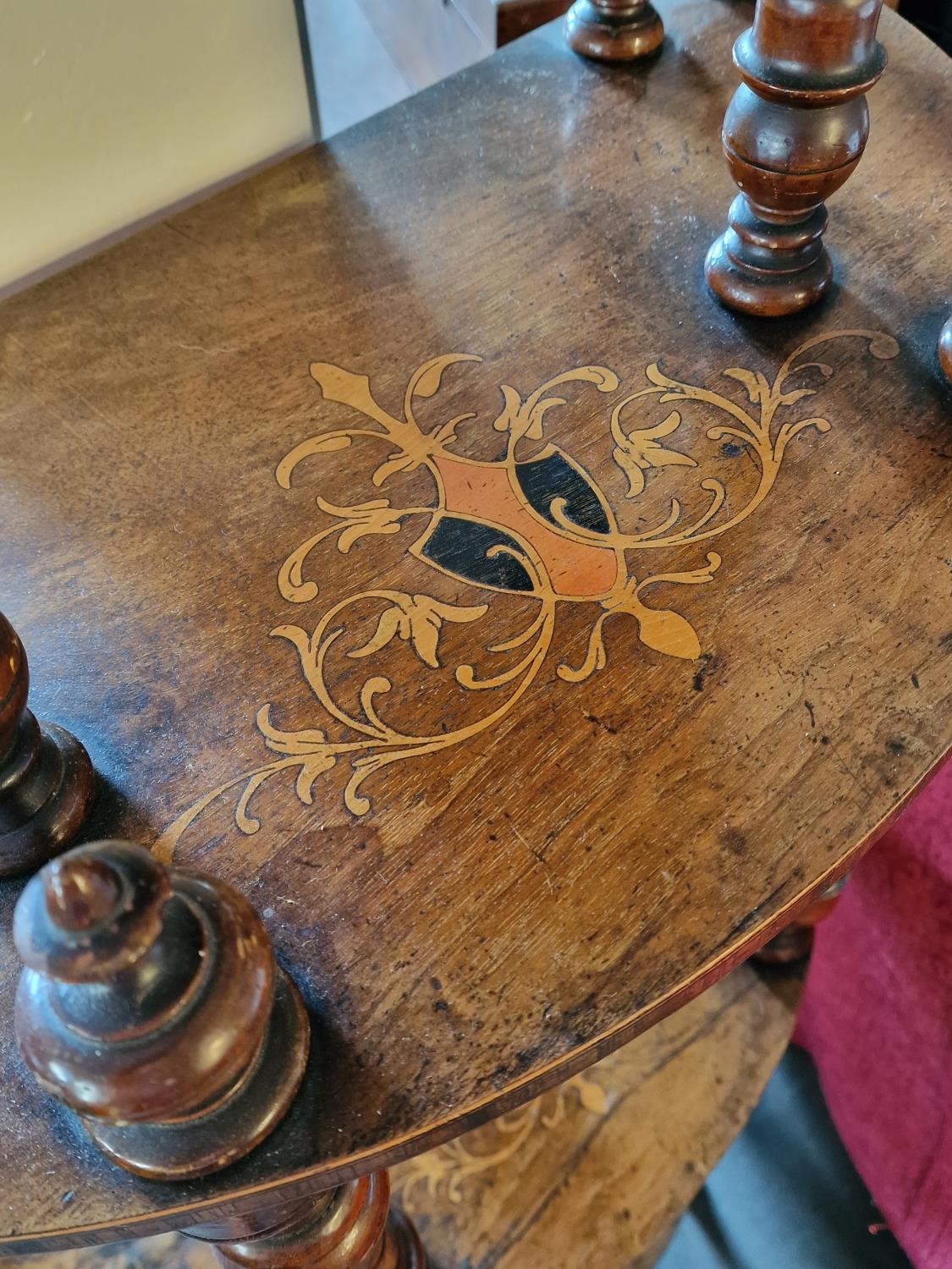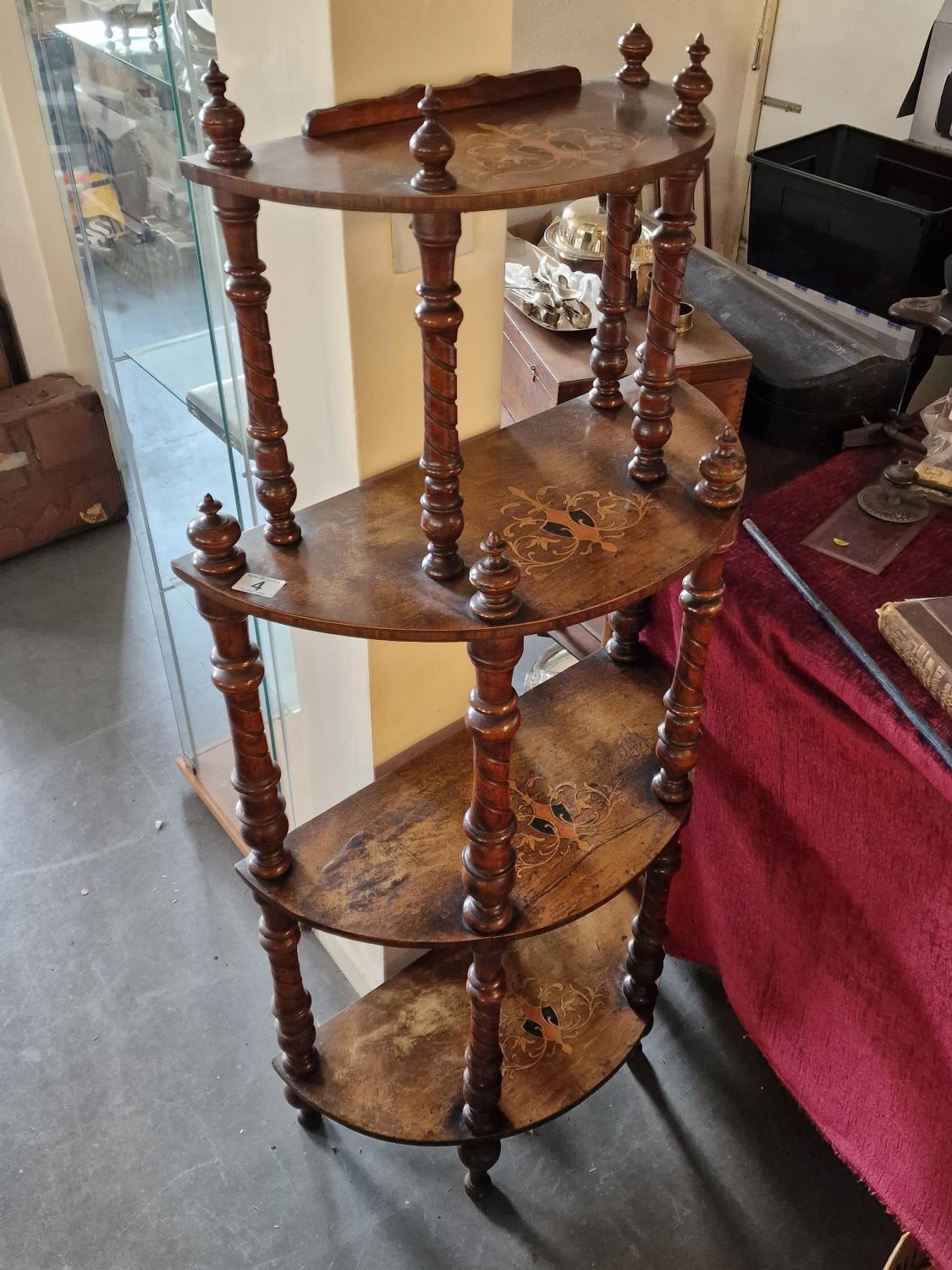 Antique Inlaid Wood Half-Moon What-Not Display Hall Unit with Finial Decoration - 133cm tall