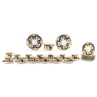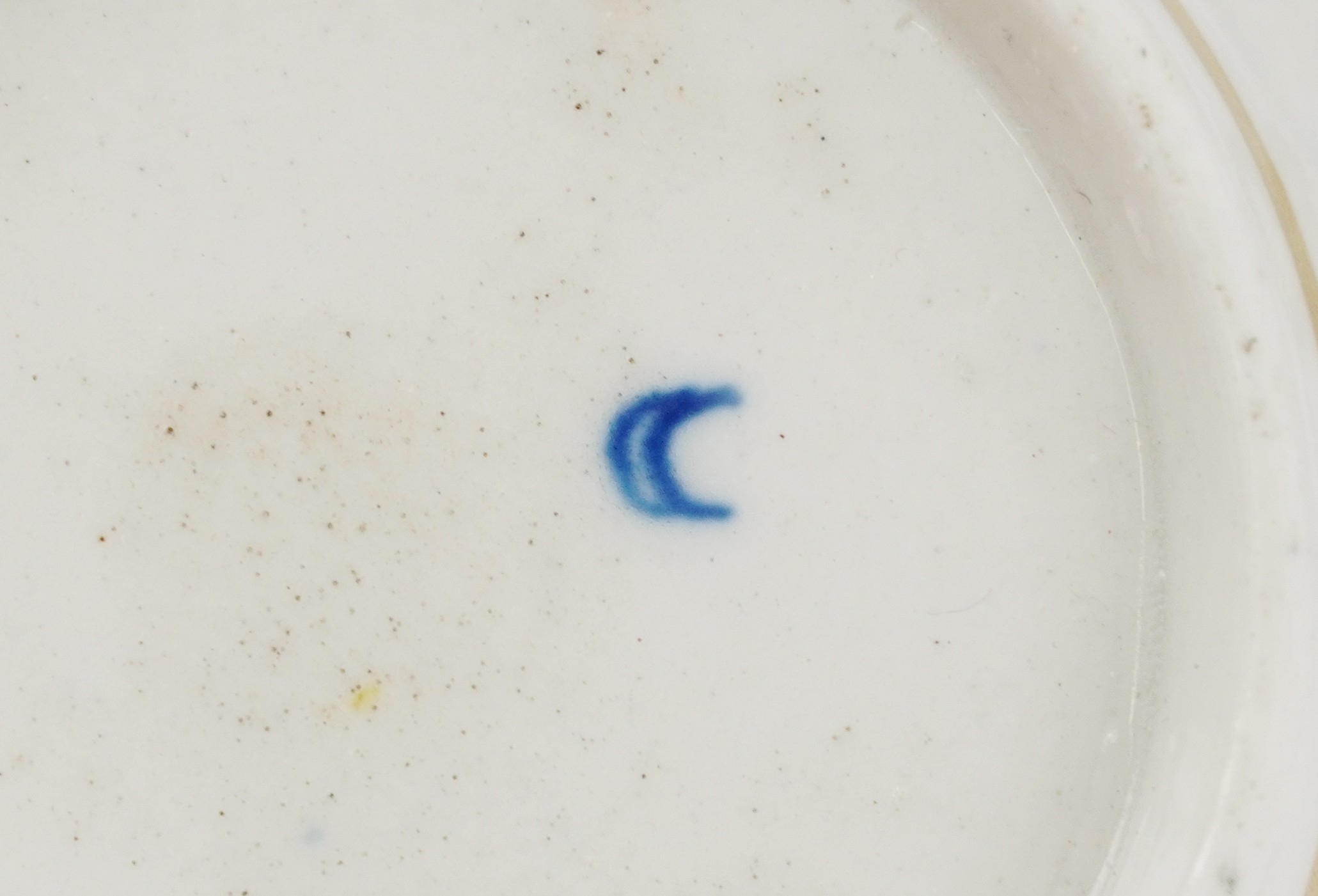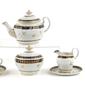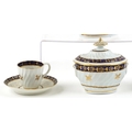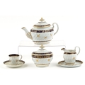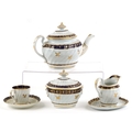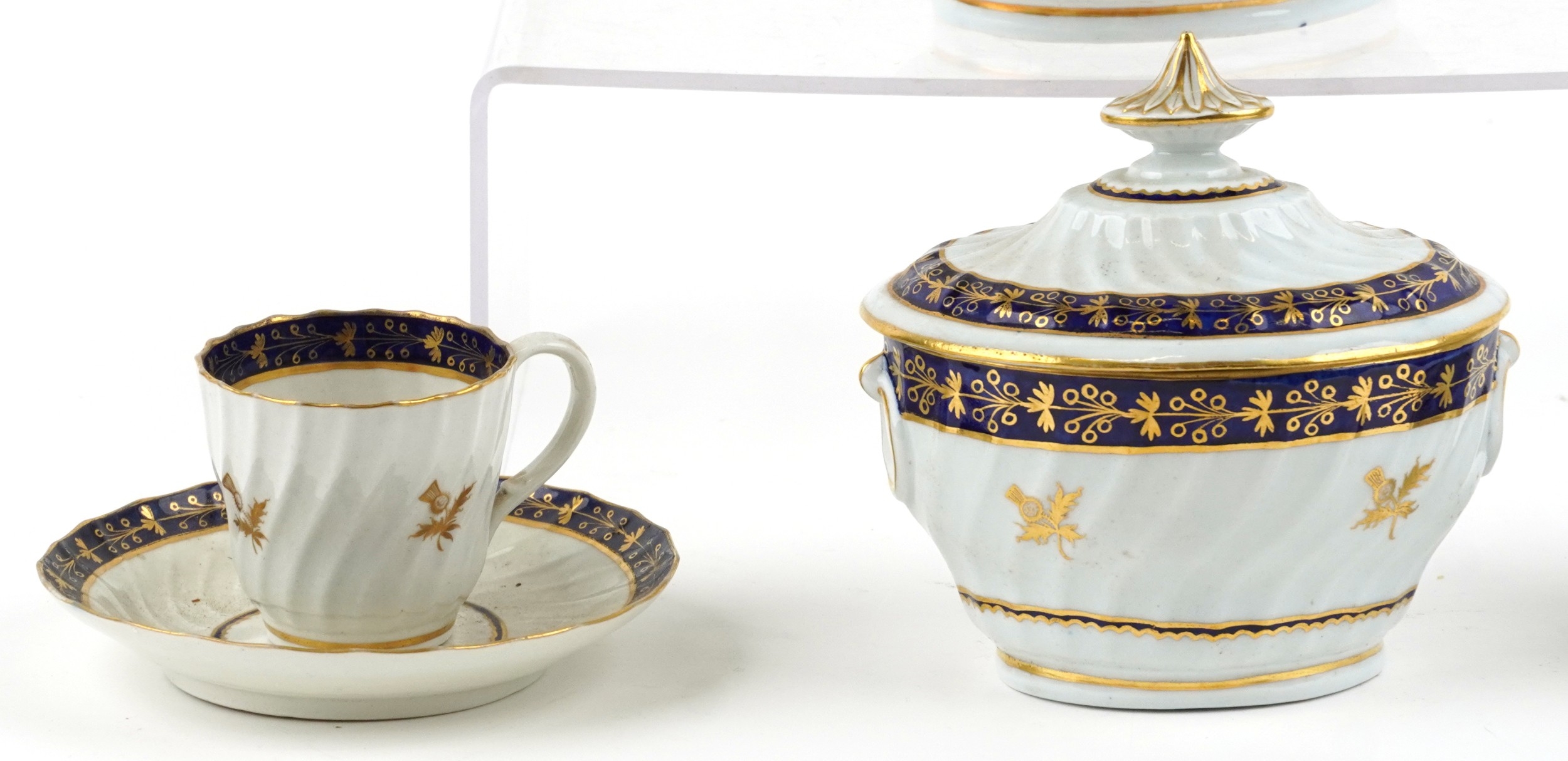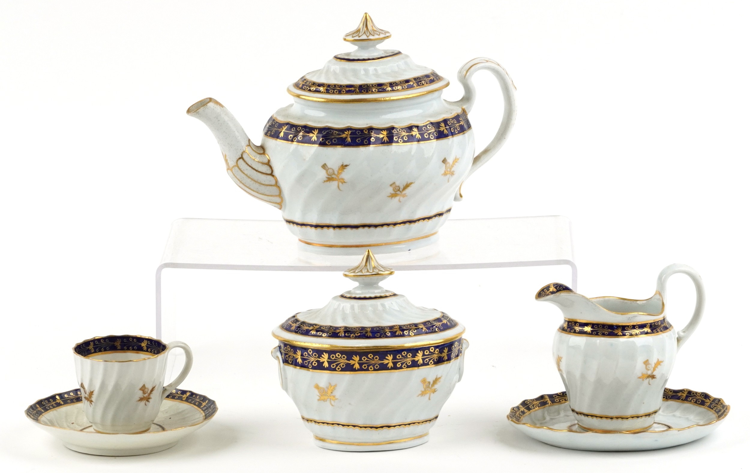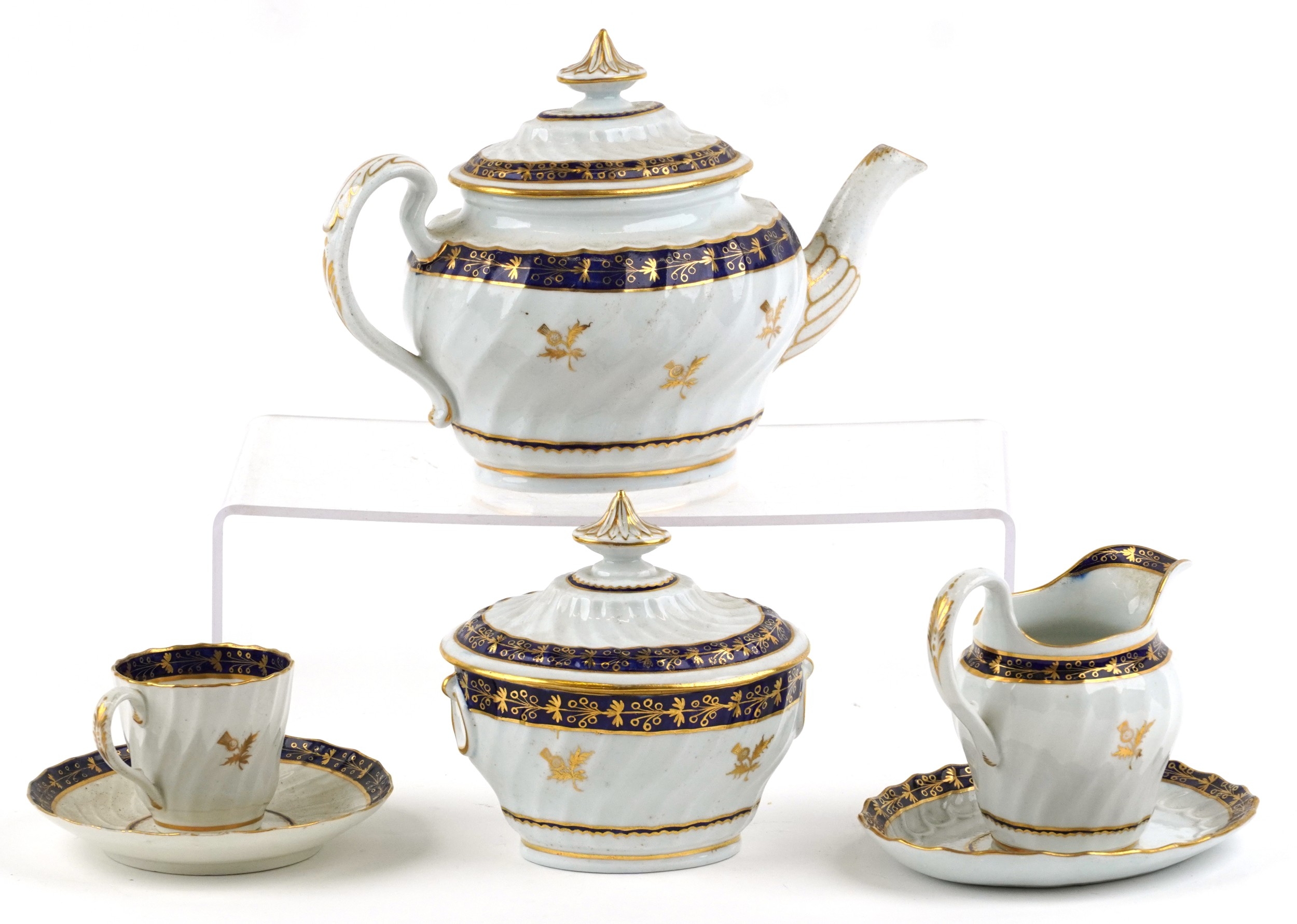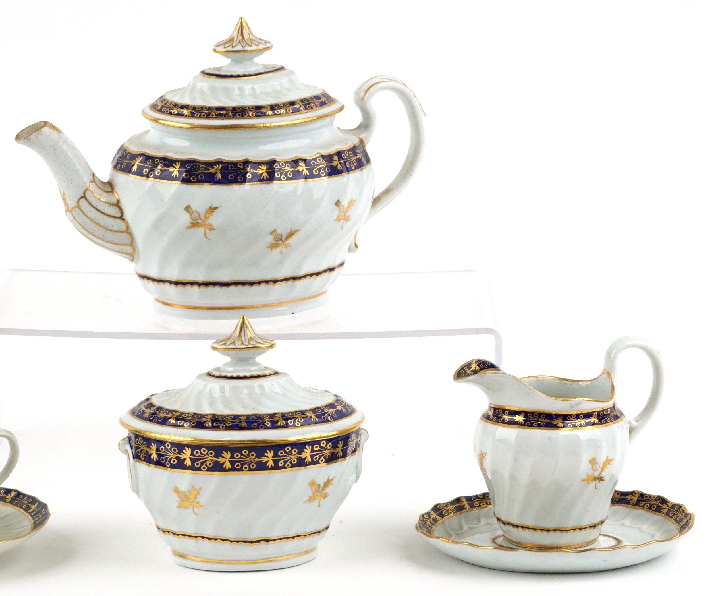 An early 19th century Royal Worcester part tea service with hand painted gilded thistle and cobalt blue bands including a coffee cup and saucer, teapot, sugar bowl and milk jug, the largest 25cm wide.