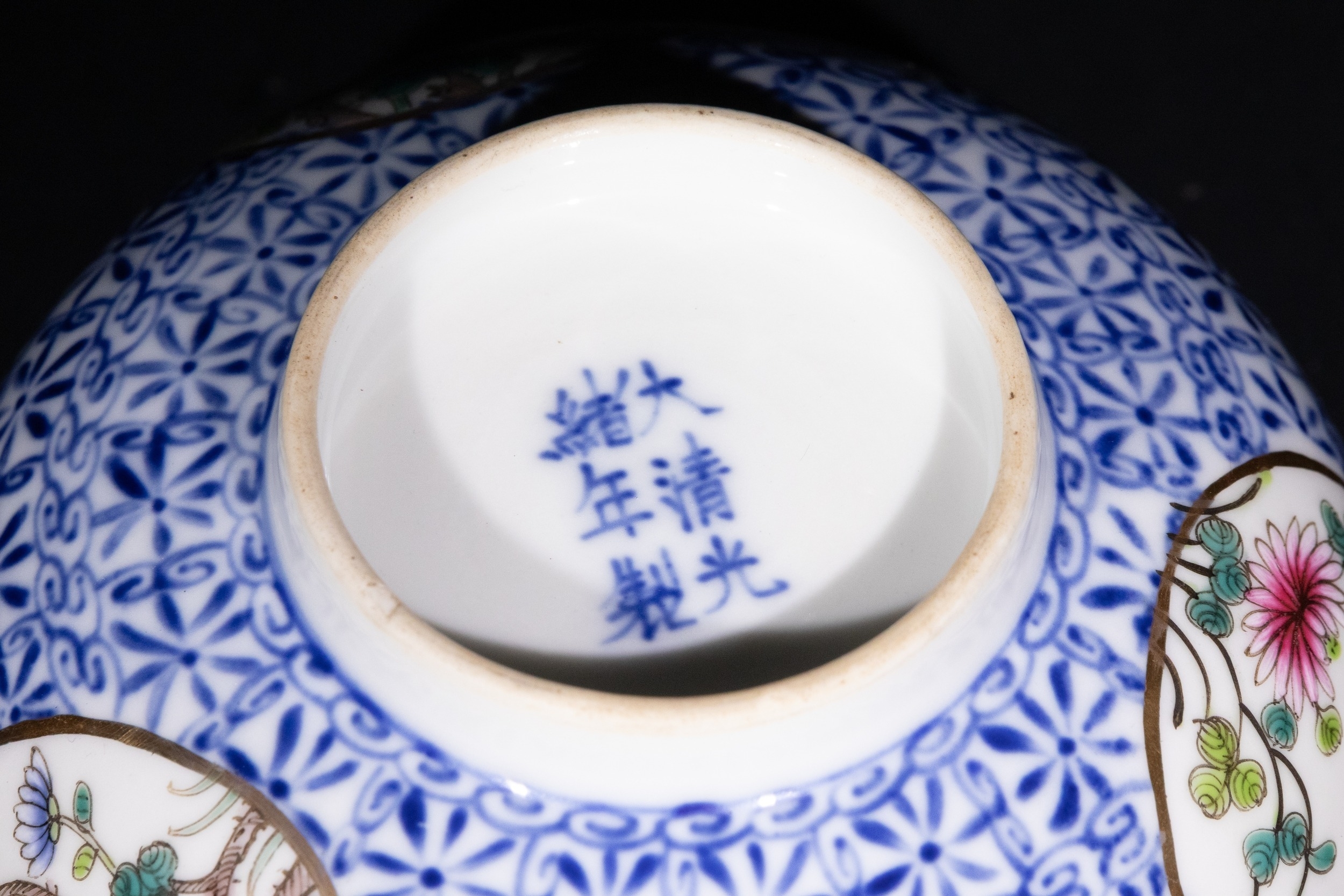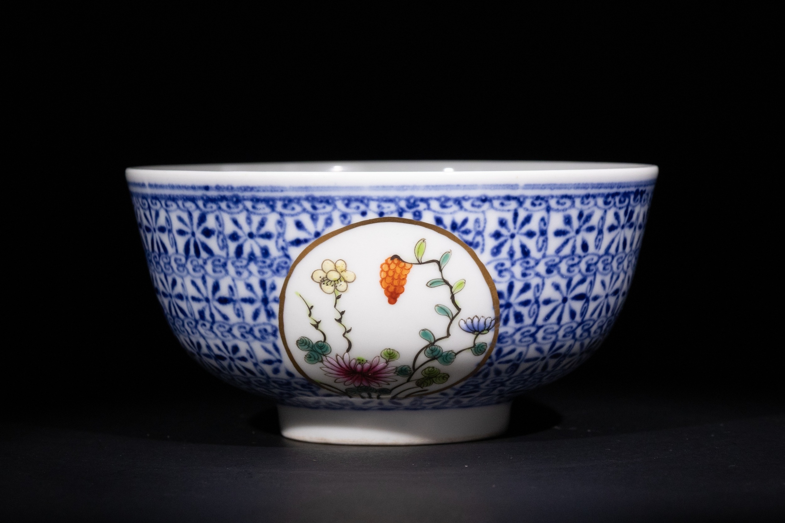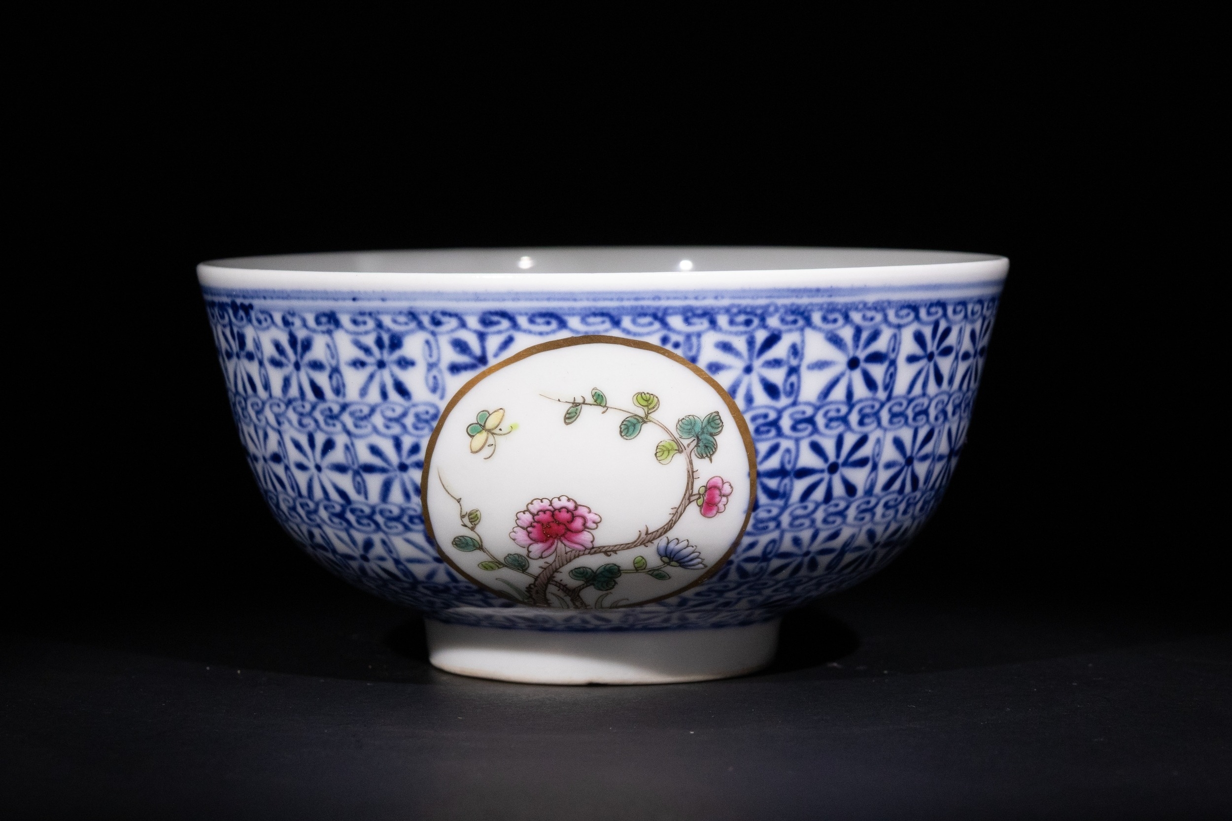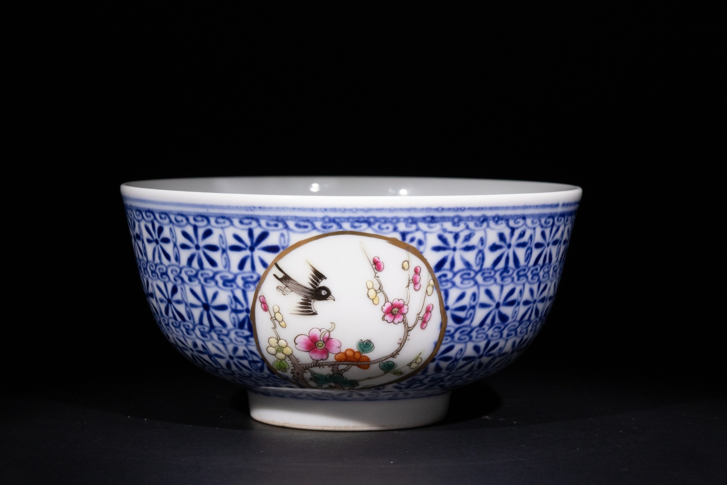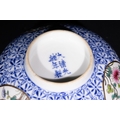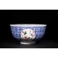 A finely crafted Chinese porcelain bowl featuring an intricate blue and white geometric pattern across the body. The exterior is adorned with circular medallions, each delicately painted with floral motifs and birds in vibrant polychrome enamels. The base bears a six-character mark, possibly indicating the period or origin of the piece.