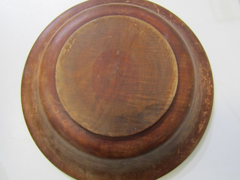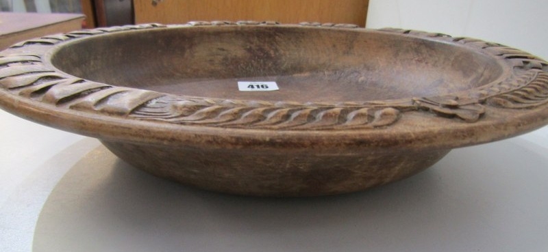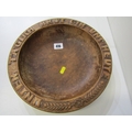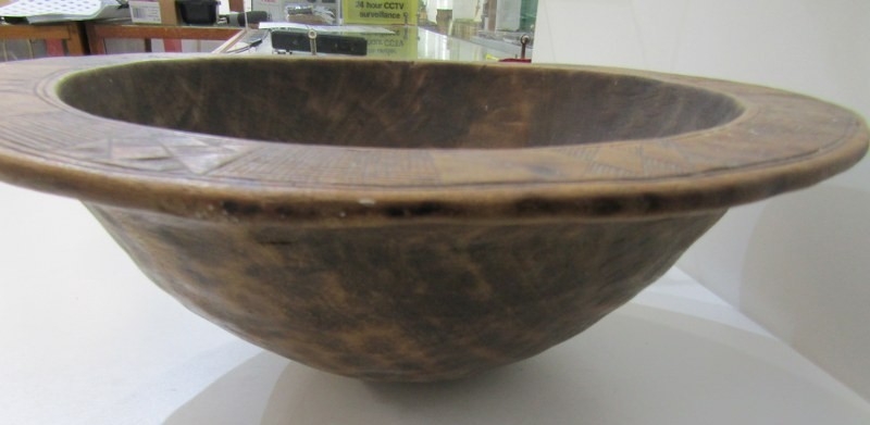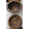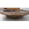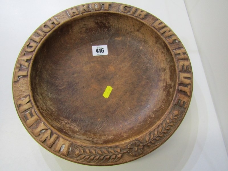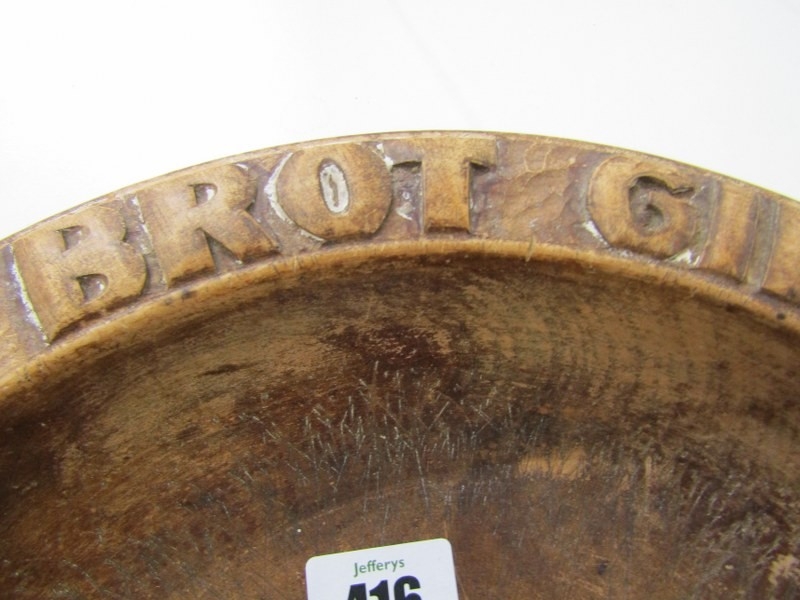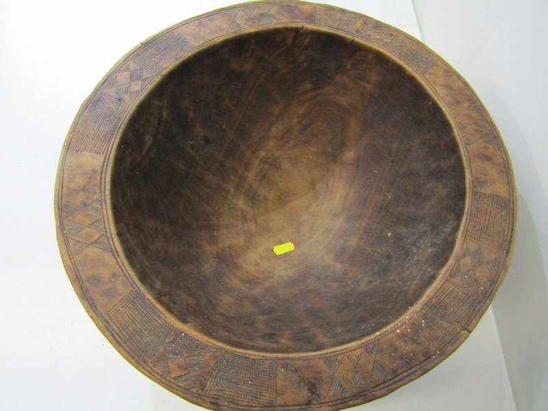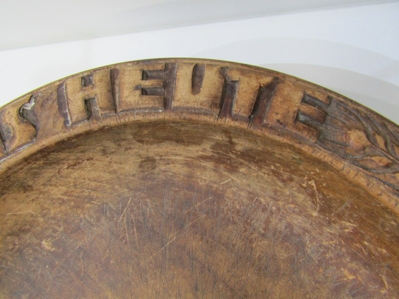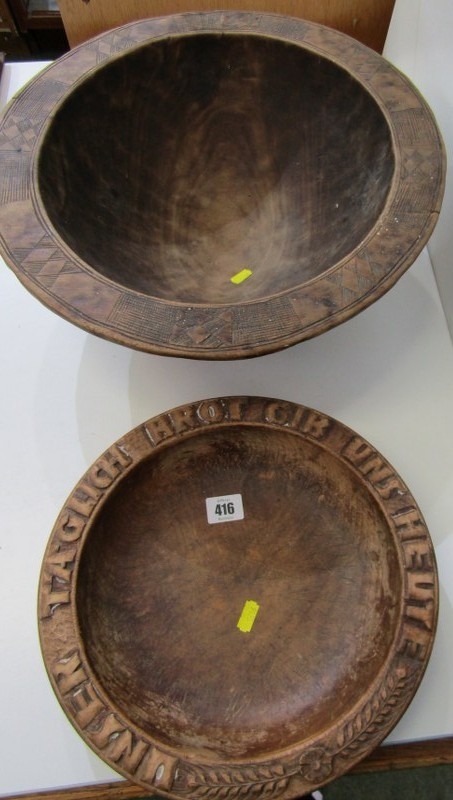 GERMAN BREAD BOWL, a vintage wooden German bread bowl with inscription and wheat sheaf decoration, 30.5cm diameter, together with a vintage African "Tuareg" Saharan wooden bowl, 39cm diameter, by 15cm height