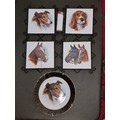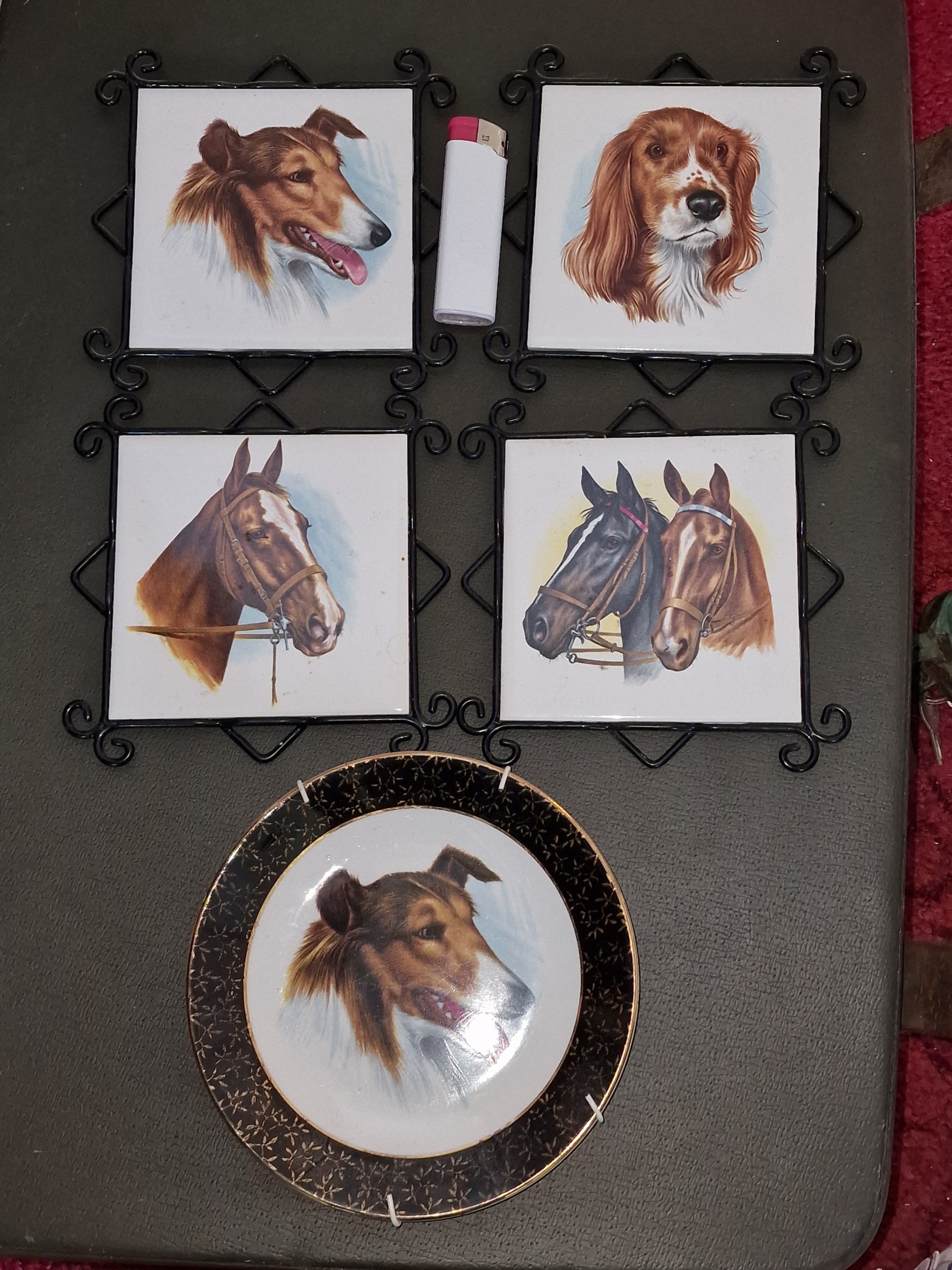 6" diameter Liverpool Road Pottery dogs head cabinet plate and 2 x iron mounted dogs head and 2 x horses head picture tiles