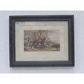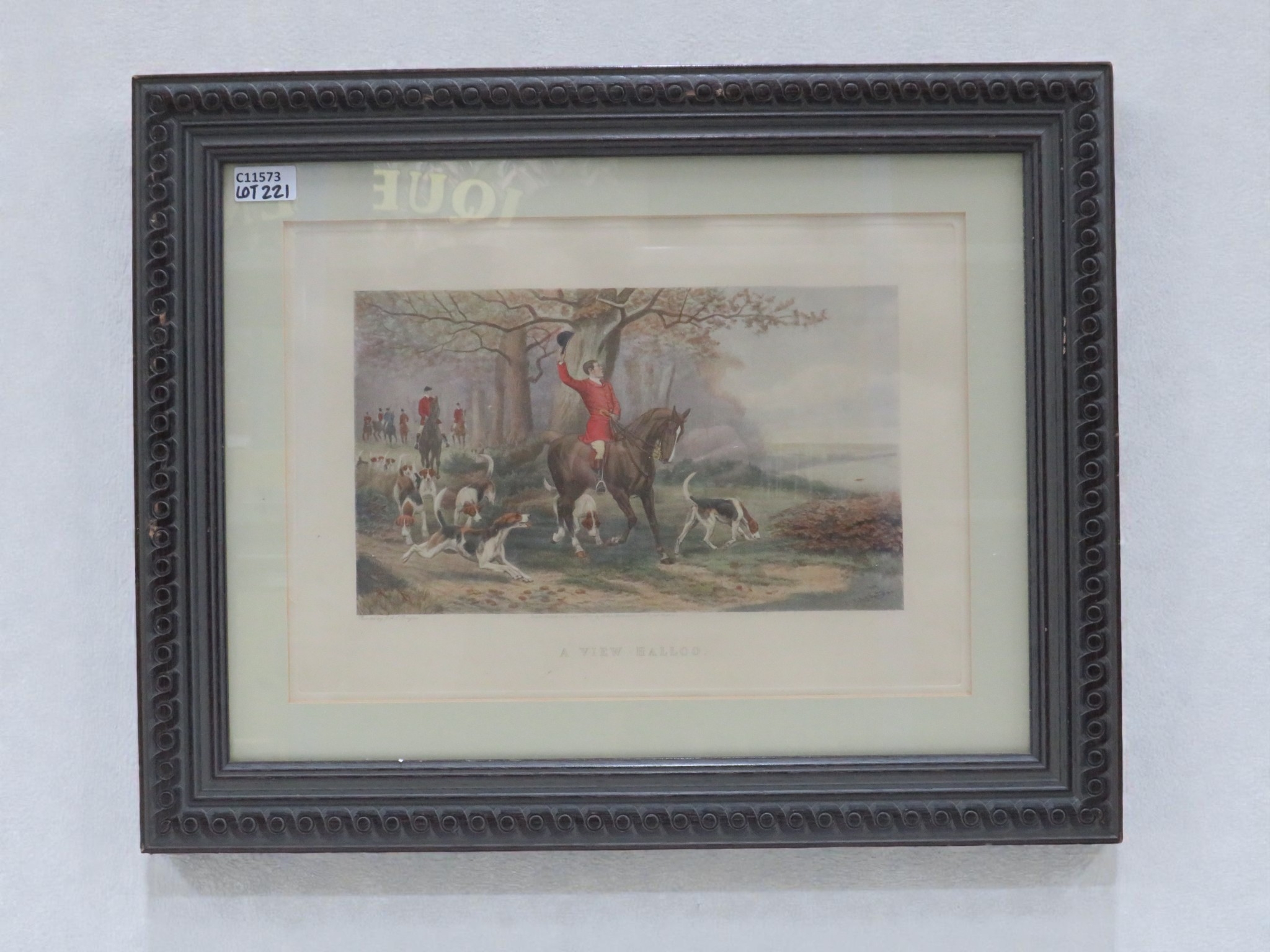 Framed hunting print depicting mounted hunt with hounds in decorative black frame